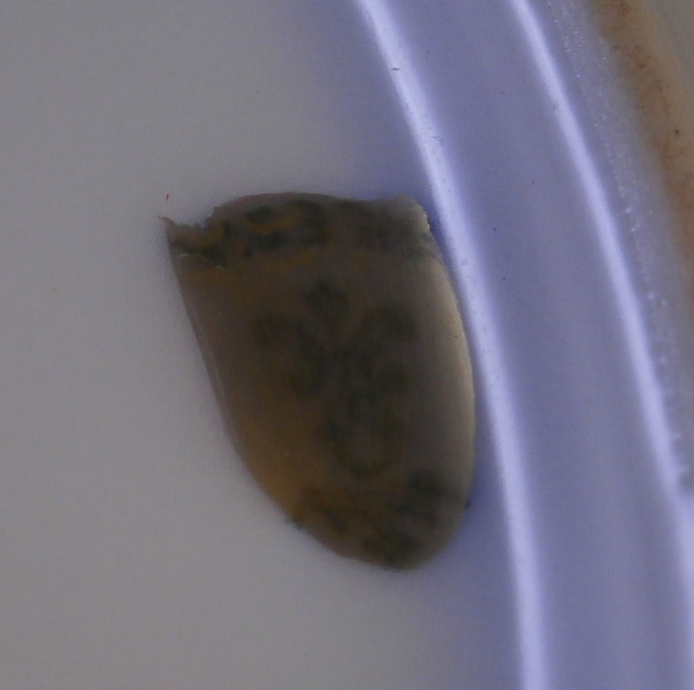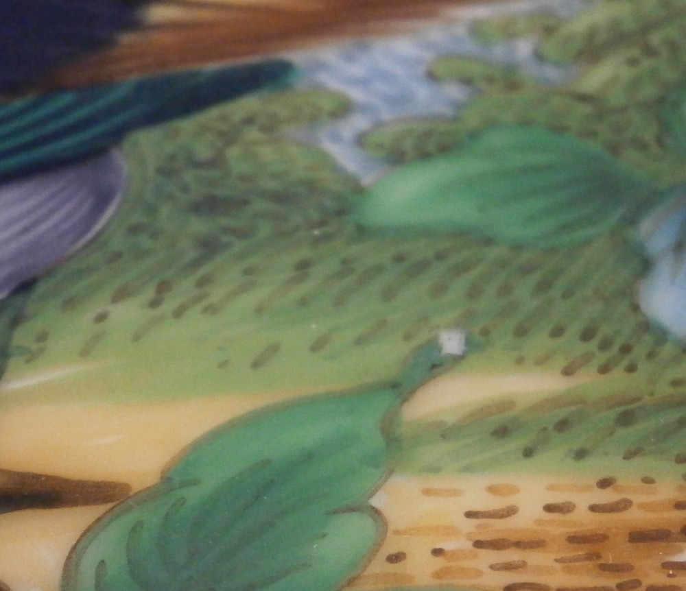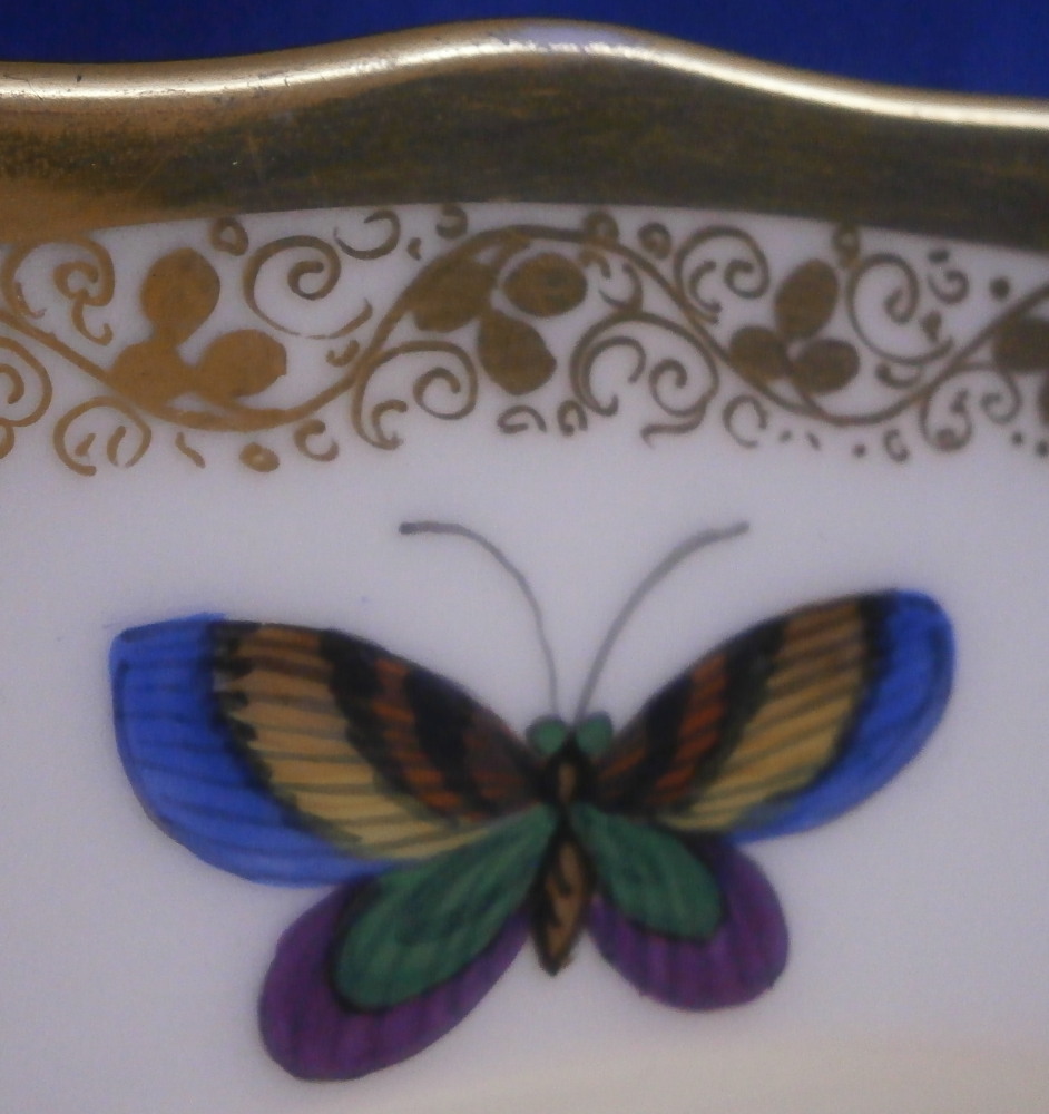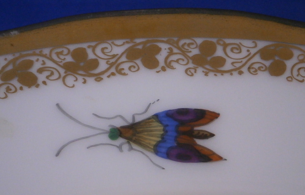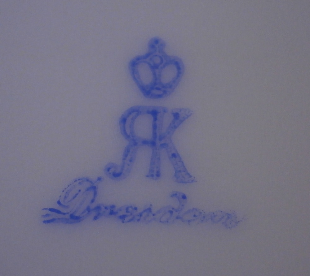 This is a rare dinner plate made by Richard Klemm between 1888 and 1916. It is hand painted with a scene including birds of paradise in a landscape surrounding as well as insects around the rim and a nice gold trim. We have collected this pattern for many years and have been told that the painter who painted this pattern on both RK marked pieces and crossed swords marked pieces was a Hausmaler trained at Meissen. The plate is in great condition with some wear to the gold band around the edge and a tiny paint flake to the tip of a green leaf as shown. The plate is 1.375 inches tall and 9.625 inches in diameter. It's marked underneath with the RK under a crown mark with the word Dresden underneath. There is also a gold mark hiding the mark of the manufacturer of the blank plate underneath. I think it is for Hermann Ohme from the SIlesia region. Please email me for more information or other pictures.