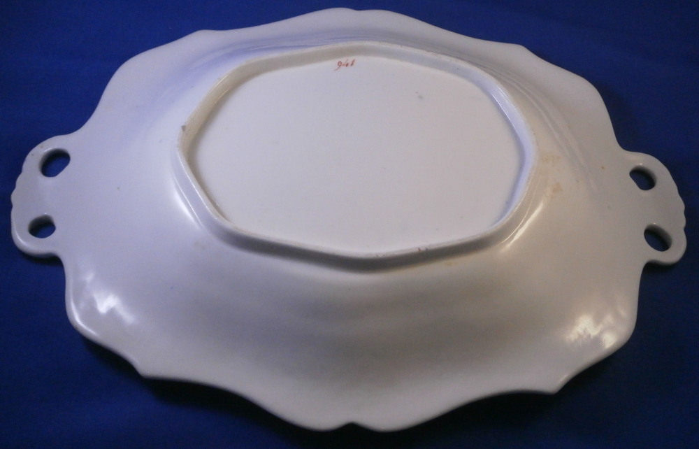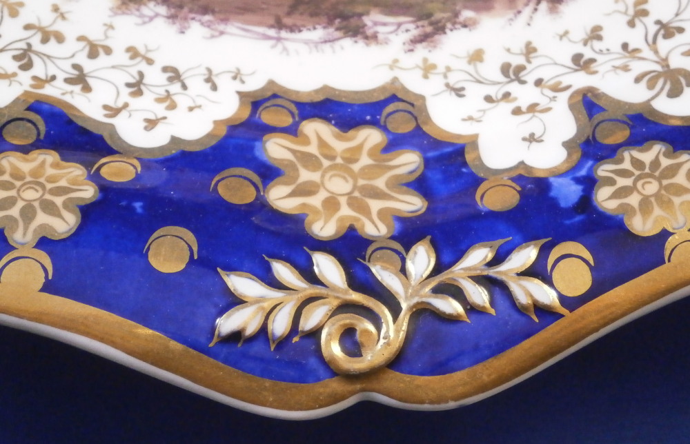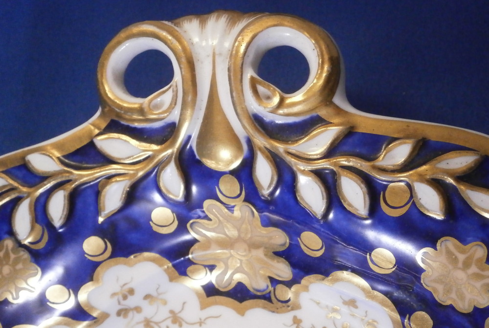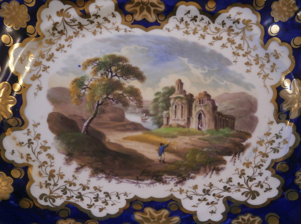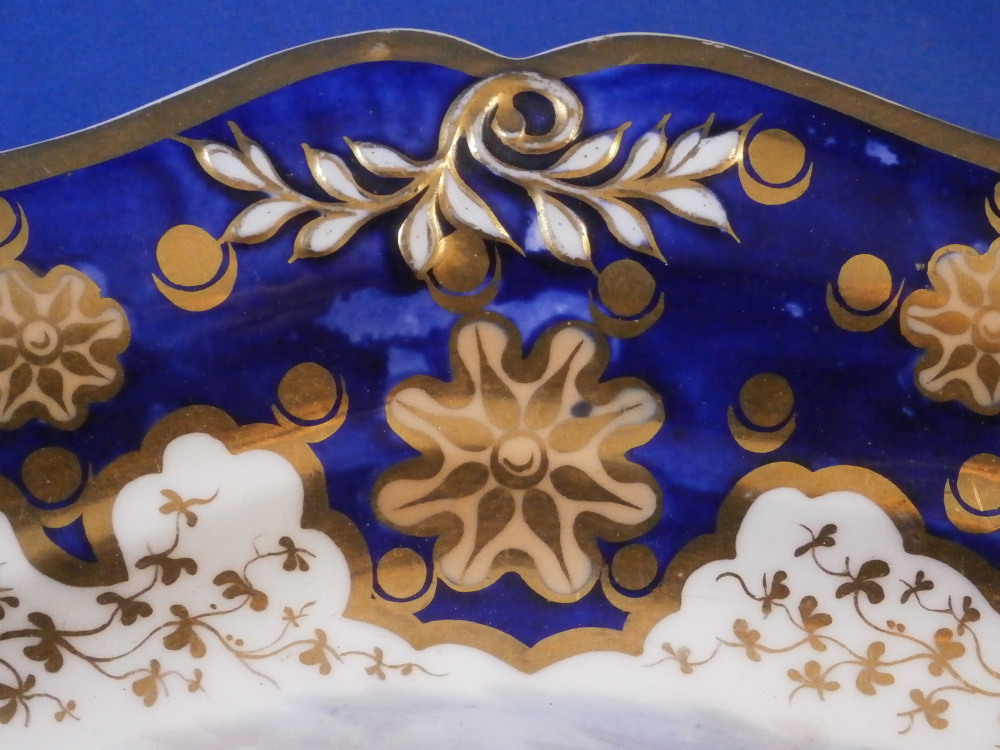 This is a nice Bone China serving dish made in England by Job Ridgway of the Cauldon Place China Works in the early 19th century around 1810. A nicely shaped dish with a handle to each side with two relief sprigs coming off them. The center has a nicely hand painted scene to it including a gentleman near an old building with another person in the entrance way with a boat on a waterway nearby all in a landscape surrounding. The scene is surrounding by a gold sprig design with the rim having a mazarine blue ground color to it with some nice designs to it. The edge has a nice shape to it as well. A great looking dish that is in superb condition for its age! Just the tiniest of gold wear especially for English porcelain which wears quite easily. Some lighter areas to the blue ground but that is how it was made. One small firing crack near the one handle as shown from when it was made. As nice an example as they come! The piece is unmarked except for the pattern number 941 in red as well as a number 1 on the foot ring as shown. A truly great example by this maker! The plate is 11.5 inches wide, 8.75 inches deep and 1.875 inches tall. Please email me for more information or other pictures.