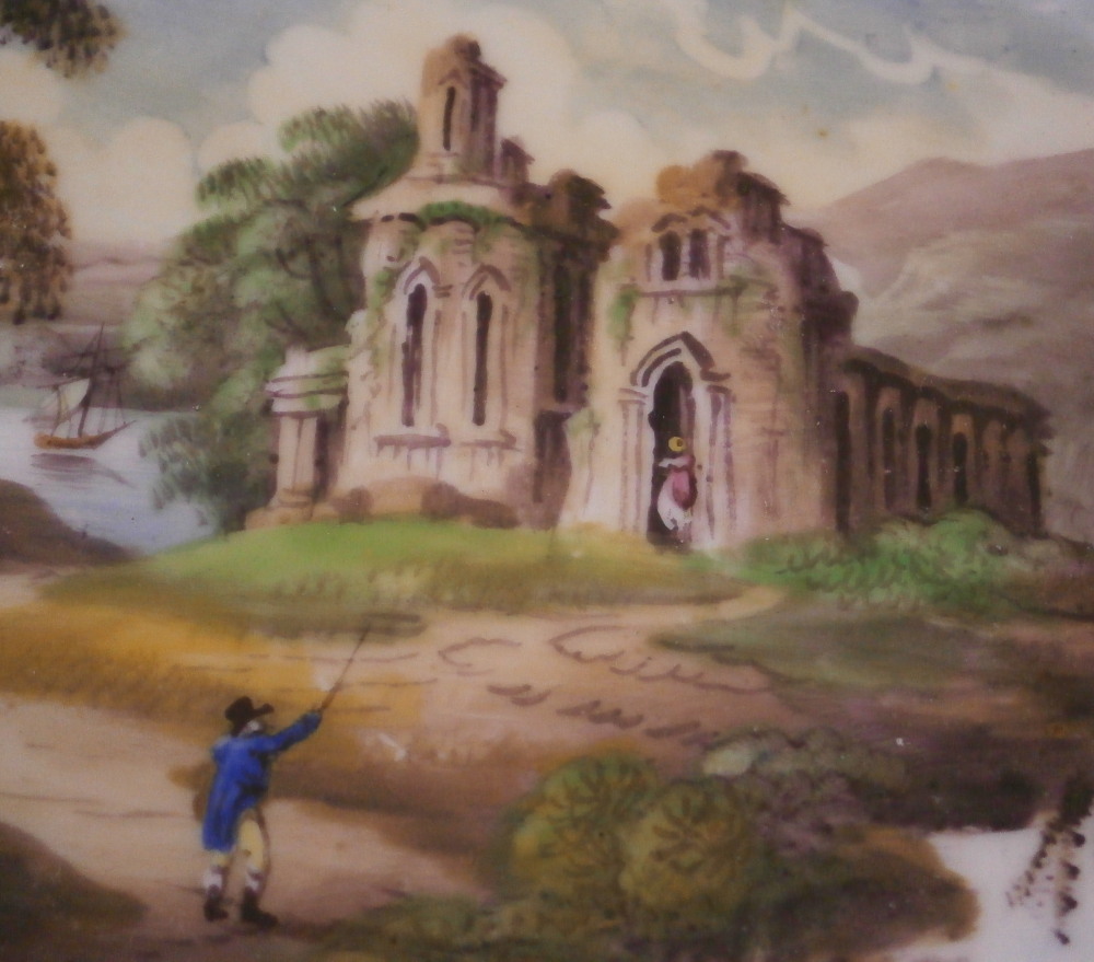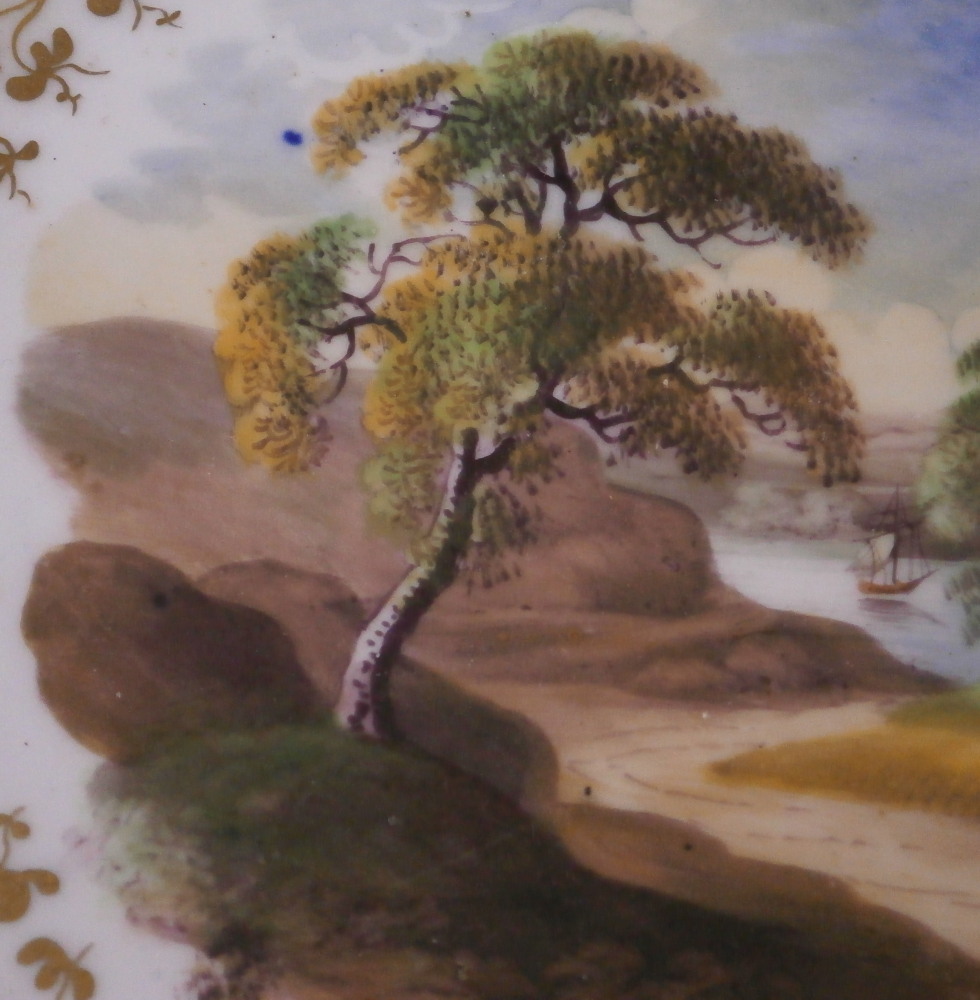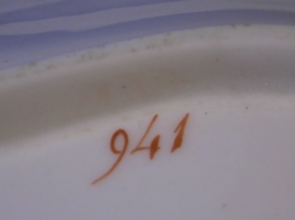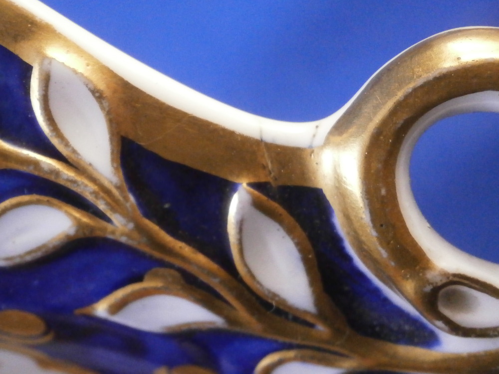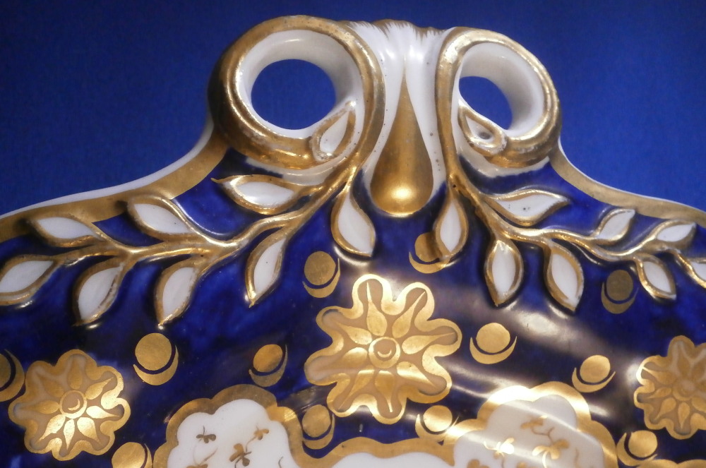 This is a nice Bone China serving dish made in England by Job Ridgway of the Cauldon Place China Works in the early 19th century around 1810. A nicely shaped dish with a handle to each side with two relief sprigs coming off them. The center has a nicely hand painted scene to it including a gentleman near an old building with another person in the entrance way with a boat on a waterway nearby all in a landscape surrounding. The scene is surrounding by a gold sprig design with the rim having a mazarine blue ground color to it with some nice designs to it. The edge has a nice shape to it as well. A great looking dish that is in superb condition for its age! Just the tiniest of gold wear especially for English porcelain which wears quite easily. Some lighter areas to the blue ground but that is how it was made. One small firing crack near the one handle as shown from when it was made. As nice an example as they come! The piece is unmarked except for the pattern number 941 in red as well as a number 1 on the foot ring as shown. A truly great example by this maker! The plate is 11.5 inches wide, 8.75 inches deep and 1.875 inches tall. Please email me for more information or other pictures.