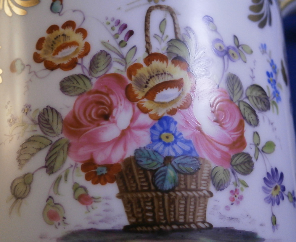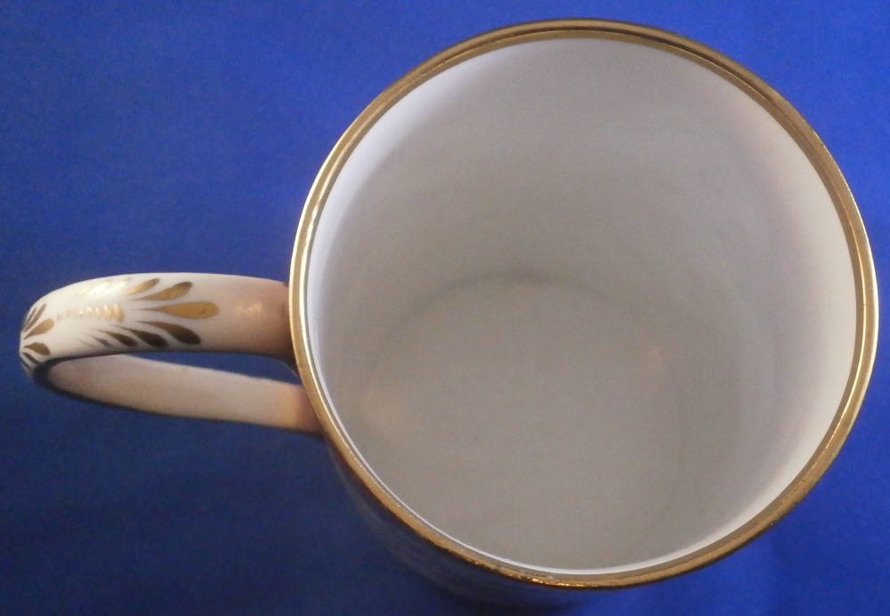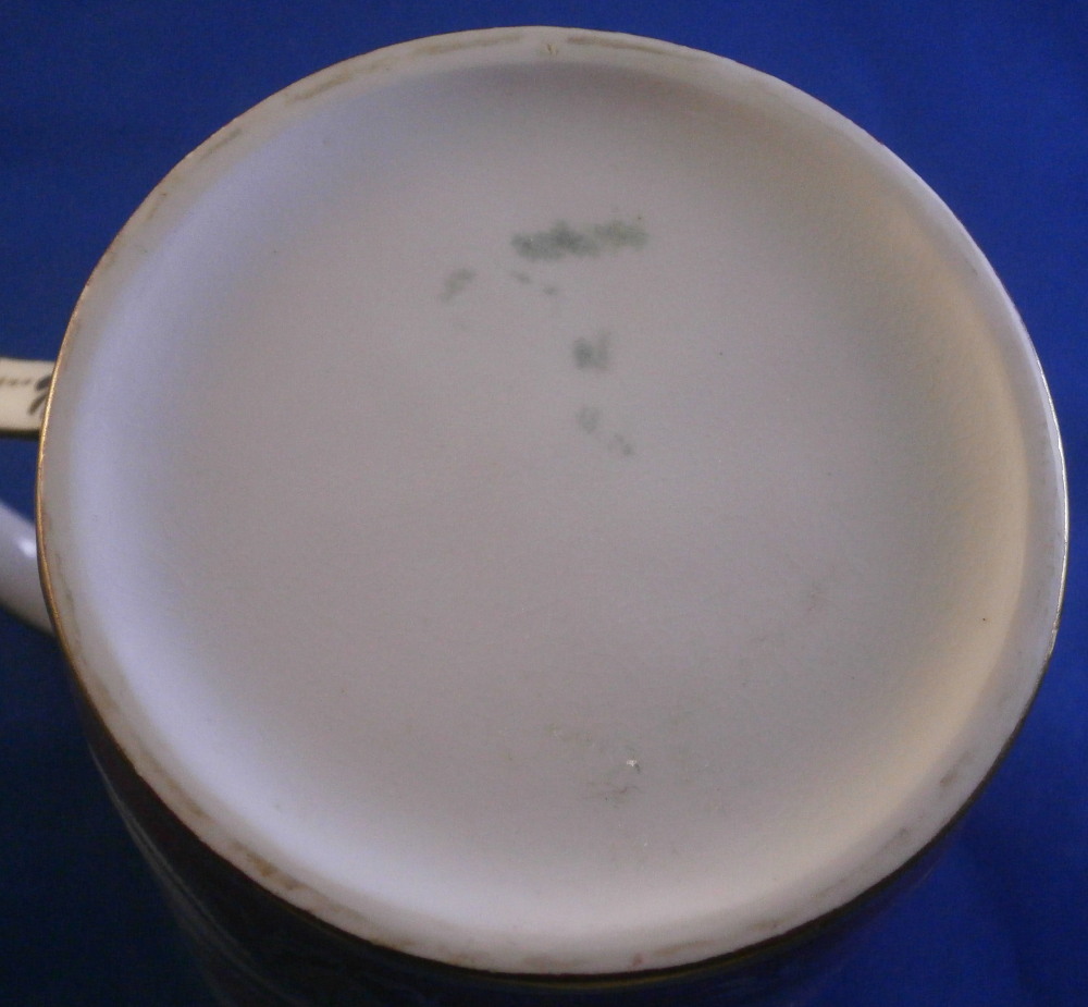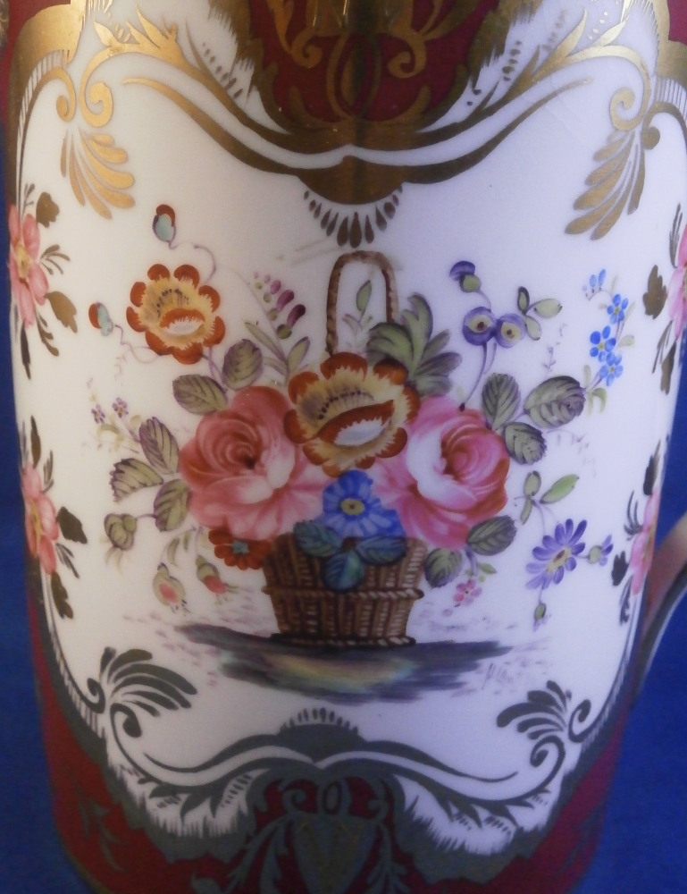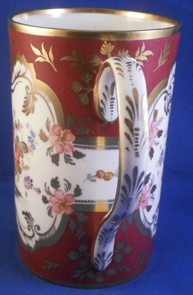 This is a nice large tankard / mug / cup made by Rockingham in the first half of the 19th century. It is decorated with a superb reddish ground color with lots of nice gilding over that some of which has raised elements to it. The bes part however are those two panels with a hand painted floral scene on white ground including a bassket filled with flwoers surrounded by a fancy gold trim with four flower blossoms to the corners. A really well painted piece! Some more gold trim to the handle as well. As nice as they come and the piece is in superb condition with some of the usual fine crazing to the white areas. The gilding is still in amazing condition! A great looking piece of the perfect size to have your beer in :) The piece is not marked underneath except for some greenish smudges as shown. Not sure what that is all about. The tankard is 5.625 inches tall and 3.625 inches in diameter. Please email me for more information or other pictures.