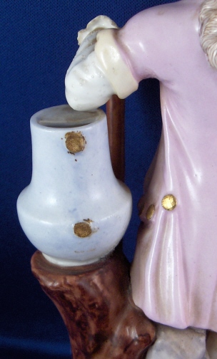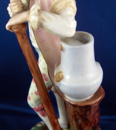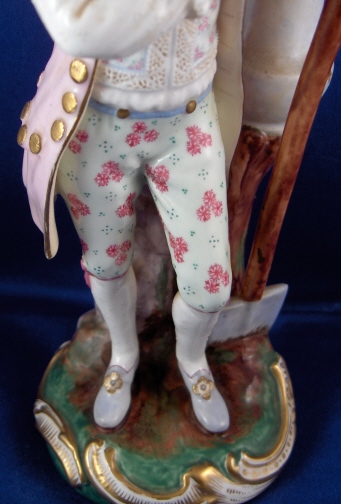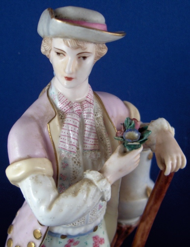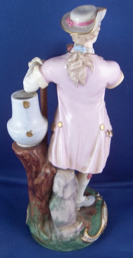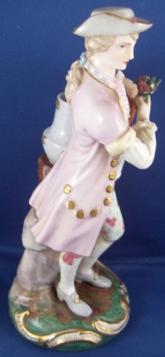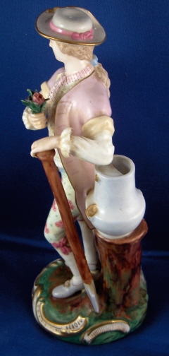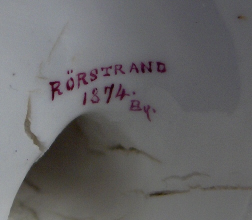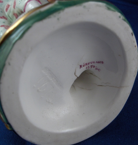 This is a rare figurine made by Roerstrand in 1874. It is of a gardener leaning on his shovel and watering can, holding some flowers in his right hand and looking a bit over dressed for the occasion :) Nicely modeled and handpainted and I cannot find any other figurines like it from this period. The figurine is marked twice underneath once with the impressed Rorstrand mark as well as the incised year 1873 which is when the blank was made and then the puce Roerstrand mark with the year 1874 which is when it was painted and the artist initials By. The figurine displays very nicely but the watering can has lost its handle and spout, he has a little chip to his hat which is not very obvious, two of the flower leaves are chipped and the ruffles on his sleeve are a bit damaged as well which is normal due to the extremely fragile nature of them. The figure is 8 inches tall, 3 inches wide and 3.125 inches deep. Please email me for more information or other pictures.