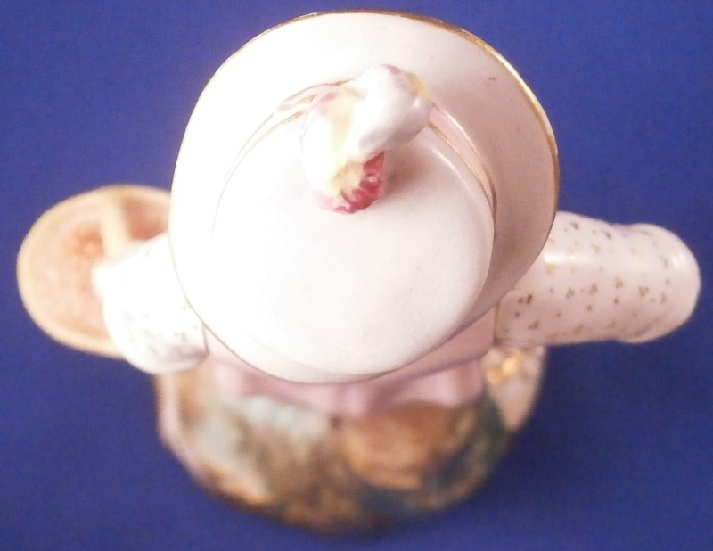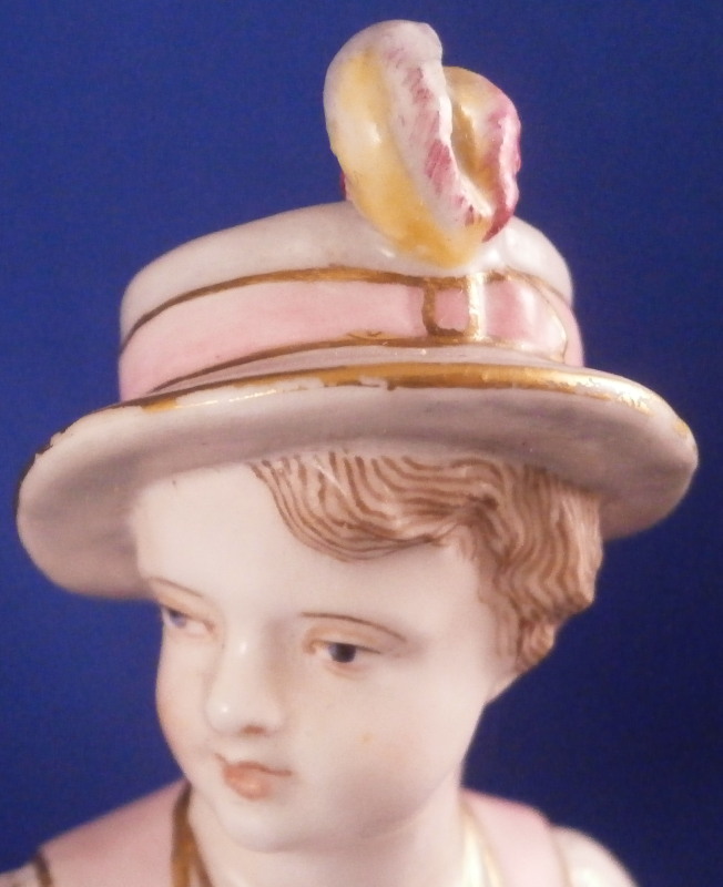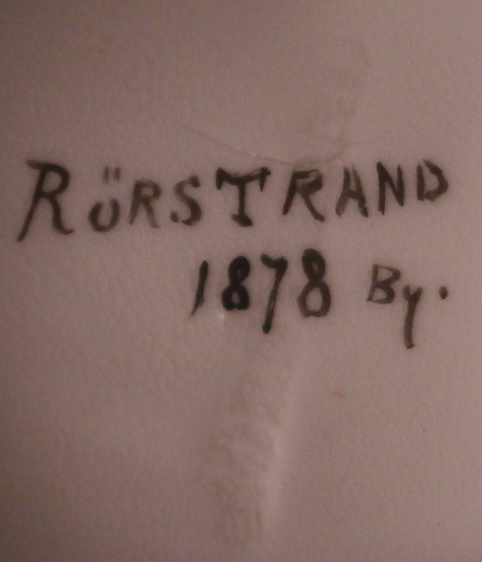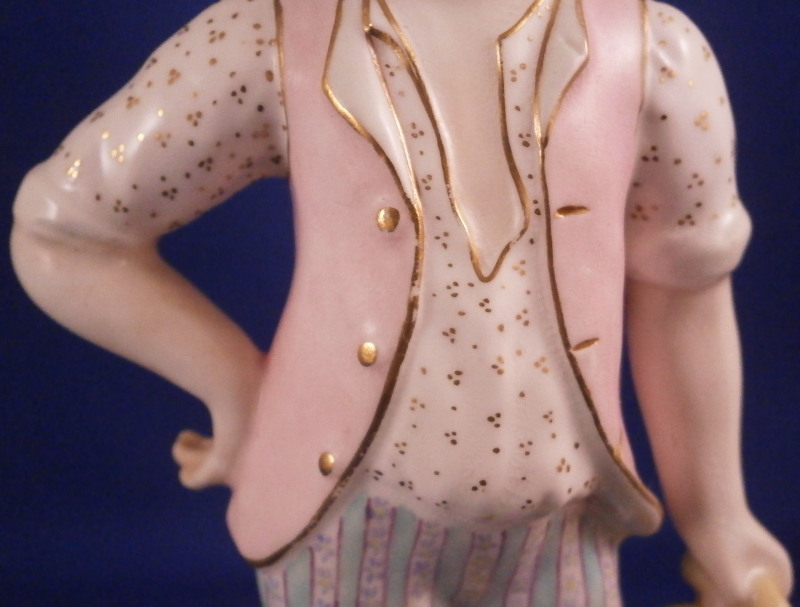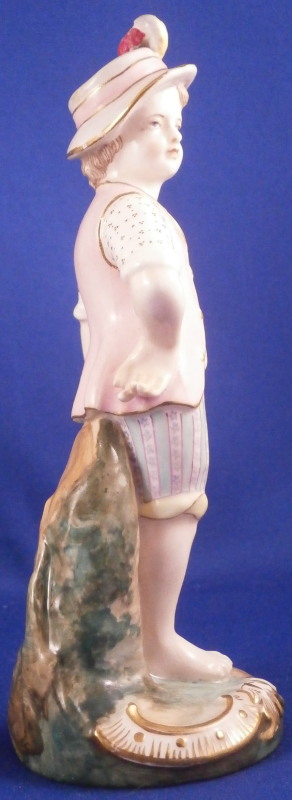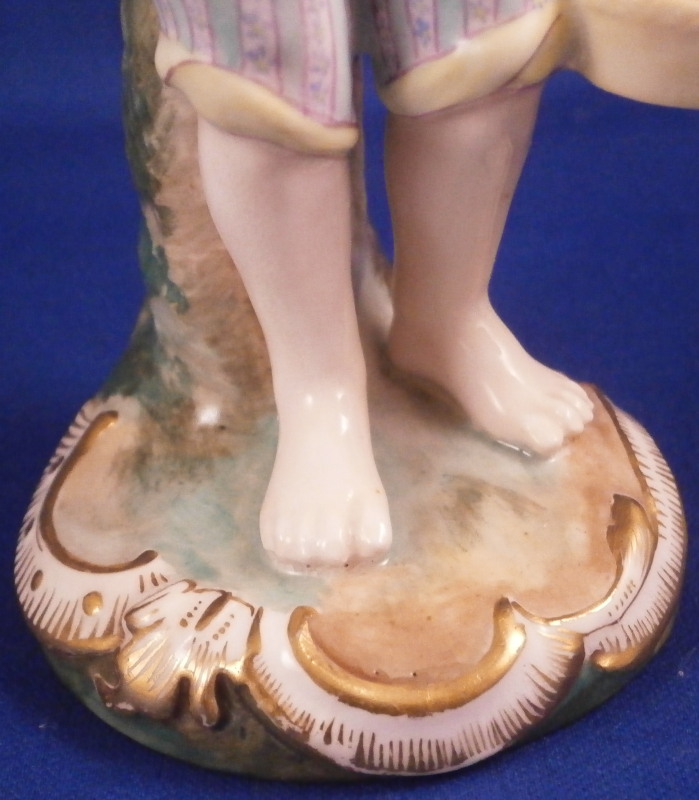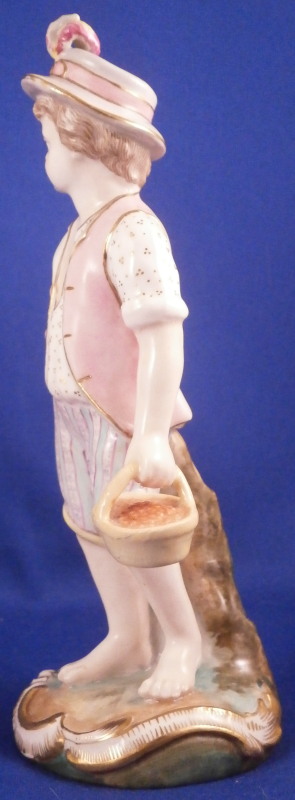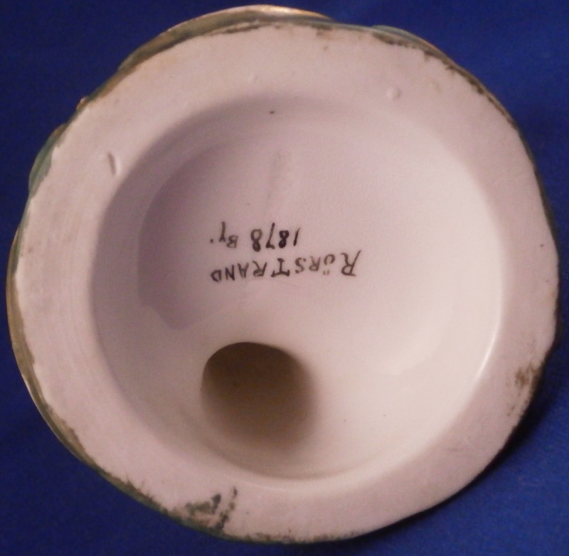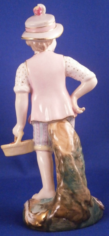 This is a rare figurine made by Roerstrand in 1878. Only the second piece like it by them I have seen and I own them both. It is of a young gentleman or boy holding a basket in one hand. Dressed quite nicely with a hat with feathers on top. Nicely modeled and hand painted. The figurine is marked twice underneath once with the impressed Rorstrand mark as well as the black Rörstrand mark with the year 1878 and the artist initials By. Same artist for both figures. The figurine is in perfect condition with a touch of wear to the gilding mostly around the edge of his hat. The figure is just under 6 inches tall, 2.75 inches wide and 2.25 inches deep. Please email me for more information or other pictures.