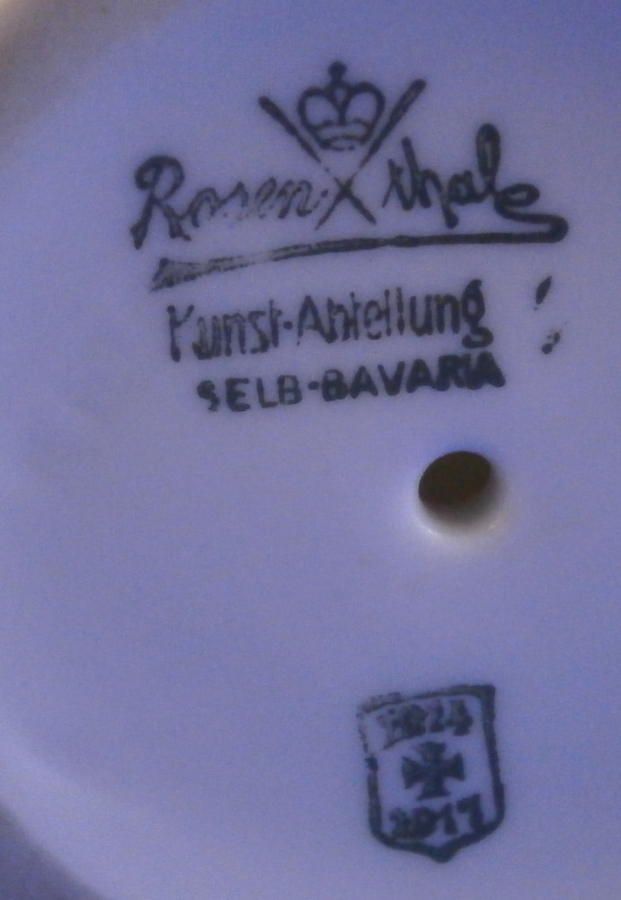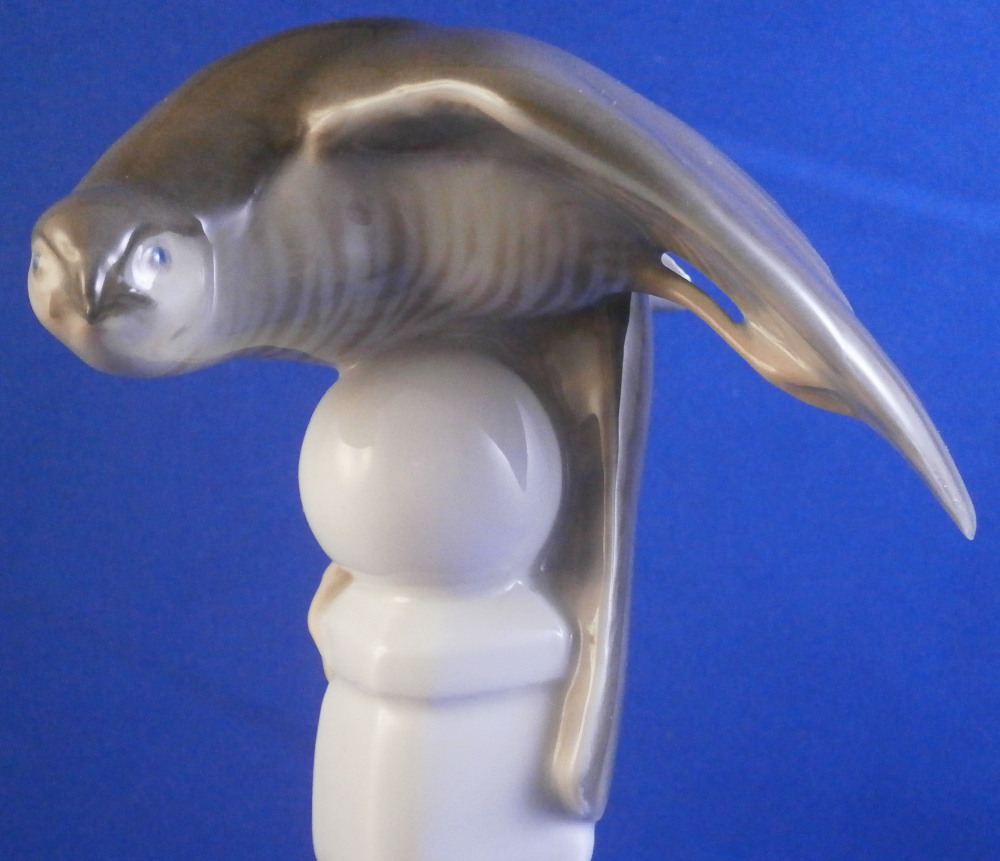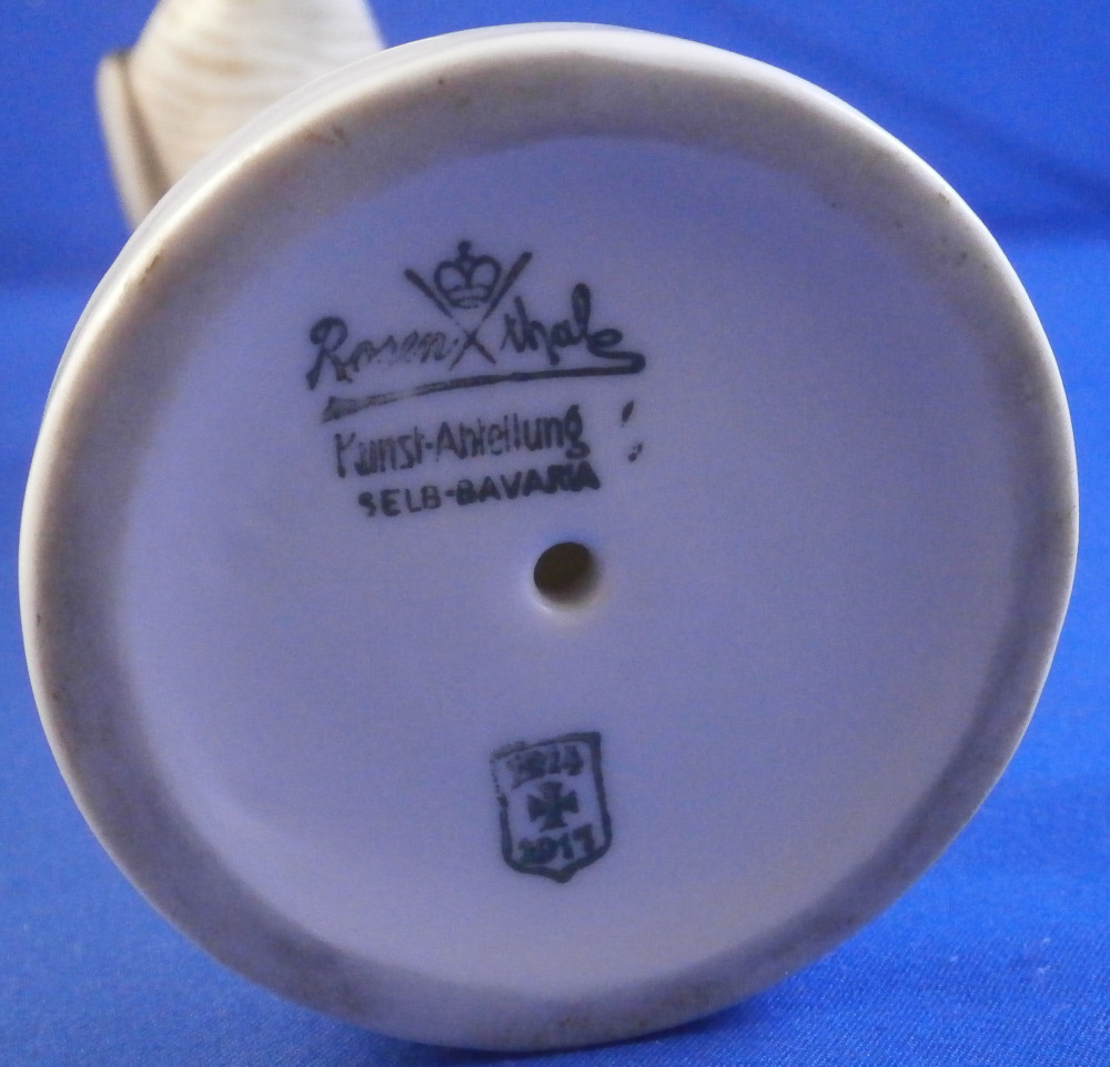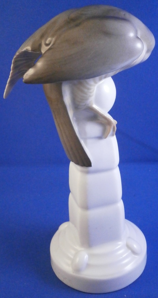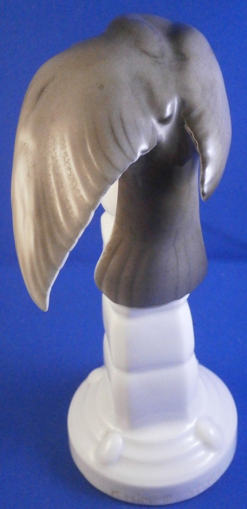 This is a porcelain bird figurine made by Rosenthal during WWI in 1917. It is of a Falcon on top of a column painted in the rare under glaze colors of the Art Nouveau / Jugenstil period. The bird has one wing stretched out and is looking down to spot it's next prey. A really well modeled piece that is hand painted perfectly. Originally modeled by Karl Himmelstoss during this period. The figure is in perfect condition and is marked underneath with the green Rosenthale mark with Kunst- Abteilung Selb-Bavaria under it as shown in the pictures and the WWI mark of the iron cross and the year marks 1914 and 1917. Lighlty impressed K106 and on the back of the base K. Himmelstoss in brown. The figurine is 6.5 inches tall, 2.75 inches wide and 3.25 inches deep. Please email me for more information or photos.