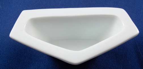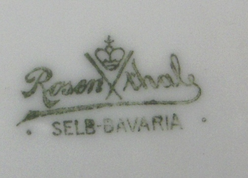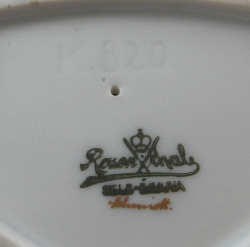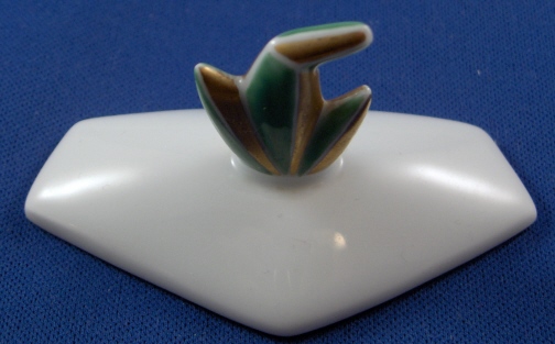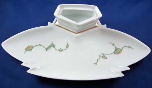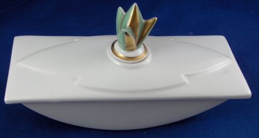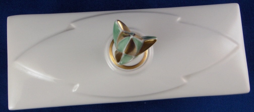 This is a nice inkwell with its matching blotter made by Rosenthal in the early 20th century. It is modeled in the Art Deco/Nouveau style of the period with a nice modern looking design in green and gold. The finial on the lid is my favorite part and reminds me of a cactus :) The handle on the blotter matches it nicely. The set is in perfect condition. The inkwell tray and underside of the blotter is marked underneath with the green Rosenthale mark with Selb-Bavaria underneath as shown in the pictures and an impressed K820 on the inkwell. There is also a gold signature Schmidt on the inkwell underneath which was the painter and the back of the base has the name H. Küster impressed who designed the piece. The blotter comes apart into three pieces with the handle being a porcelain screw that holds it all together - quite neat! The entire inkwell set is about 3.625 inches tall, 10.375 inches wide and 5 inches deep. The blotter is 2.875 inches tall, 5.25 inches long and 2 inches wide. Please email me for more information or photos.