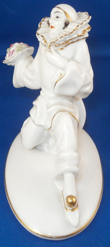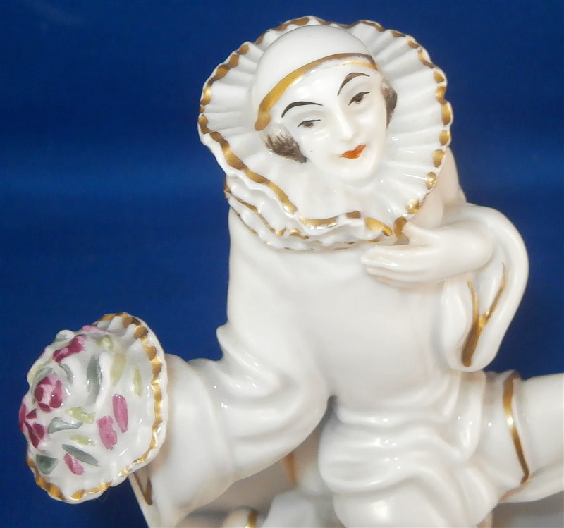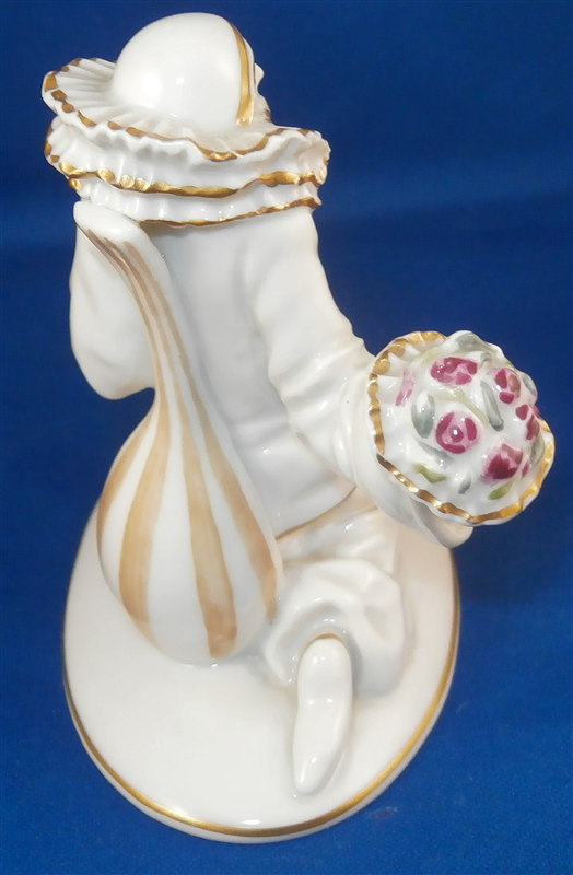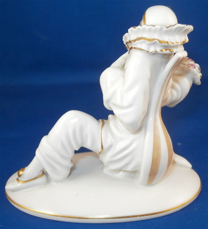 This is a superb figurine made by Rosenthal in about 1921. THe figure is of a kneeling female pierrot that is holding a floral bouquet in her right hand, her left hand over her heart and her mandolin behind her. Originally designed by Holzer Defanti during this period. The figurine is in perfect condition with minor gold wear. It is marked underneath with the green Rosenthal mark with Bavaria underneath as shown in the pictures and the impressed C-Holzer and model number 49 as well. A very early piece by a famous designer. The figurine is about 3.5 inches tall, 2.25 inches wide and 4.125 inches long. Please email me for more information or photos.