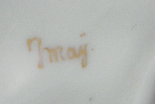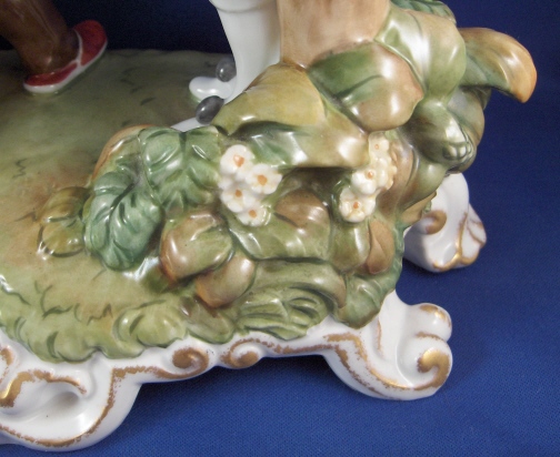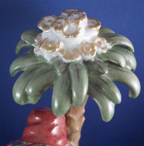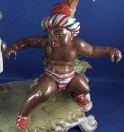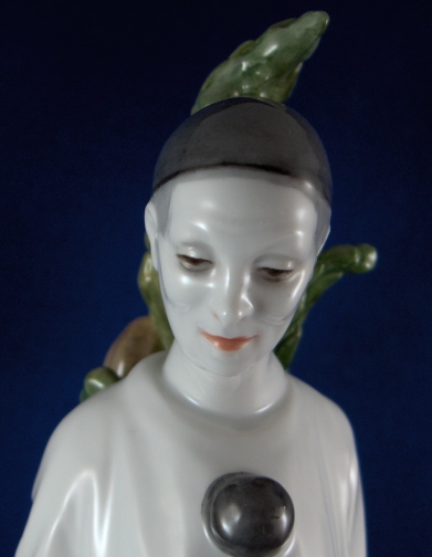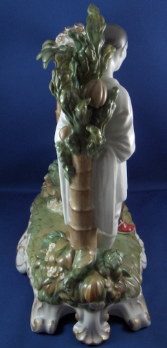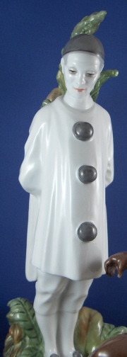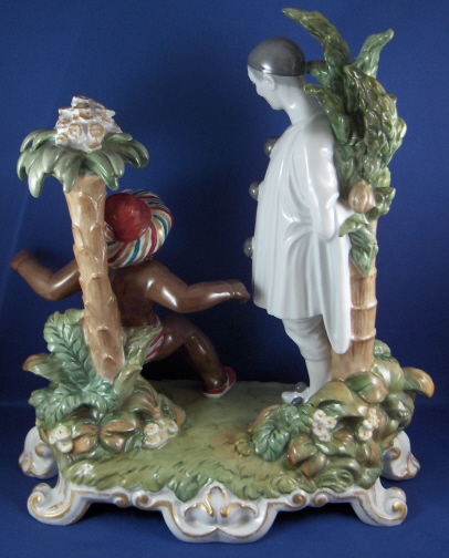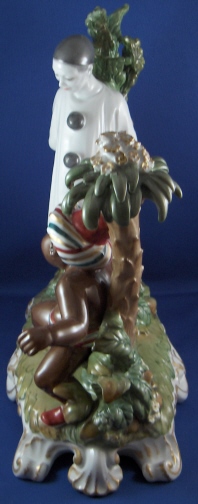 This is a very rare porcelain figurine made by Rosenthal in about 1920. I could actually not find another model anywhere so after doing some more research I found out some interesting facts: It was designed by Otto Tauschek in 1923, is model # 690 and titled "Zwei Seltsame" (Two Strange Ones). It's described as "Pierrot and Man with Turban" and illustrated only as a line drawing in the books by Emmy Niecol. No book has a picture of it so it is certainly a rare piece! The signature in gold "JMay", is of the painter Jakob May who was one of Rosenthal's finest painters. The figurine is of a pierrot standing by some kind of tree with a blackamoor in front of him under a palm tree. A rare combination and really nice with the way the base was done. A pleasure to view from all sides! The figurine is superbly modeled and handpainted and a real treat. There is an incised signature on top of the base between the two figures but I cannot make it out. Amazing even with all the fragile detail this figurine is in perfect condition! It is marked underneath with the green Rosenthal mark with Selb-Bavaria underneath as shown in the pictures and a painters signature that seems to be J. May . The figurine is about 11.25 inches tall, 10 inches wide and 5.5 inches deep. Please email me for more information or photos.