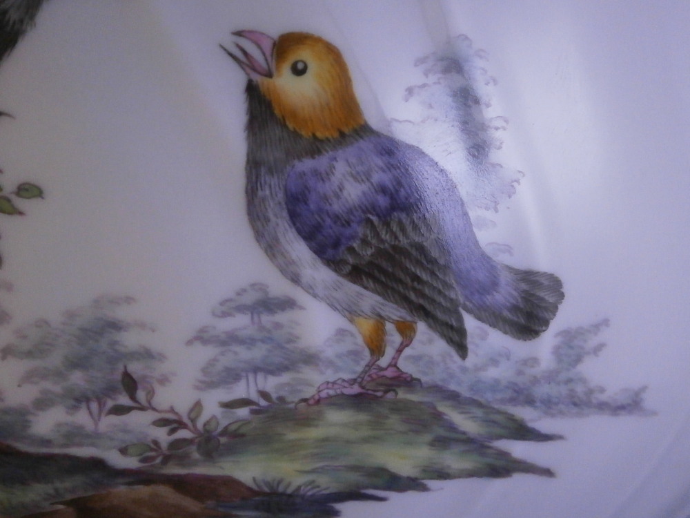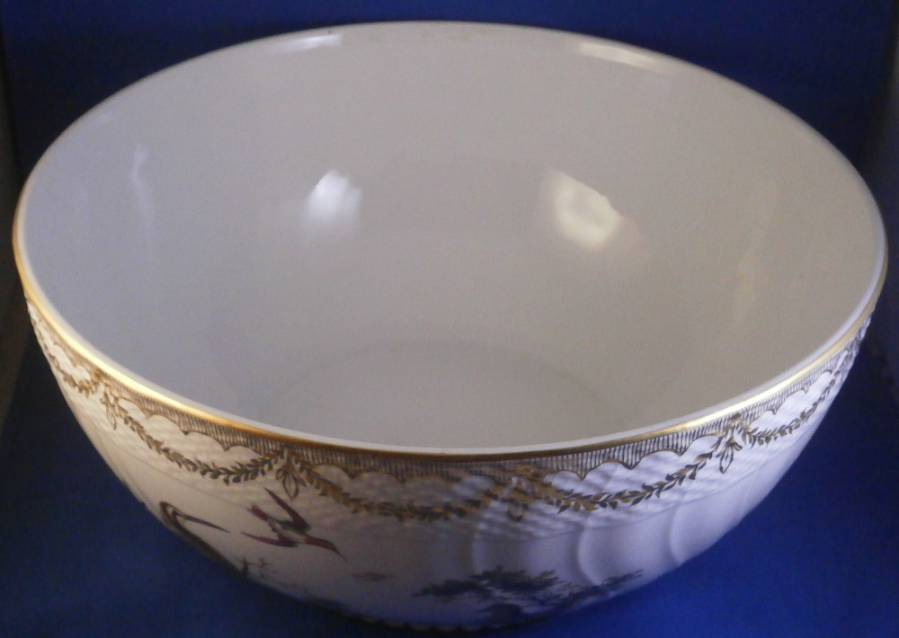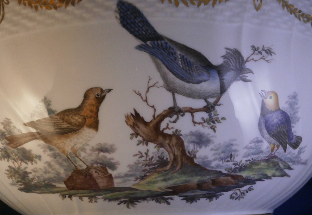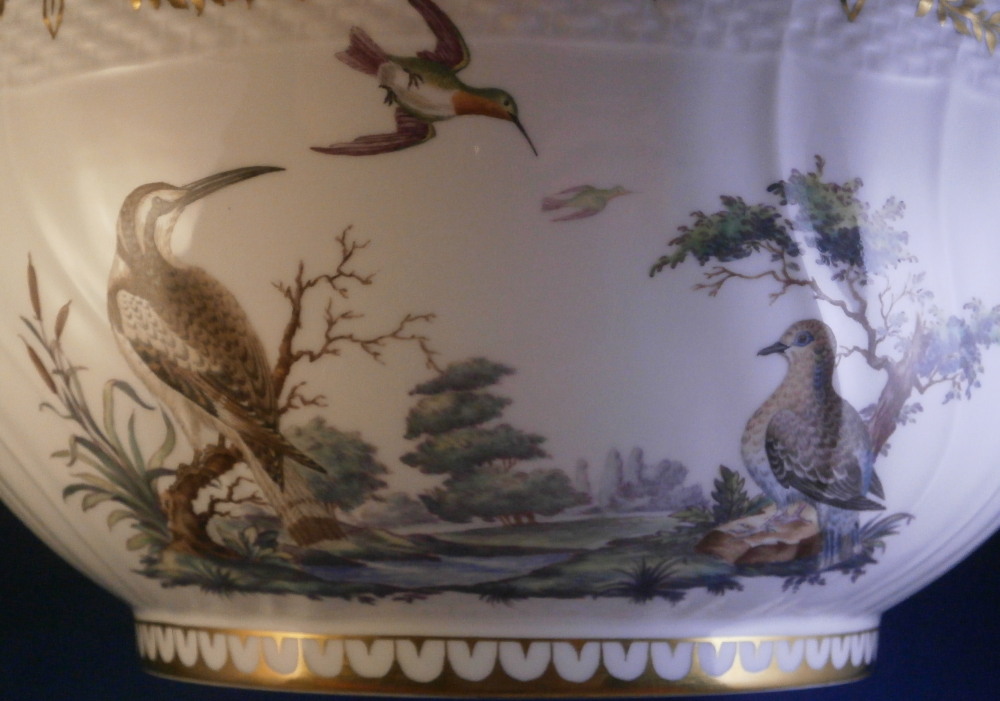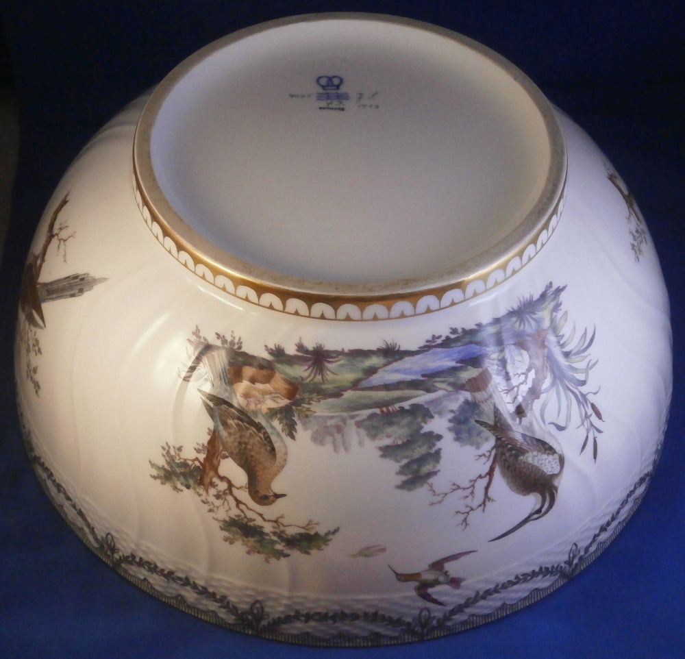 This is an amazing tureen made by Royal Copenhagen in the mid 20th century. Marked with the Julian Marie mark for using 18th century originals. I have never seen this design redone and it is on a huge piece! The tureen is round in shape and larger than any other I have ever owned. The edges have a basketweave design to the paste with a gold trim over that and another gold design along the foot of the bottom piece. The best part however are all those amazing hand painted bird scenes. The lid has four birds sitting on a branch with two of the scenes having a bird of a landscape to them. The superb finial is in the shape of a lemon with its stem and two leaves. The bottom piece has two large bird scenes in a landscape aurrounding as well as two single bird scenes to it. The larger scenes are amazing and have three birds in them. It does not come any better than this piece! The lid has a slot to fit a spoon handle as shown. Both pieces are marked with the three wavy blue lines mark in under glaze blue as well as the crown and Denmark with a line over the N. Also artist initials as well as the number 4065 and 1793 which is probably the year the design was originally made. The terrine is 11.5 inches tall including the lemon finial and 12.5 inches in diameter. This piece is incredible and it does not come better than this by this maker from this period. Please email me for more information or other pictures.