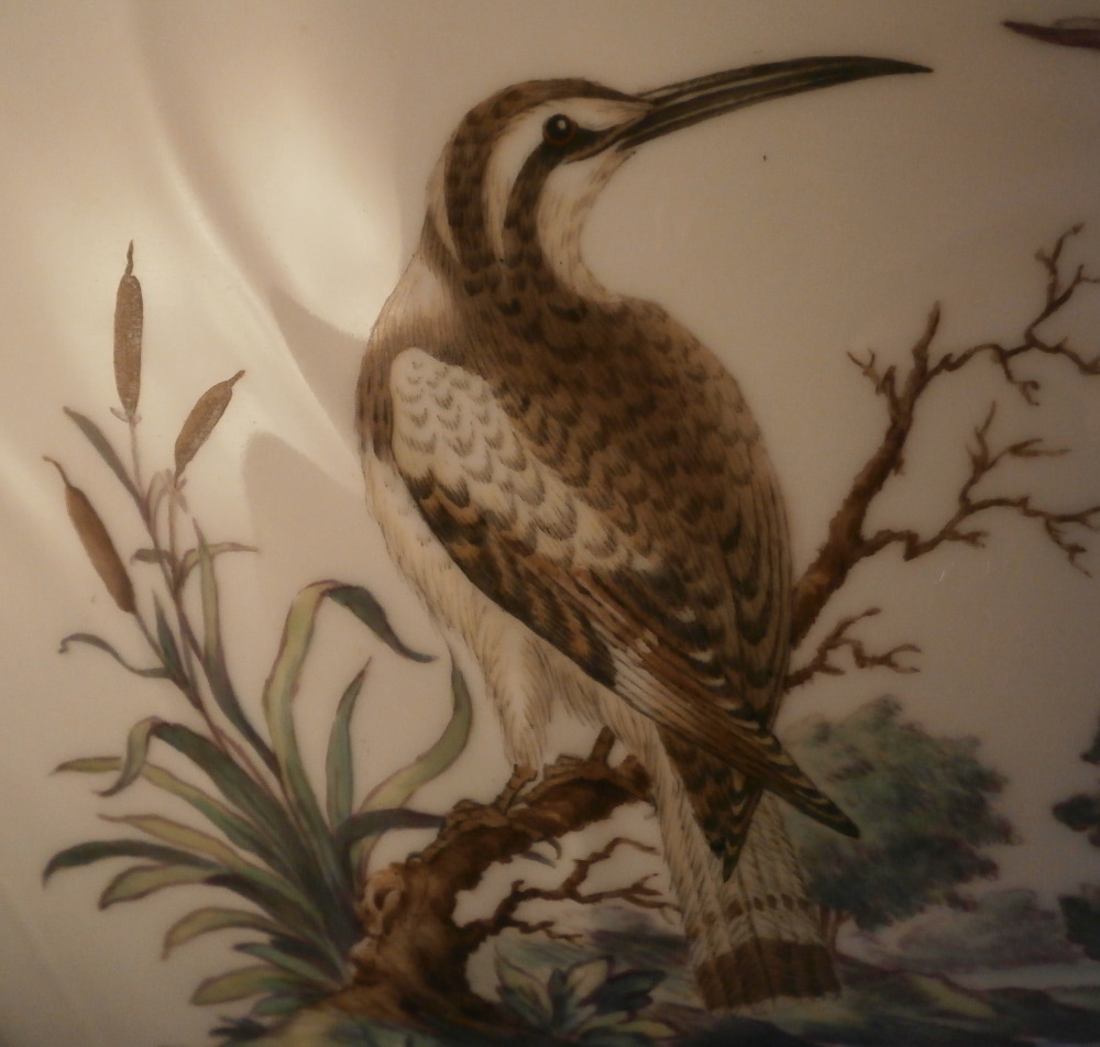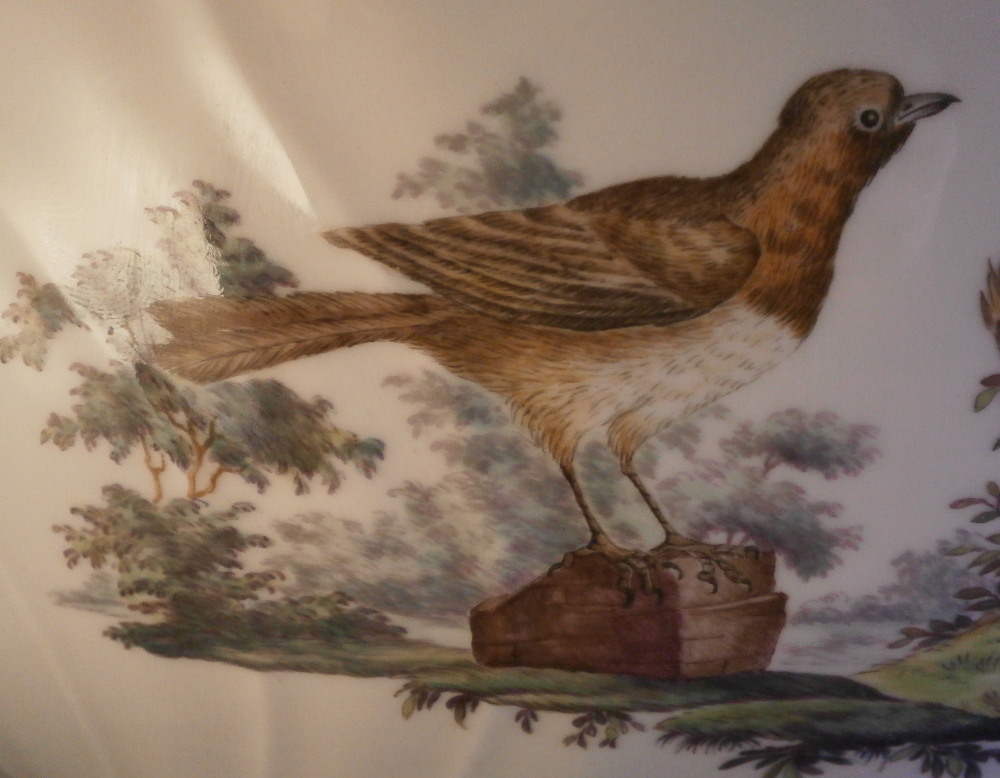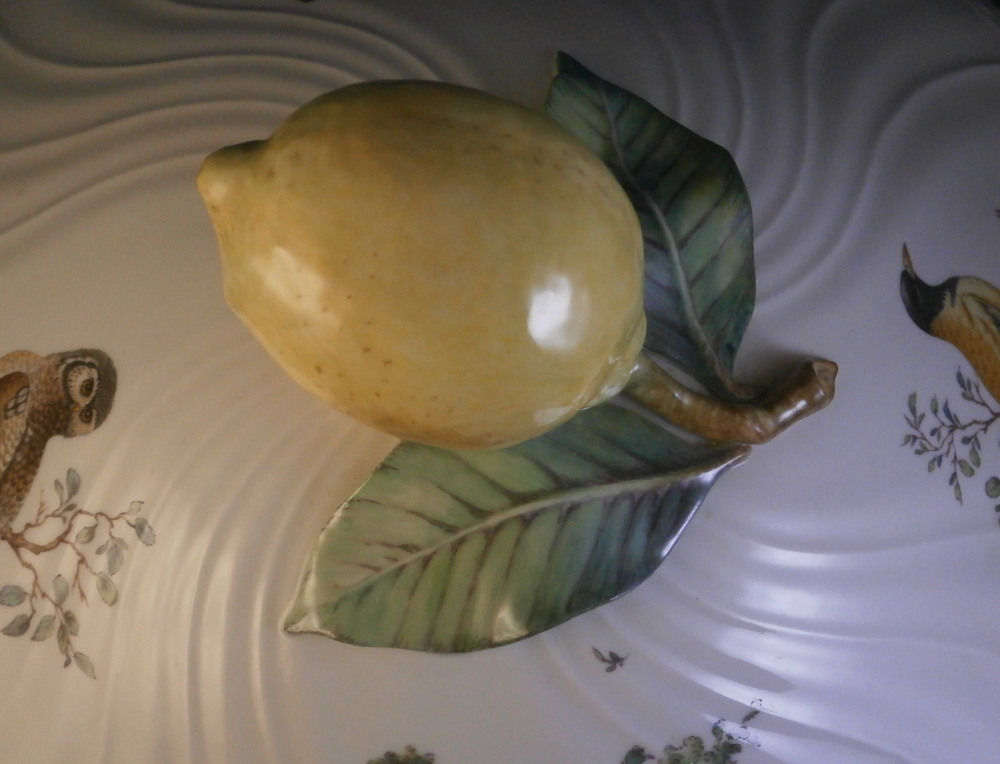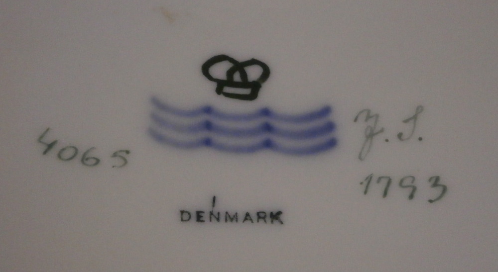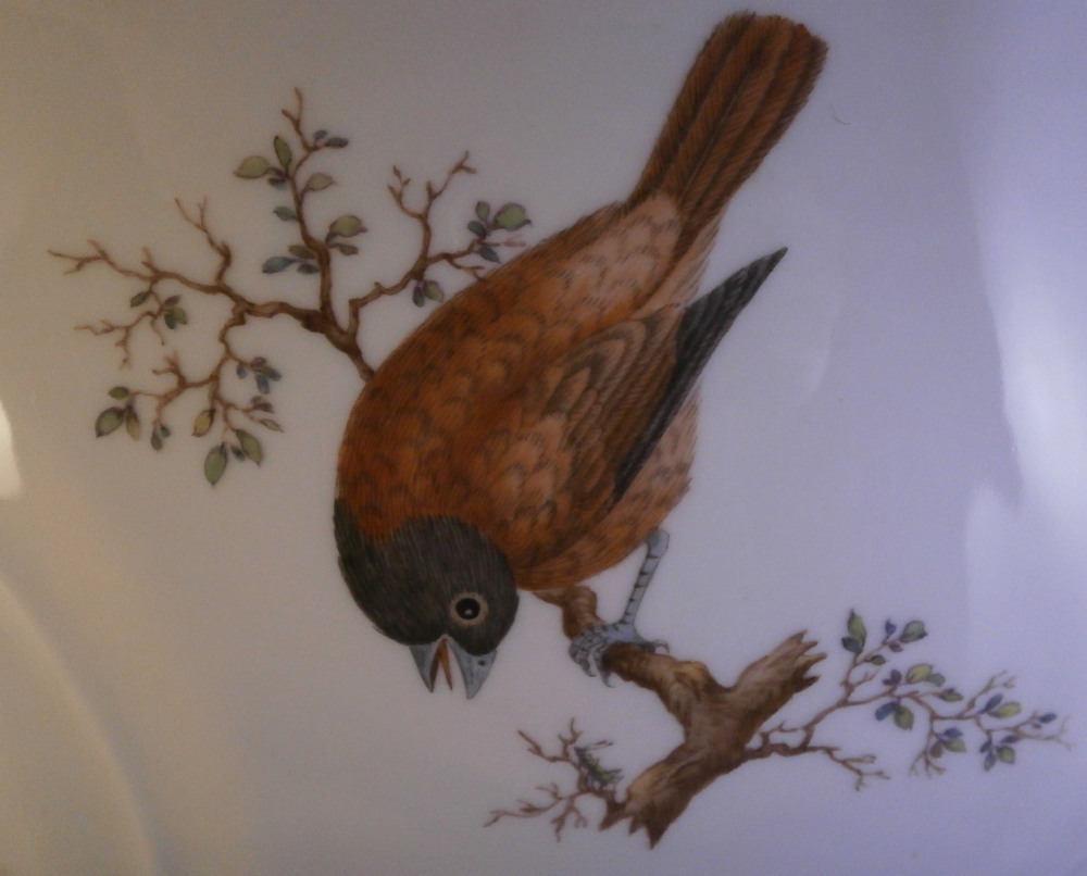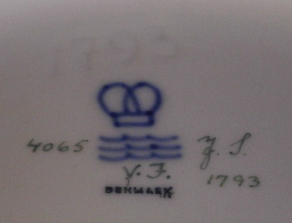 This is an amazing tureen made by Royal Copenhagen in the mid 20th century. Marked with the Julian Marie mark for using 18th century originals. I have never seen this design redone and it is on a huge piece! The tureen is round in shape and larger than any other I have ever owned. The edges have a basketweave design to the paste with a gold trim over that and another gold design along the foot of the bottom piece. The best part however are all those amazing hand painted bird scenes. The lid has four birds sitting on a branch with two of the scenes having a bird of a landscape to them. The superb finial is in the shape of a lemon with its stem and two leaves. The bottom piece has two large bird scenes in a landscape aurrounding as well as two single bird scenes to it. The larger scenes are amazing and have three birds in them. It does not come any better than this piece! The lid has a slot to fit a spoon handle as shown. Both pieces are marked with the three wavy blue lines mark in under glaze blue as well as the crown and Denmark with a line over the N. Also artist initials as well as the number 4065 and 1793 which is probably the year the design was originally made. The terrine is 11.5 inches tall including the lemon finial and 12.5 inches in diameter. This piece is incredible and it does not come better than this by this maker from this period. Please email me for more information or other pictures.
