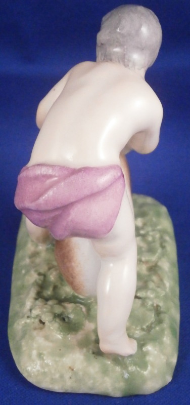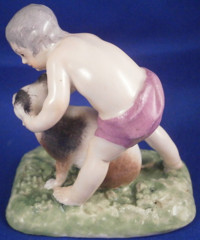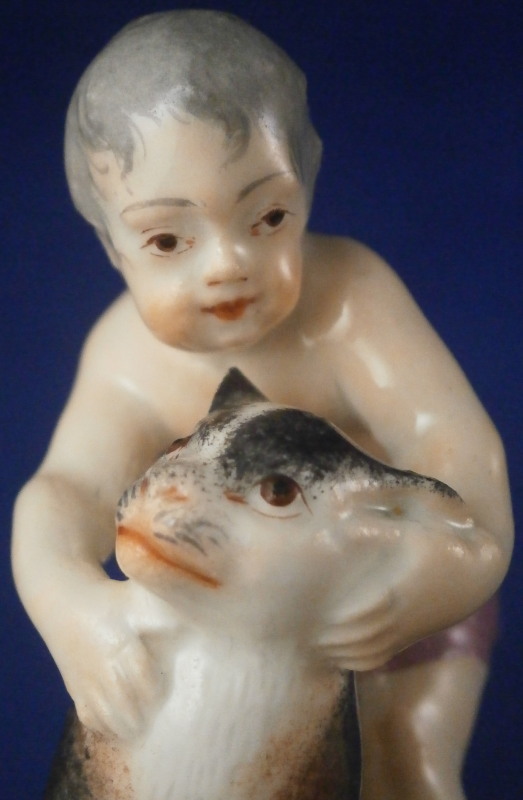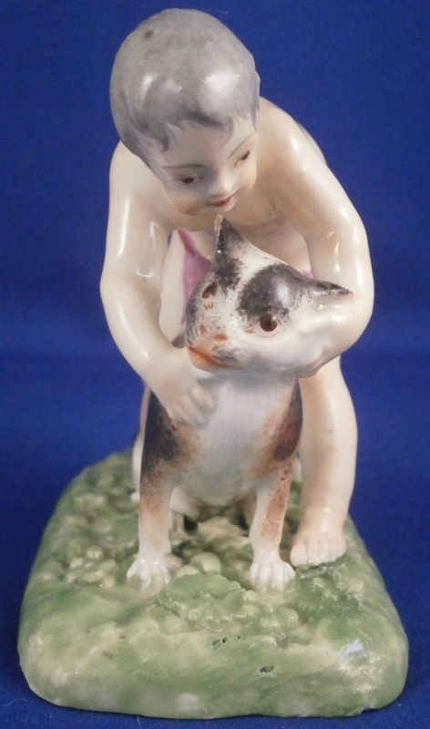 This is a cute little figurine of a boy holding his pet in his arms made by Royal Vienna around 1750. The figure is hand painted very well and typical of Vienna from this period. The boy and his pet are on a green base with molded flowers to it. I am not toatally sure what the pet is but it looks more like a cat to me rather than a dog though I could be wrong. The piece is in superb condition with the smallest of damage to the tip of the tail that is coming through her legs on over the right foot. About as nice as they come from this early period. The figure is 3.125 inches tall, 3 inches wide and 2 inches deep. Marked underneath the base with the blue shield mark as well as a an imrpessed letter i I believe though it is hard to make out. Please email me for more information or photos.