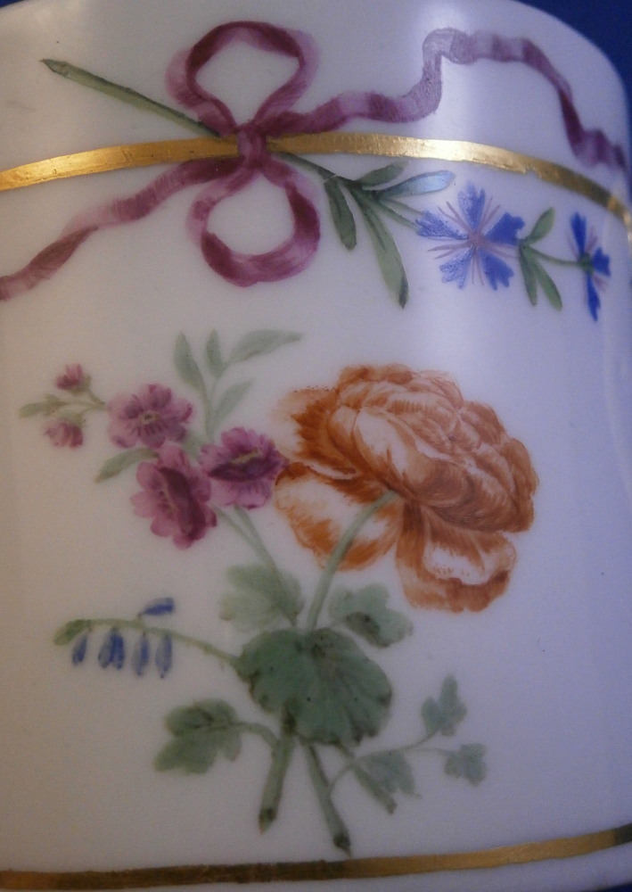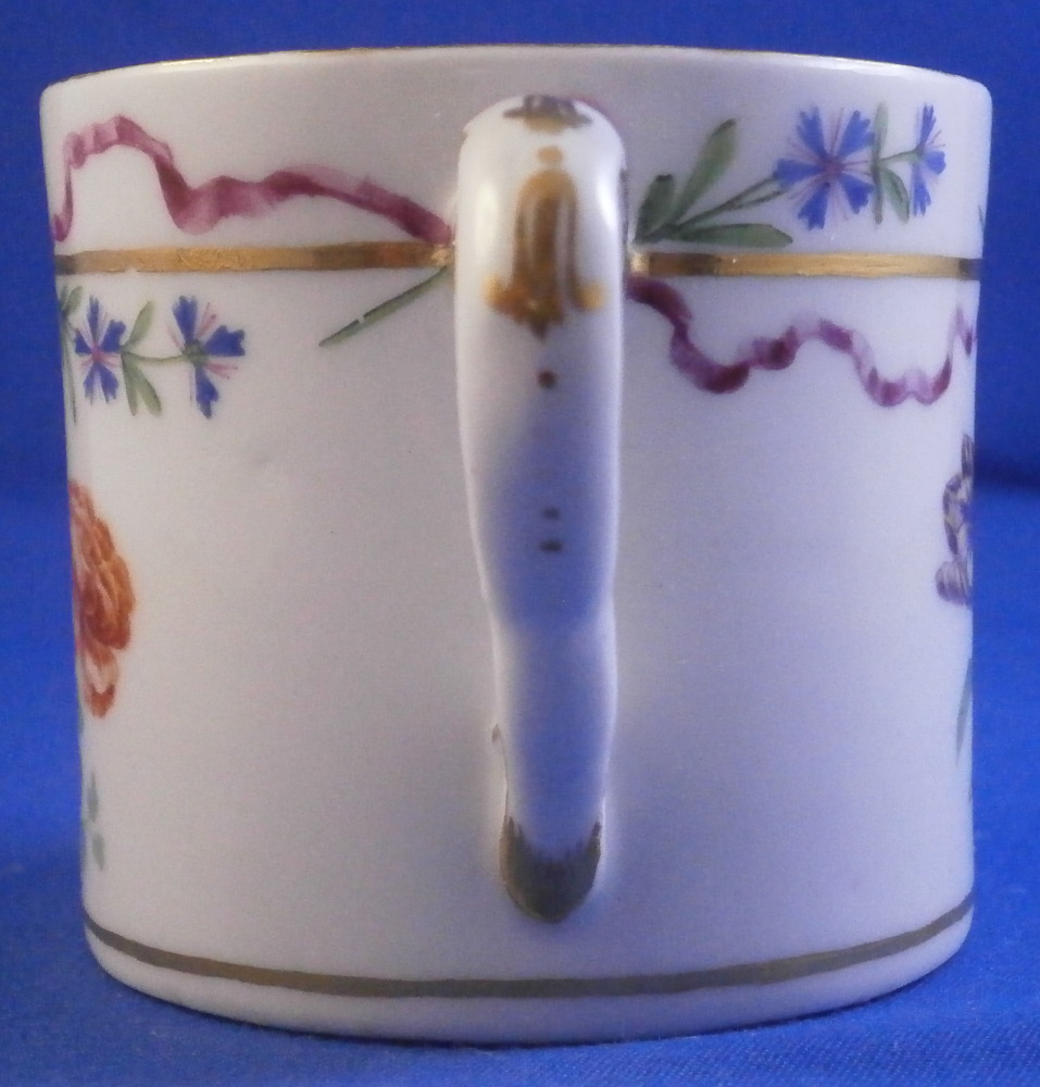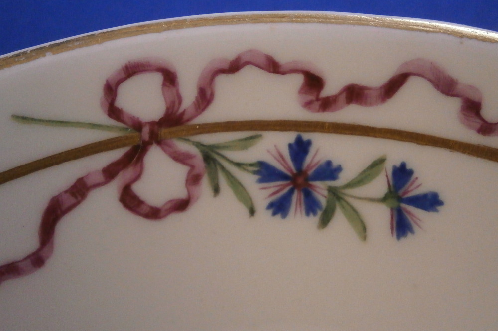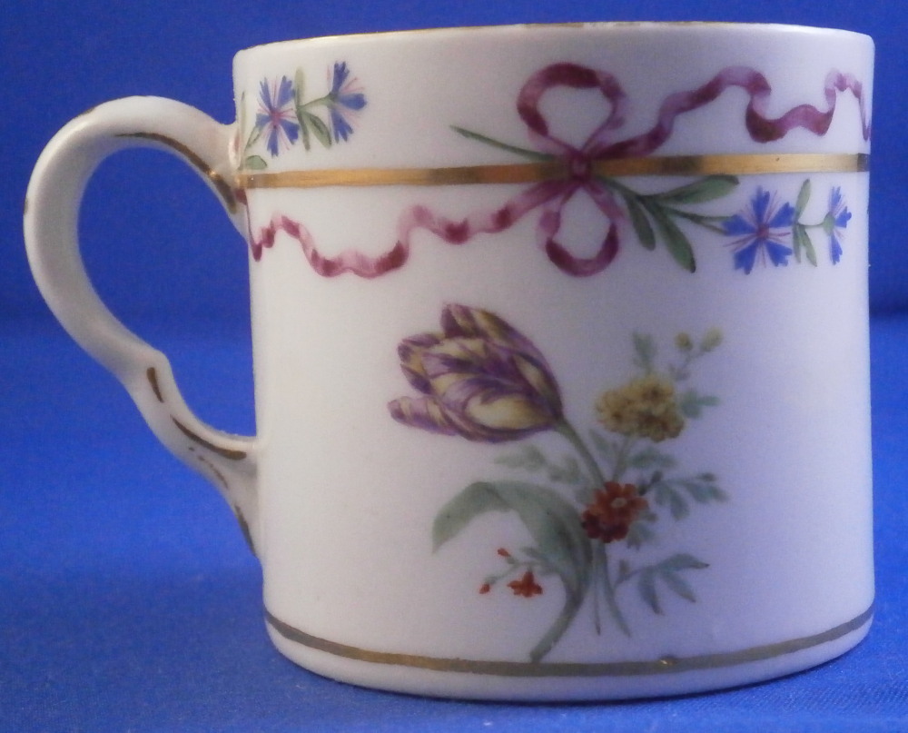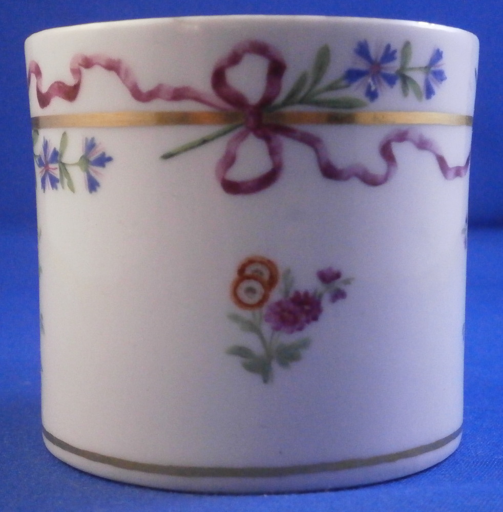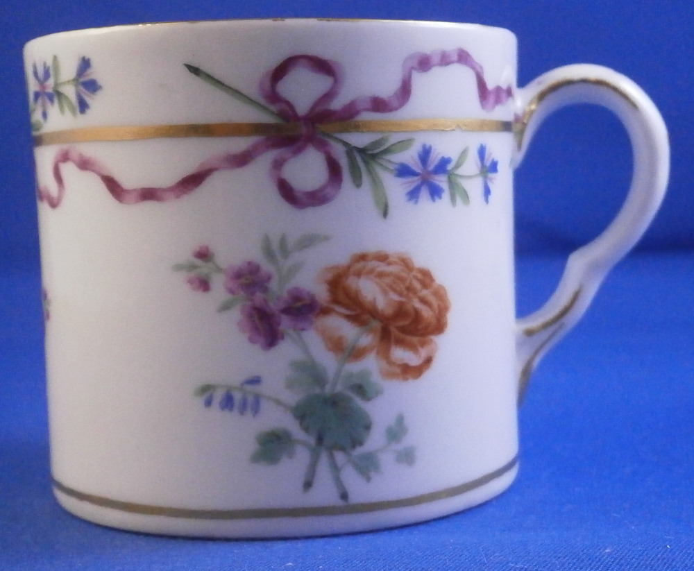 This is a really nice cup and saucer made by Royal Vienna in the 18th century - pre date codes. Both pieces are hand painted with a really nice design including a large floral arrangement to the center of the saucer and two floral arrangements to the outside of the cup. These are nicely painted! My favorite part however is that neat trim to the rim. It consists of pink bow garlands intersected by a thing gold band with blue cornflowers stuck into the bows. Its not soemthing I have seen by them before and it looks stunning! The handle shape is more reminiscent of French pieces and has a bit of gold trim to it. Gold trim to the top edges and around the bottom of the cup. The set is in great condition with some minor wear to the gilding mainly to the top edges. They display perfectly! The cup is 2.125 inches tall and 2.375 inches in diameter. The saucer is 1.25 inches tall and just over 5 inches in diameter. The bottom of both is marked with the blue beehive / shield mark as shown. The cup has a painter's mark to the foot ring but it's too tiny to make out. It is two digits and the last seems to be a 4 but the first is anyone's guess. The saucer has an impressed 2 and 27 under it. Please email me for more information or photos.