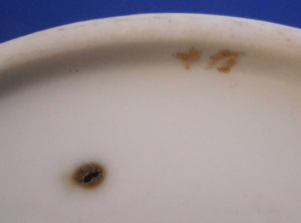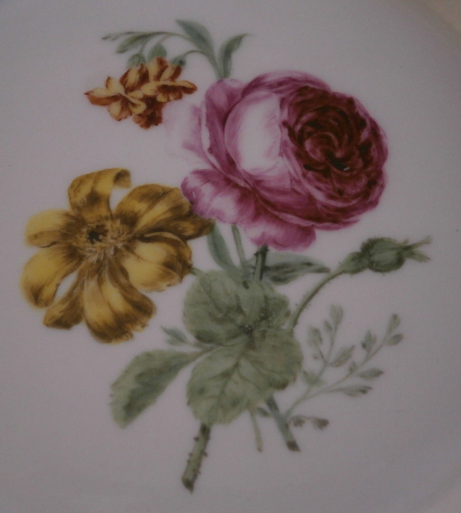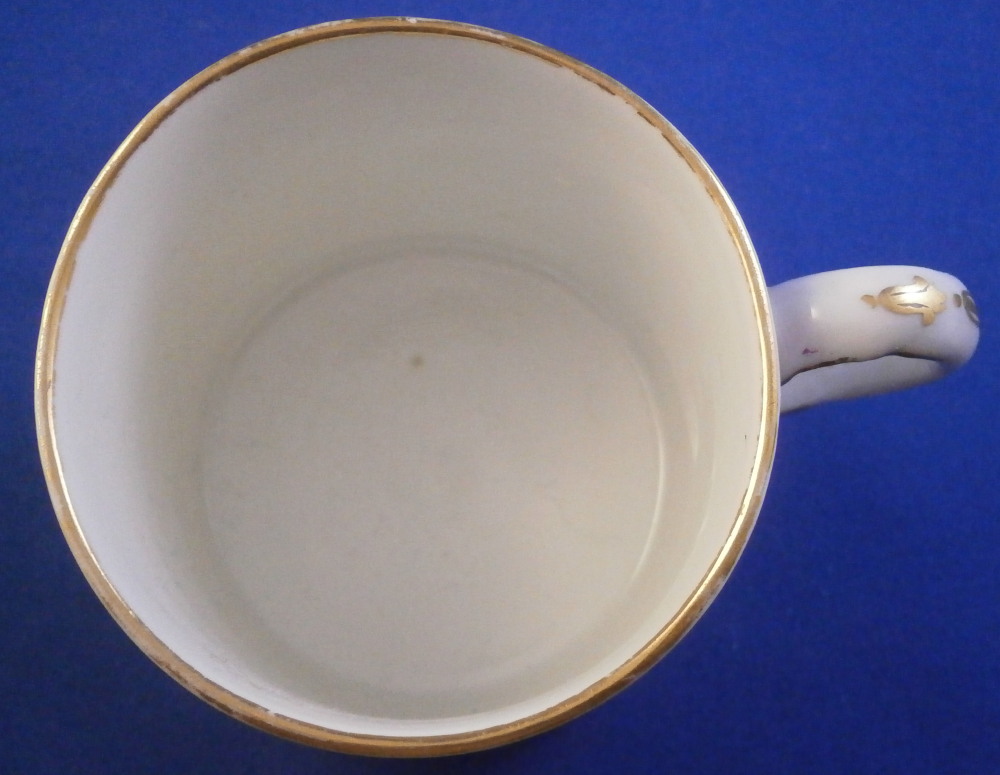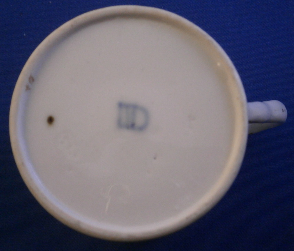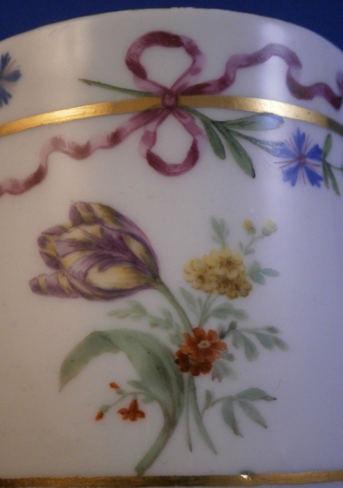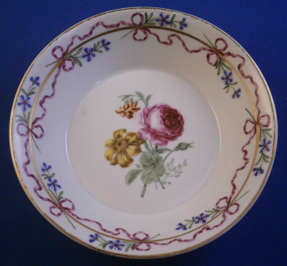 This is a really nice cup and saucer made by Royal Vienna in the 18th century - pre date codes. Both pieces are hand painted with a really nice design including a large floral arrangement to the center of the saucer and two floral arrangements to the outside of the cup. These are nicely painted! My favorite part however is that neat trim to the rim. It consists of pink bow garlands intersected by a thing gold band with blue cornflowers stuck into the bows. Its not soemthing I have seen by them before and it looks stunning! The handle shape is more reminiscent of French pieces and has a bit of gold trim to it. Gold trim to the top edges and around the bottom of the cup. The set is in great condition with some minor wear to the gilding mainly to the top edges. They display perfectly! The cup is 2.125 inches tall and 2.375 inches in diameter. The saucer is 1.25 inches tall and just over 5 inches in diameter. The bottom of both is marked with the blue beehive / shield mark as shown. The cup has a painter's mark to the foot ring but it's too tiny to make out. It is two digits and the last seems to be a 4 but the first is anyone's guess. The saucer has an impressed 2 and 27 under it. Please email me for more information or photos.