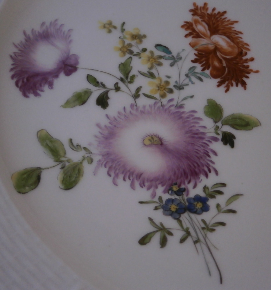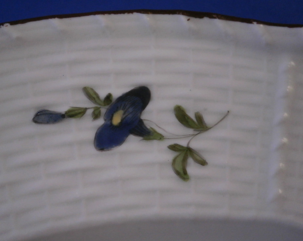 This is anice floral plate made by Royal Vienna in the 18th century before they started using the date codes in the 1780s. The piece is handpainted witha nice floral arrangement on the left side of the well with some smaller flowers and elaves filling in the rest of the space. The rim has a nice basket weave relief design to it with four more flowers over that and a brown trim to the edge. What is interesting regarding this piece is that it came in a set of eight plates all of which were painted by a different painter working for them so you can compare theyr styles and use of colors. Quite neat! I am listing them all separately. The painter in this case here is probably Josef Neumann I believe. The plate is in great condition - as nice as they come. It is marked with the under glaze blue shield mark underneath as well as the painter's mark 22. and an impressed letter N near the footring as shown. The plate is 1.125 inches tall and 9.625 inches in diameter. Please email me for more information or photos.