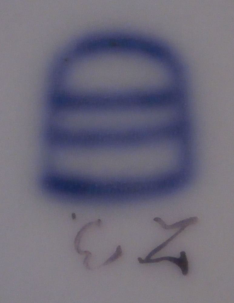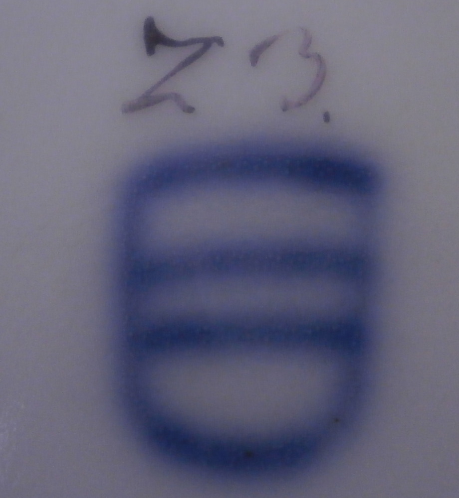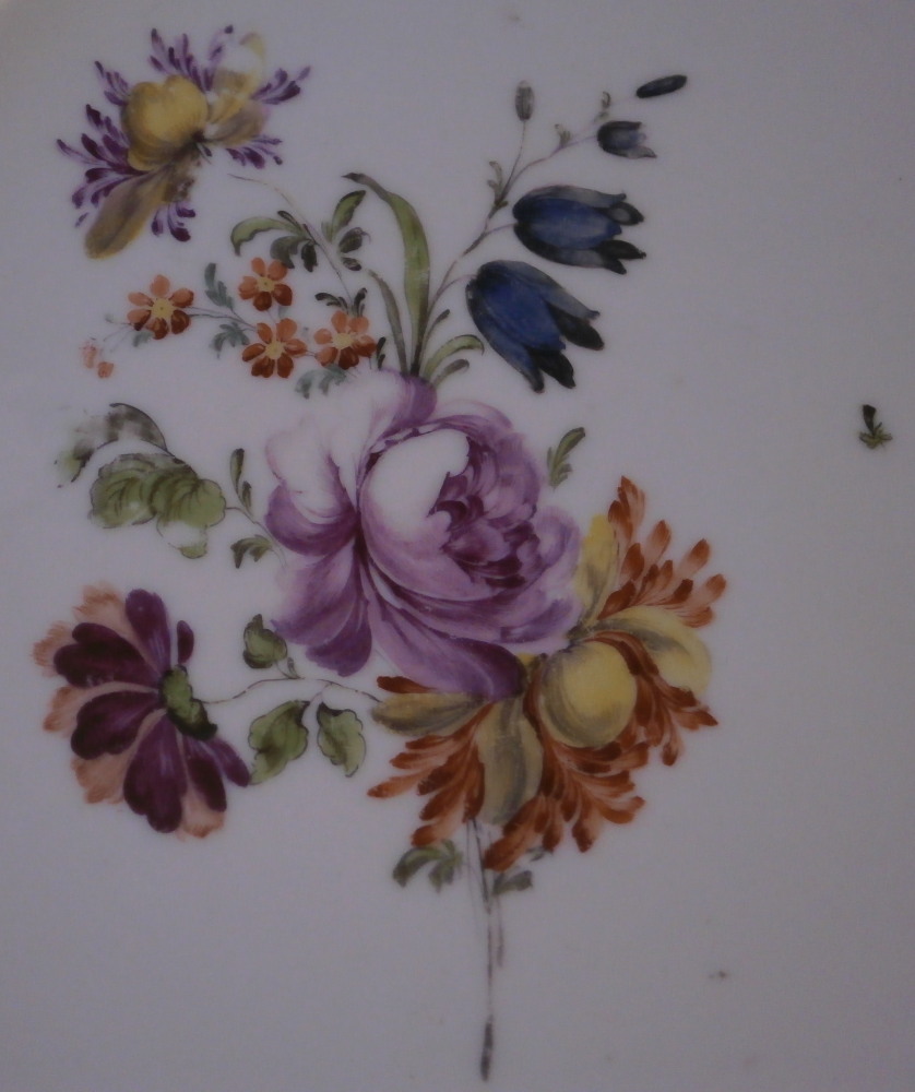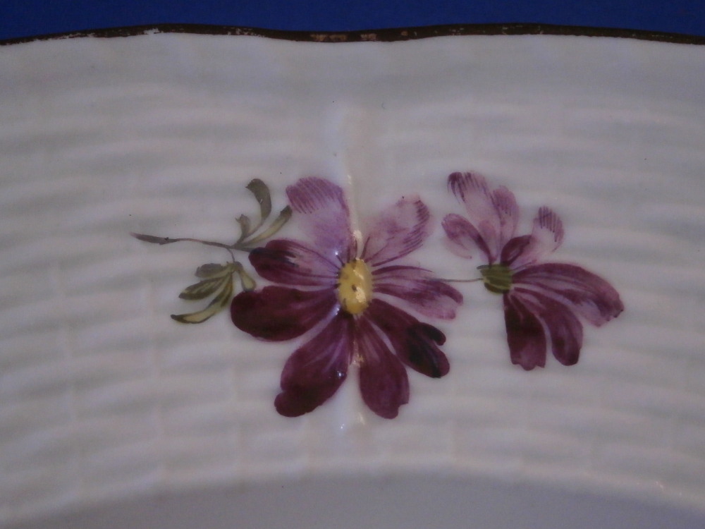 This is a nice floral plate made by Royal Vienna in the 18th century before they started using the date codes in the 1780s. The piece is hand painted with a nice floral arrangement in the well of the plate with three smaller flowers and two leaves filling in the rest of the space. The rim has a nice basket weave relief design to it with three more flowers over that and a brown trim to the edge. What is interesting regarding this piece is that it came in a set of eight plates all of which were painted by a different painter working for them so you can compare their styles and use of colors. Quite neat! I am listing them all separately. The painter in this case here is probably Josef Anreiter who worked for the factory from 1753 until 1801. The plate is in great condition with a touch of wear but it displays superbly. The plate is marked with the under glaze blue shield mark underneath as well as the painter's mark 23. and an impressed letter N near the foot ring as shown. A 15 or something along those lines added into the glaze when it was made. The plate is 1.25 inches tall and 9.625 inches in diameter. Please email me for more information or photos.