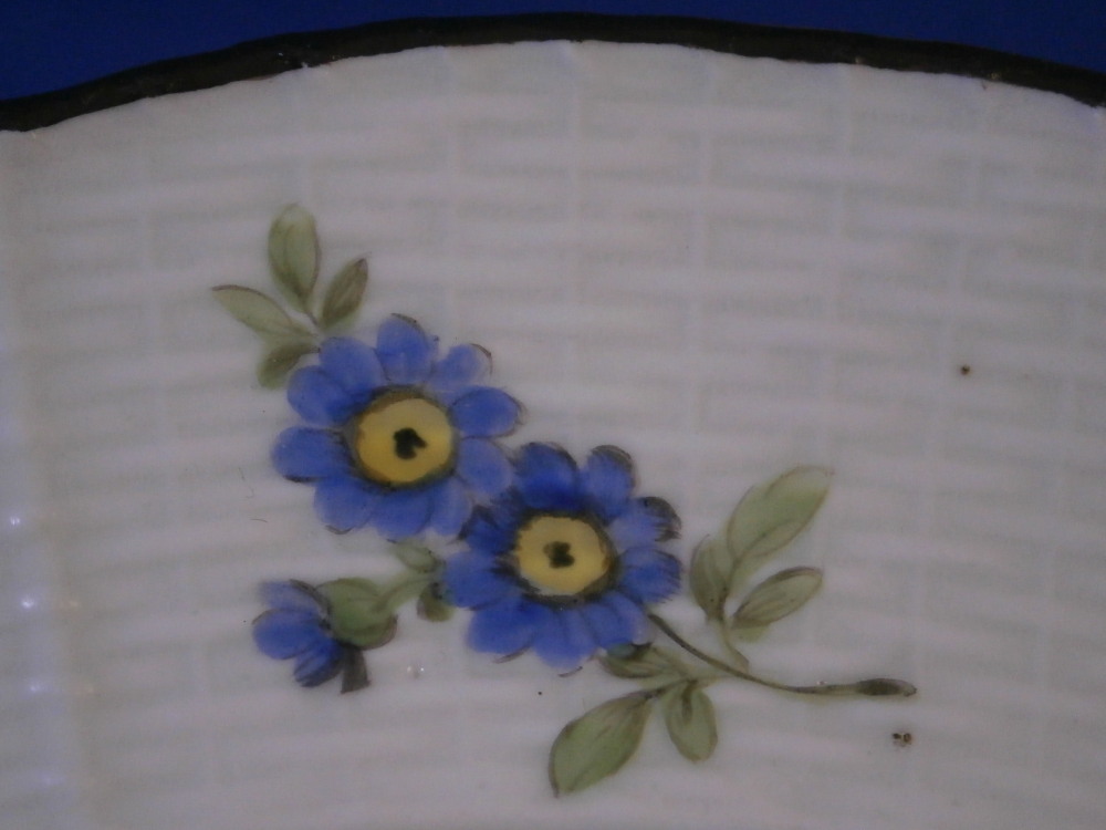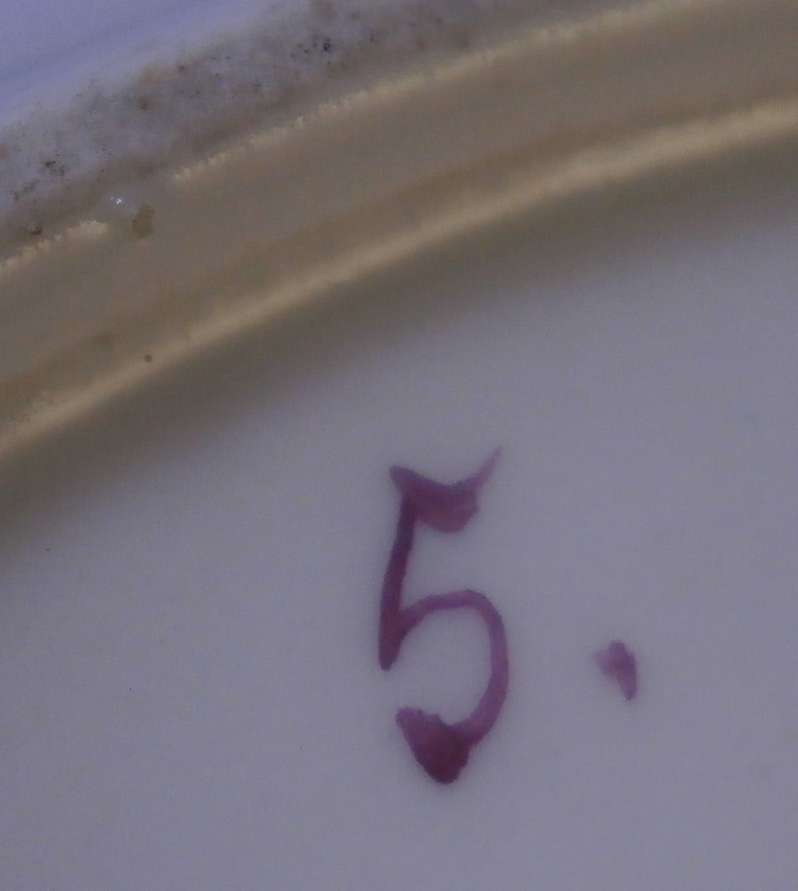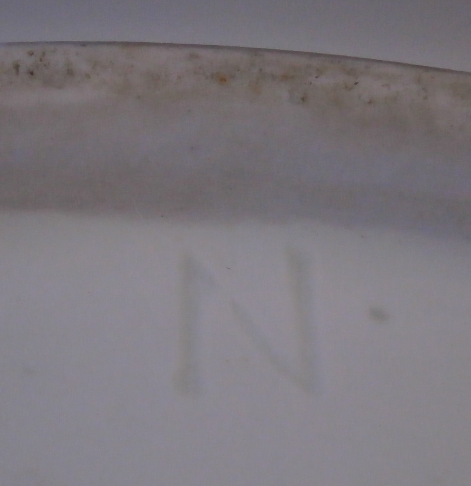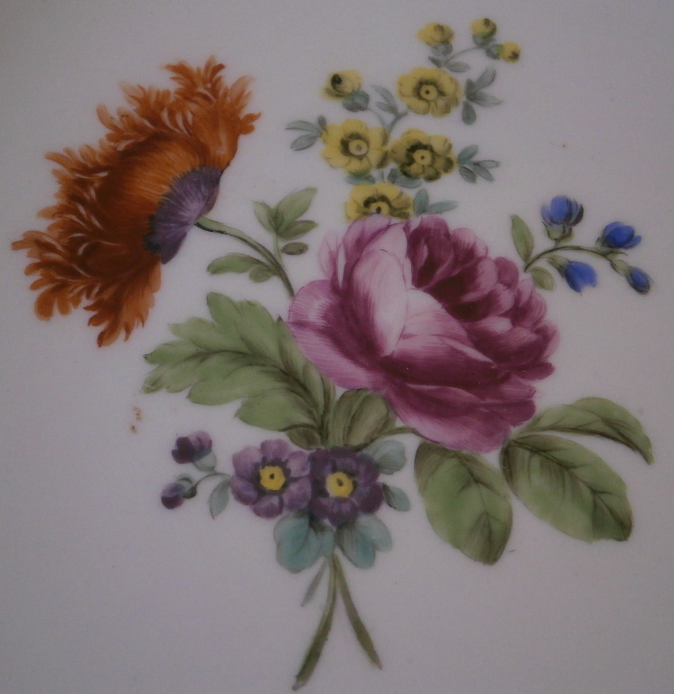 This is a nice floral deep or soup plate made by Royal Vienna in the 18th century before they started using the date codes in the 1780s. The piece is hand painted with a nice floral arrangement in the well of the plate with two smaller flowers filling in the rest of the space. The rim has a nice basket weave relief design to it with five more flowers over that and a brown trim to the edge. What is interesting regarding this piece is that it came in a set of eight plates all of which were painted by a different painter working for them so you can compare their styles and use of colors. Quite neat! I am listing them all separately. The painter in this case here is probably Jakob Burghauser who worked for the factory from 1762 until after 1801. The plate is in great condition with stacking wear to the small yellow flower in the well of the plate and some tiny black firing spots but it displays superbly. Really nice looking flowers on this one! The plate is marked with the under glaze blue shield mark underneath as well as the painter's mark 5. and an impressed letter N near the footring as shown. The plate is 1.75 inches tall and 9.625 inches in diameter. Please email me for more information or photos.