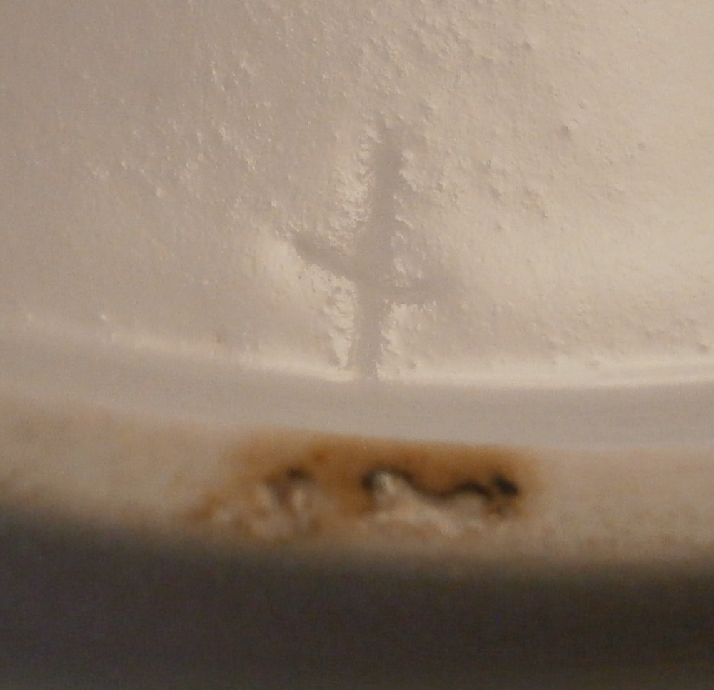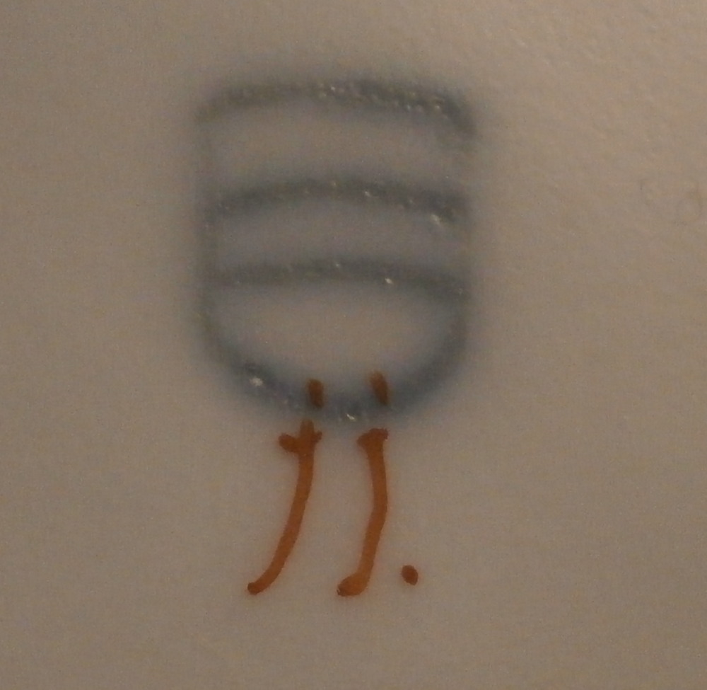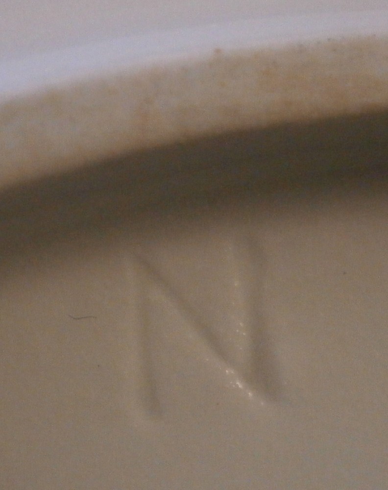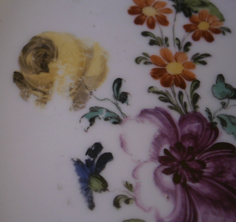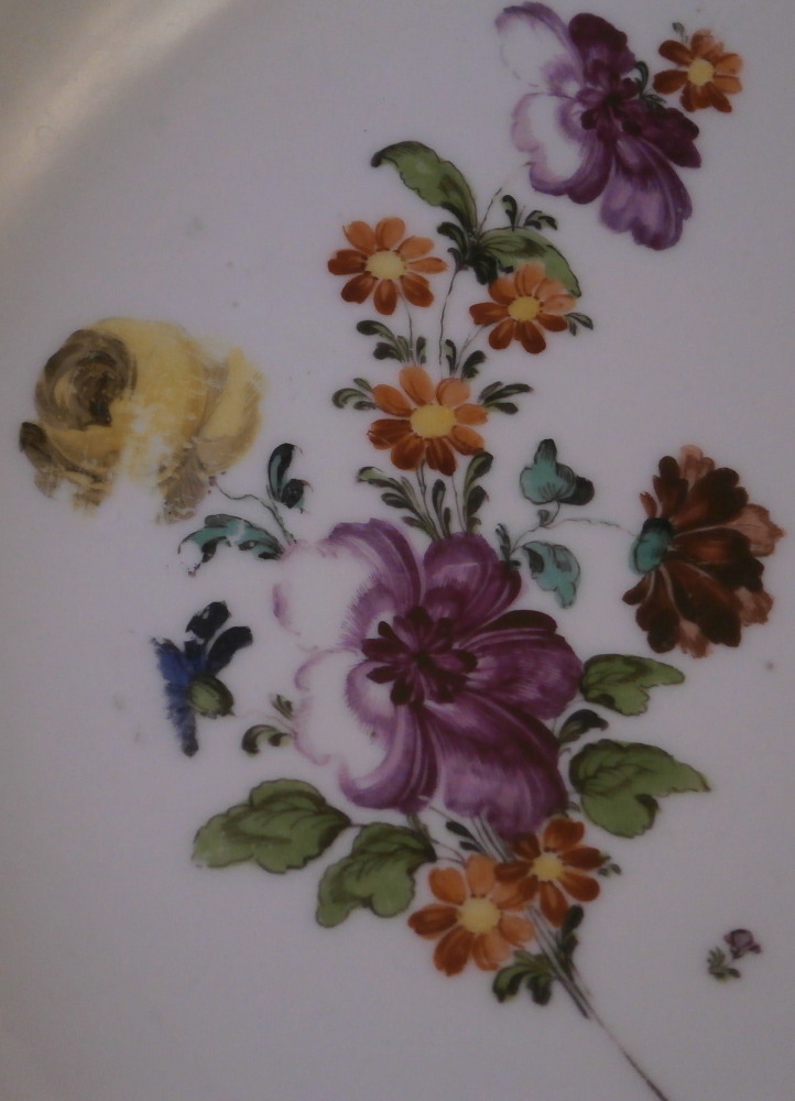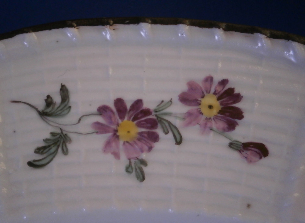 This is a nice floral deep or soup plate made by Royal Vienna in the 18th century before they started using the date codes in the 1780s. The piece is hand painted with a nice floral arrangement in the well of the plate with three smaller flowers and two leaves filling in the rest of the space. The rim has a nice basket weave relief design to it with four more flowers over that and a brown trim to the edge. What is interesting regarding this piece is that it came in a set of eight plates all of which were painted by a different painter working for them so you can compare their styles and use of colors. Quite neat! I am listing them all separately. The painter in this case here is a bit odd. I ahve had a piece with this mark before that looks like JJ but since they used only numbers it must correspond to a double digit number possibly 55 in which case it is probably Franz Bernhart who worked for the factory from 1785 until 1837. The plate is in great condition with stacking wear to the yellow and blue flower of the arrangement in the well of the plate as shown but it displays nicely. The plate is marked with the under glaze blue shield mark underneath as well as the painter's mark JJ. and an impressed letter N and incised leter x into the glaze near the footring as shown. The plate is 1.75 inches tall and 9.625 inches in diameter. Please email me for more information or photos.