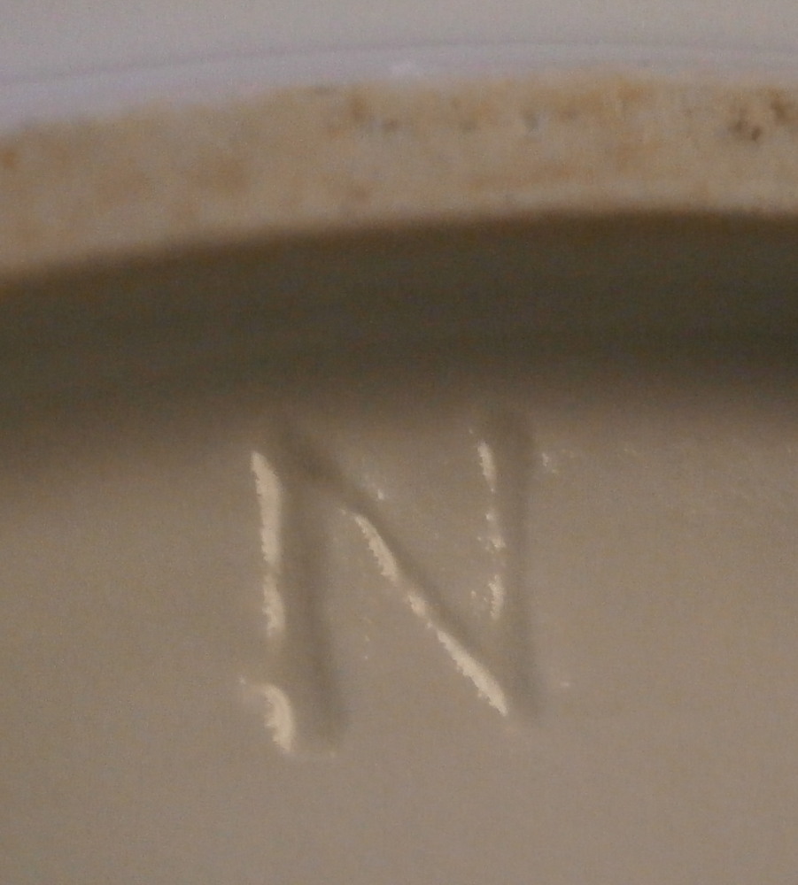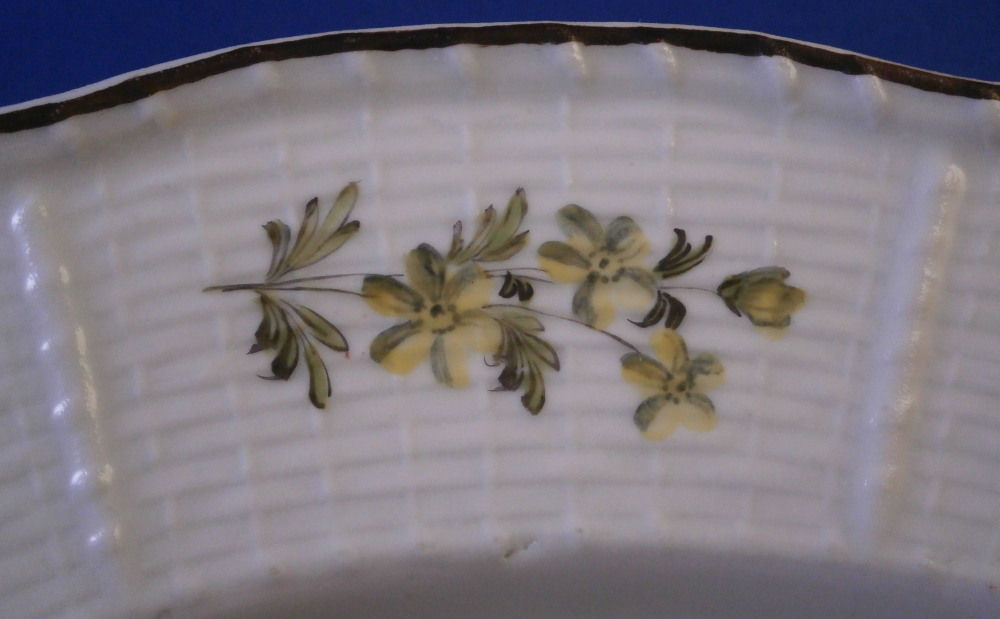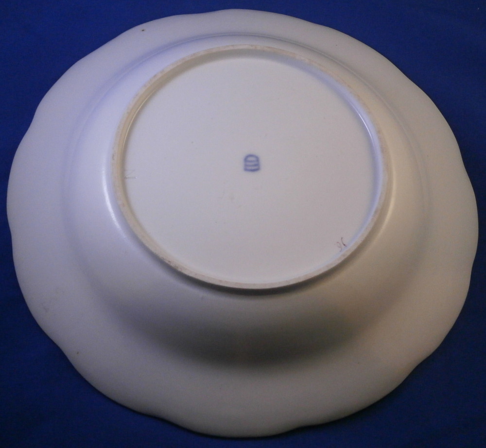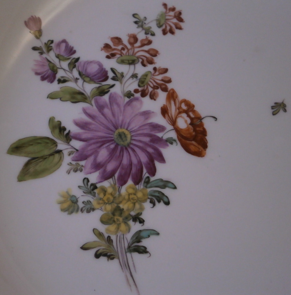 This is a nice floral deep or soup plate made by Royal Vienna in the 18th century before they started using the date codes in the 1780s. The piece is hand painted with a nice floral arrangement in the well of the plate with three smaller flowers and a leaf filling in the rest of the space. The rim has a nice basket weave relief design to it with four more flowers over that and a brown trim to the edge. What is interesting regarding this piece is that it came in a set of eight plates all of which were painted by a different painter working for them so you can compare their styles and use of colors. Quite neat! I am listing them all separately. The painter in this case here is probably Johann Daffinger who worked for the factory from 1760 until 1787. The plate is in superb condition! The plate is marked with the under glaze blue shield mark underneath as well as the painter's mark 16. and an impressed letter N near the foot ring and incised number 15 into the glaze as shown. The plate is 1.875 inches tall and 9.625 inches in diameter. Please email me for more information or photos.