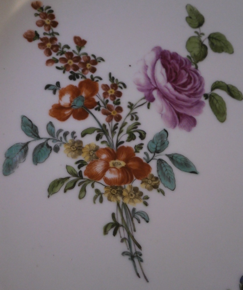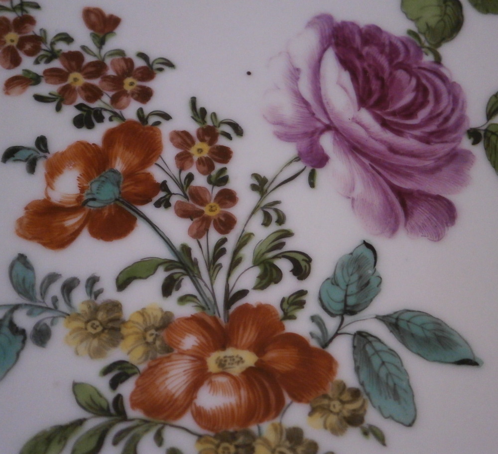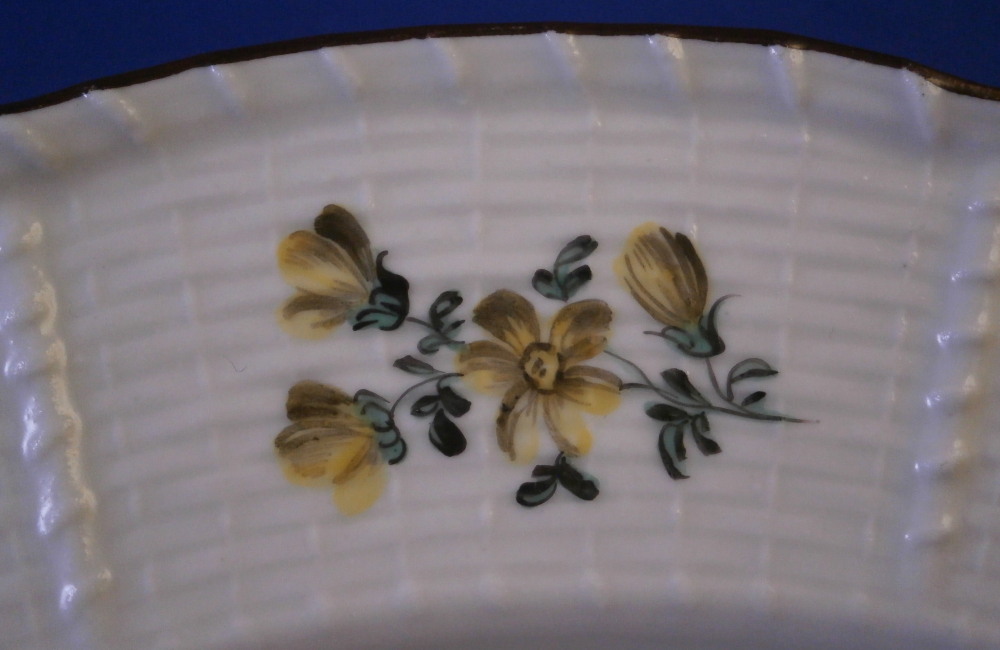 This is a nice floral deep or soup plate made by Royal Vienna in the 18th century before they started using the date codes in the 1780s. The piece is hand painted with a nice floral arrangement in the well of the plate with three smaller flowers and a leaf filling in the rest of the space. The rim has a nice basket weave relief design to it with four more flowers over that and a brown trim to the edge. What is interesting regarding this piece is that it came in a set of eight plates all of which were painted by a different painter working for them so you can compare their styles and use of colors. Quite neat! I am listing them all separately. The painter in this case here is probably Franz who worked for the factory from 1783 until 1804. The plate is in great condition with a bit of stacking wear to the small yellow flower and a brown firing spot near that but it displays superbly! The flowers are extra nice on this piece! The plate is marked with the under glaze blue shield mark underneath as well as the painter's mark 10. and an impressed letter N near the foot ring and incised number 15 into the glaze as shown. The plate is 1.875 inches tall and 9.5 inches in diameter. Please email me for more information or photos.