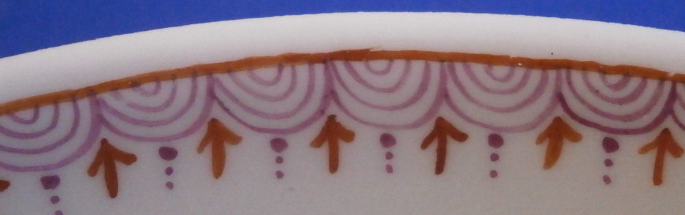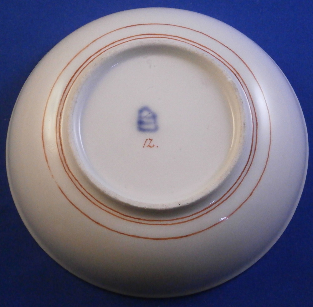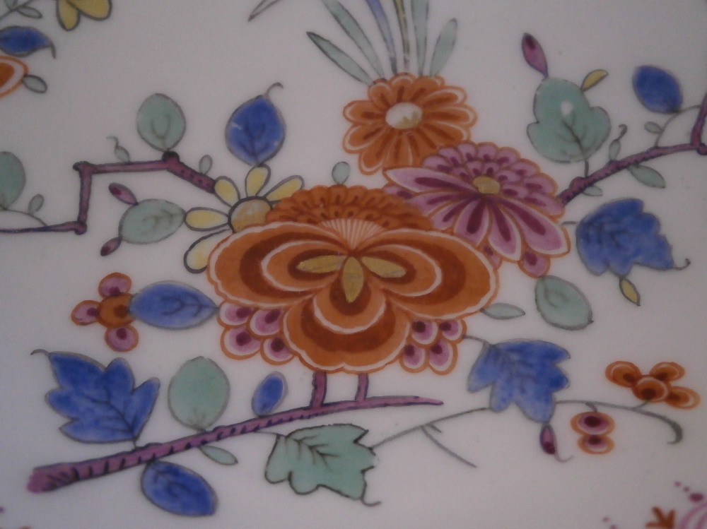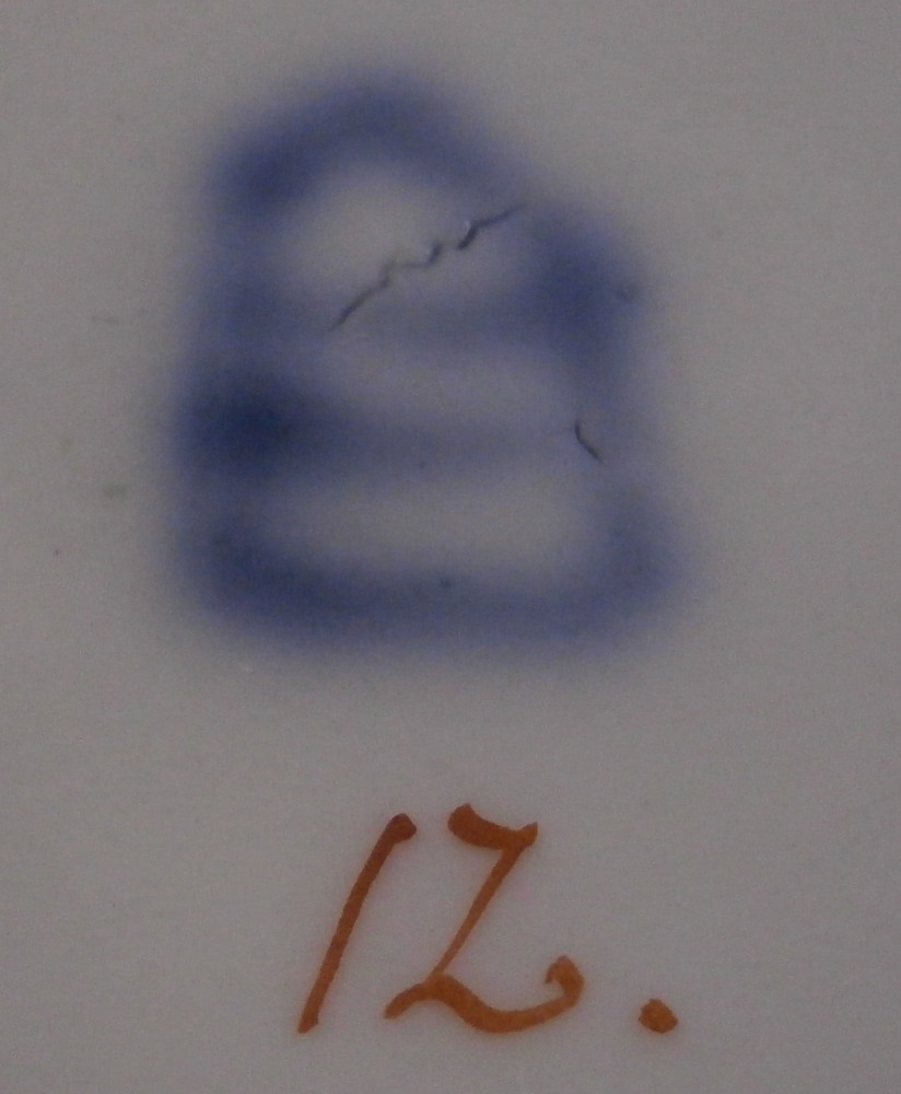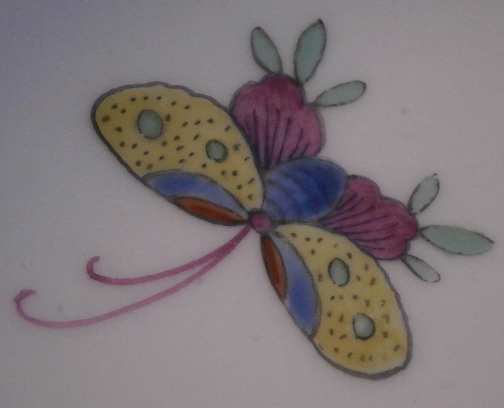 This is a saucer made by Royal Vienna in the 18th century - probably during their early years around 1750. It matches a Meissen cup perfectly that it came with - so much so that I think it was painted as a replacement piece for a broken saucer originally. It even has the typical red line trim to the underside like the original Meissen saucer would have had. The saucer is hand painted with a superb Kakiemon design including Chrysanthemum / Peony flowers as well as a butterfly in the usual style and color palette. Nice purple and red trim to the rim. The saucer is in good condition with a small flake chip as shown which does not show when on display. It is just under 1.125 inches tall and 5.25 inches in diameter. Marked with the under glaze blue shield / beehive mark as well as a red 12 and an impressed number which is not a date code since it is just a single digit. Please email me for more information or photos.