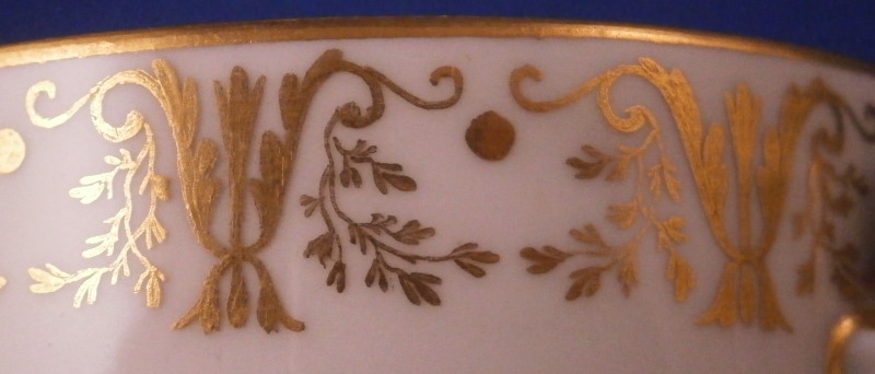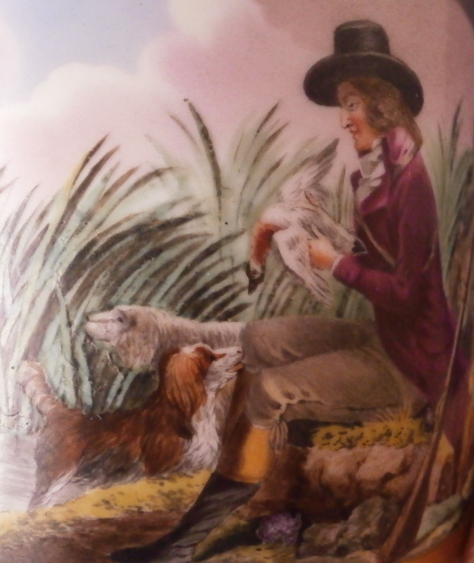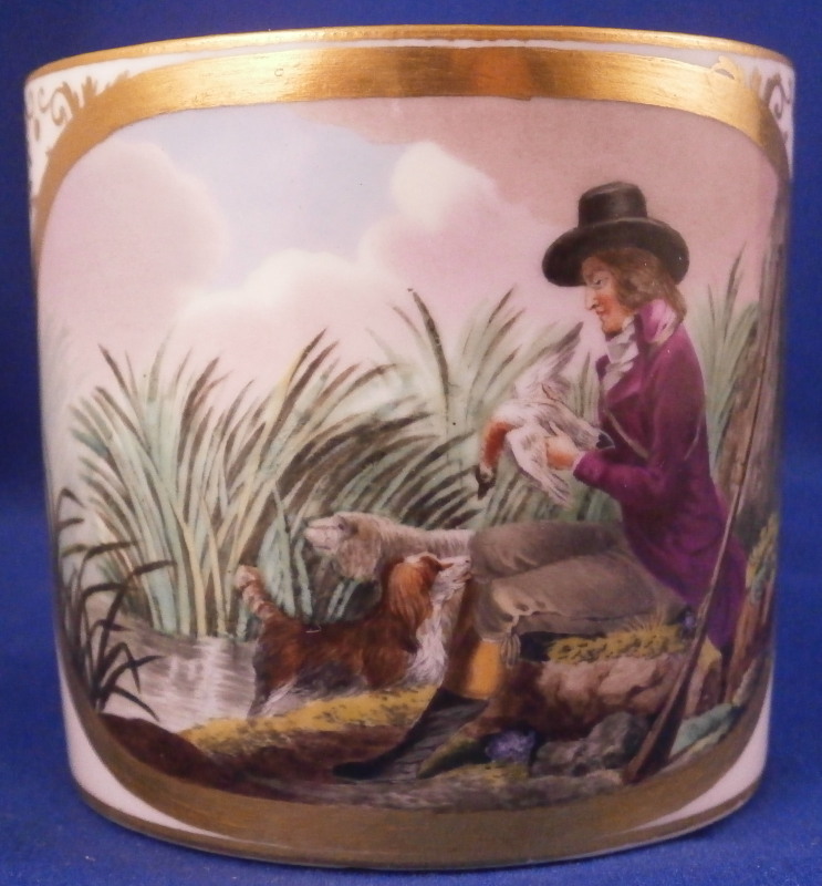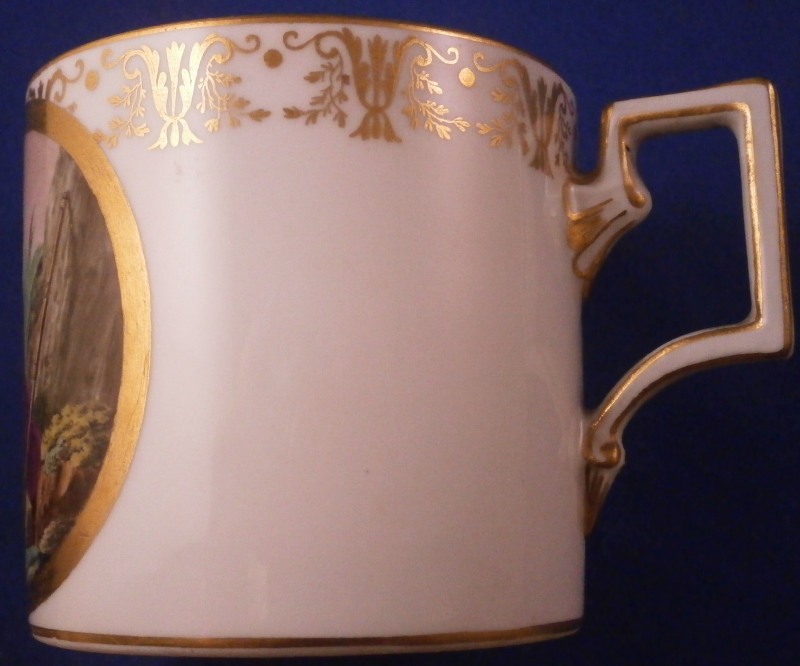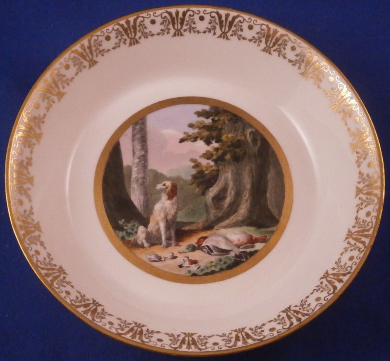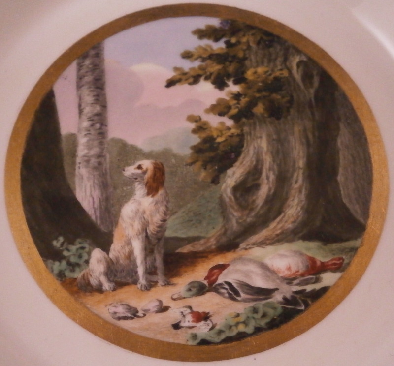 This is a superb cup and saucer made by Vienna in about 1791 pretty much in the middle of my favorite period of theirs the Sorgenthal period. The cup has a really nice hand painted scene to the front including a gentleman holding a dead duck with his two dogs on one side and rifle on the other in a nice landscape surrounding. The saucer has a scene in the center of a dog sitting in the woods with some dead ducks lying on the ground. Both scenes are surrounded by a simple gold line trim with the rim of each having a matching fancy gold trim to it that is really quite nice looking. The cup has a typical handle shape of the period with a bit of gilding to it as well. The scenes are of a very nice quality! Both are marked with the underglaze blue shield mark as well as an impressed 91 for 1791 as well as an impressed 39. Two painter's marks on is a 13 for Franz Bernhardt and a 105 for the gilder Johann Stelzig I believe. Both pieces are in great condition with just two spots each where the paint has flaked off a bit. Both were colored in a little to hide them perfectly when on display but I tried to show them in the pictures. The cup is 2.25 inches tall and has a diameter of 2.375 inches. The saucer is 1.125 inches tall and 5.25 inches in diameter. Please email me for more information or other pictures.