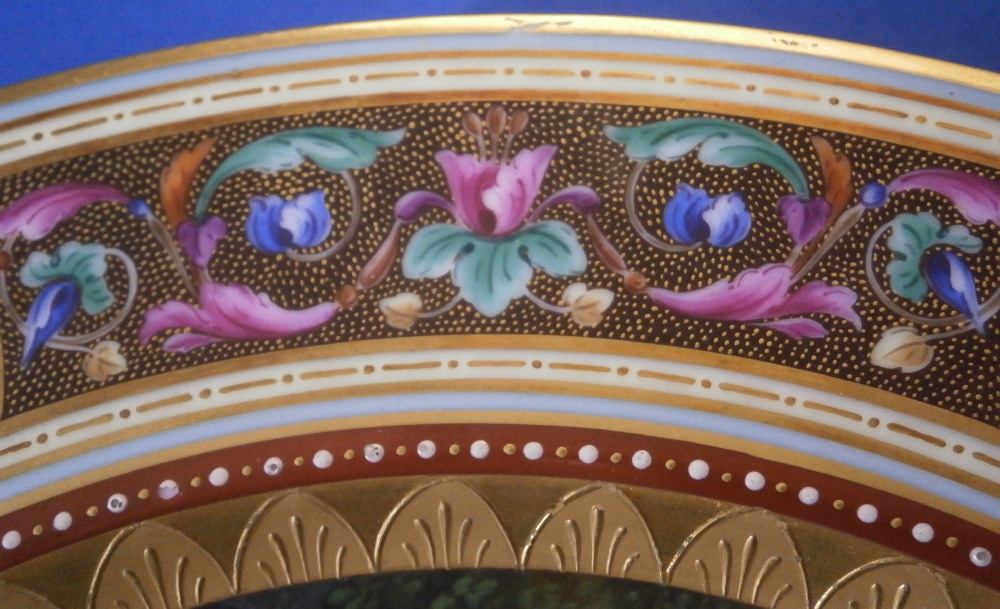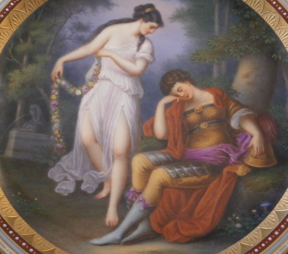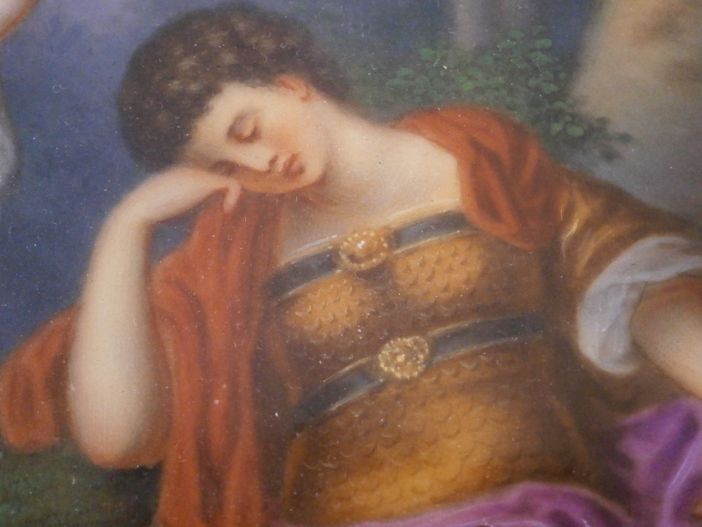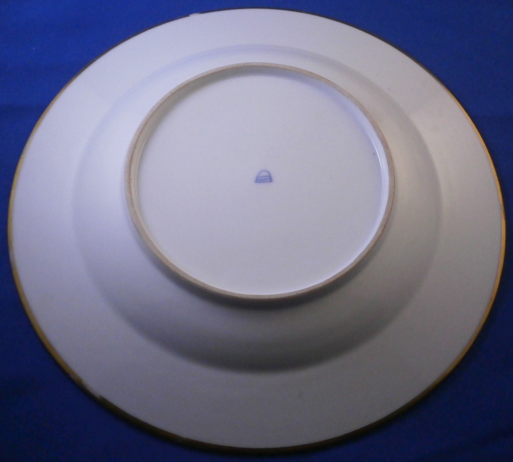 This is a really nice scenic plate made by one of the many factories copying the Royal Vienna beehive / shield mark. This one was made in the late 19th / early 20th century in Austria or possibly Germany ! The center is hand painted with a scene of a lady holding a floral garland with a warrior sleeping next to her while sitting. Nice landscape surrounding with a fountain of a sphinx in the background. What I especially like about this plate is the rim design of the colorful scrolls with the dotted background. It in combination with the other panels looks stunning! The scene is of a very good quality and the rim design nicer than many. it's a great looking plate! The plate is in superb condition with jsut a touch of use marks / wear. it displays perfectly! It is 9.625 inches in diameter and 1.375 inches tall so a very nice size. It is marked with the blue shield / beehive mark underneath as shown. Please email me for more information or photos.