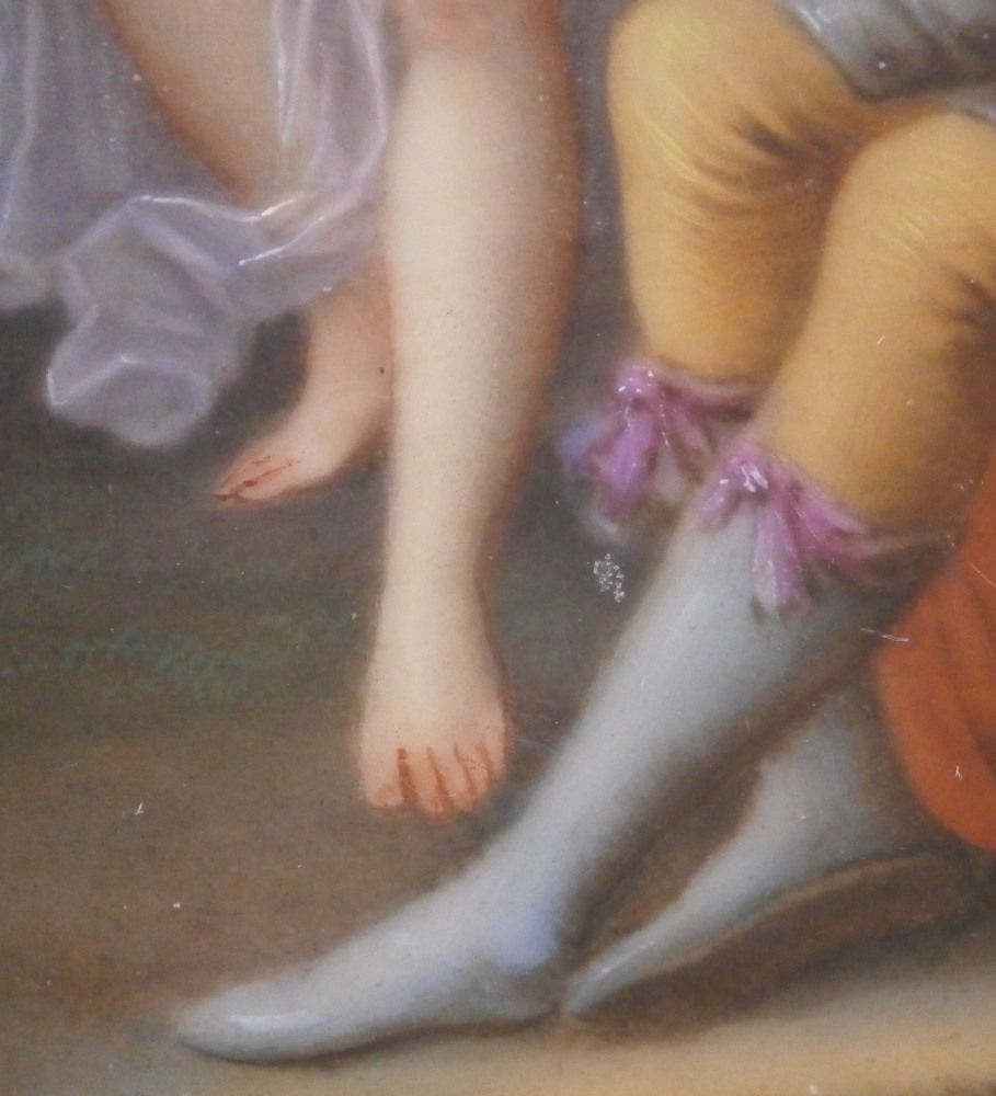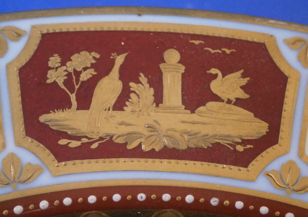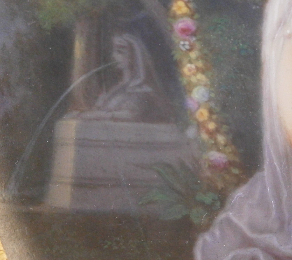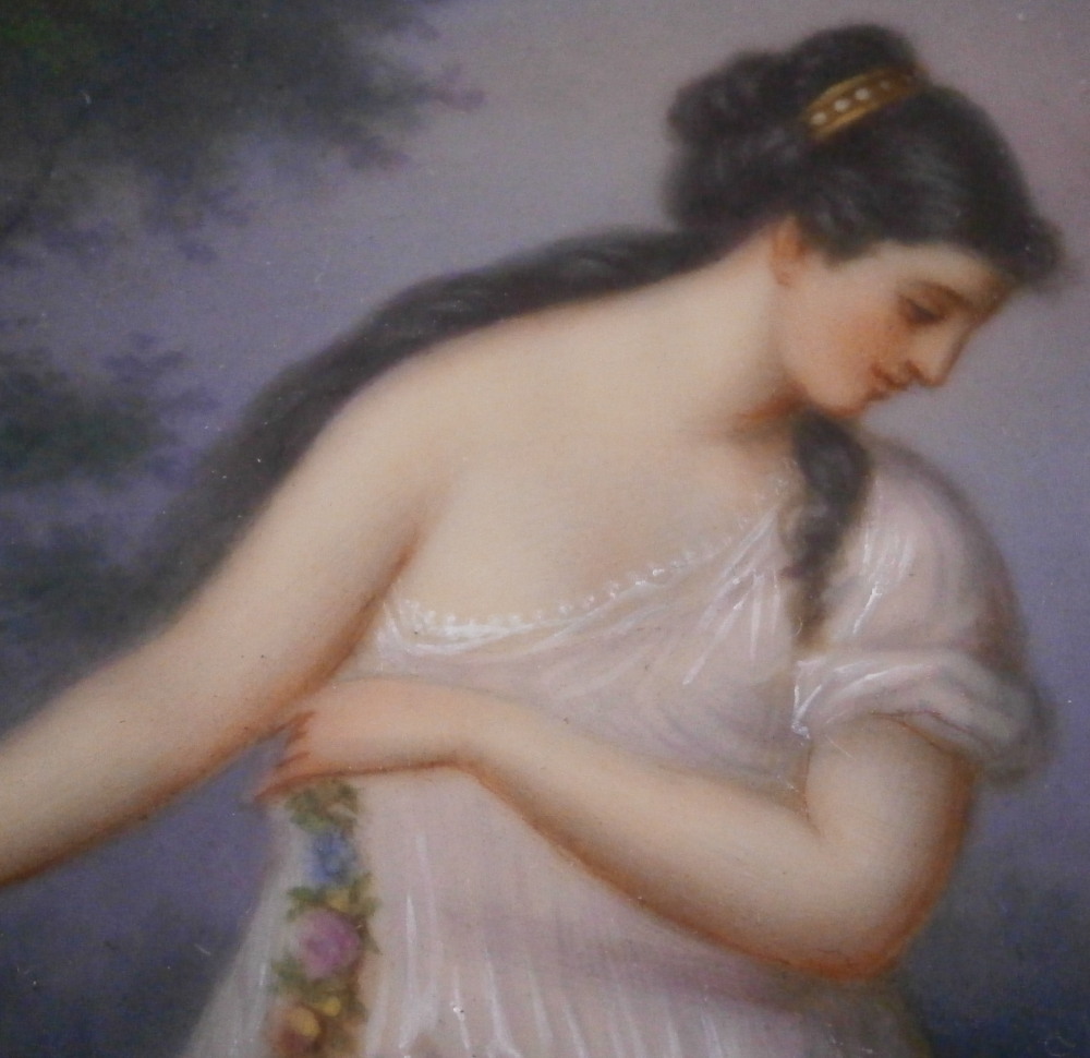 This is a really nice scenic plate made by one of the many factories copying the Royal Vienna beehive / shield mark. This one was made in the late 19th / early 20th century in Austria or possibly Germany ! The center is hand painted with a scene of a lady holding a floral garland with a warrior sleeping next to her while sitting. Nice landscape surrounding with a fountain of a sphinx in the background. What I especially like about this plate is the rim design of the colorful scrolls with the dotted background. It in combination with the other panels looks stunning! The scene is of a very good quality and the rim design nicer than many. it's a great looking plate! The plate is in superb condition with jsut a touch of use marks / wear. it displays perfectly! It is 9.625 inches in diameter and 1.375 inches tall so a very nice size. It is marked with the blue shield / beehive mark underneath as shown. Please email me for more information or photos.