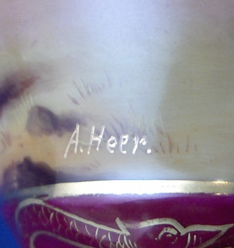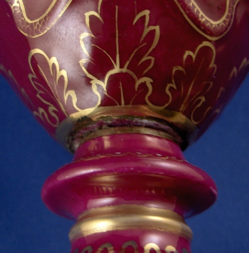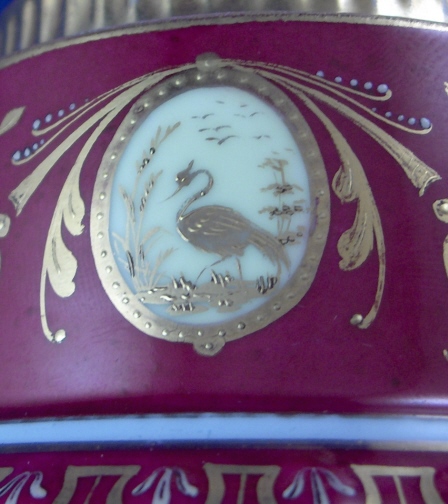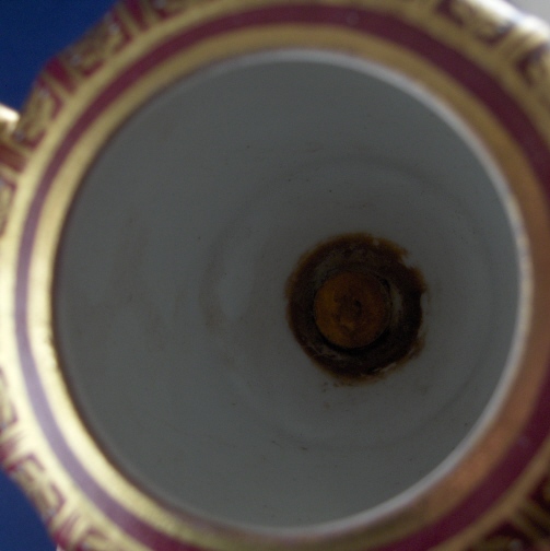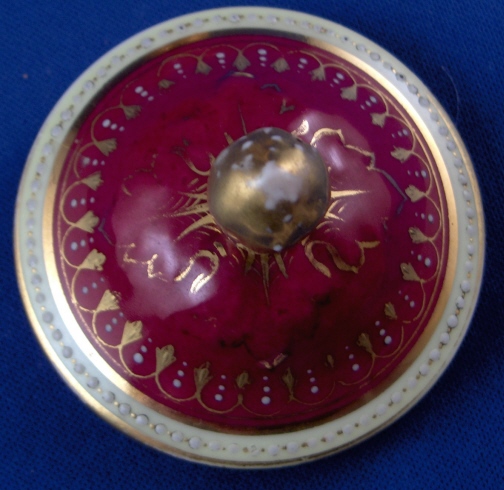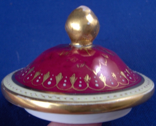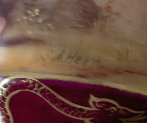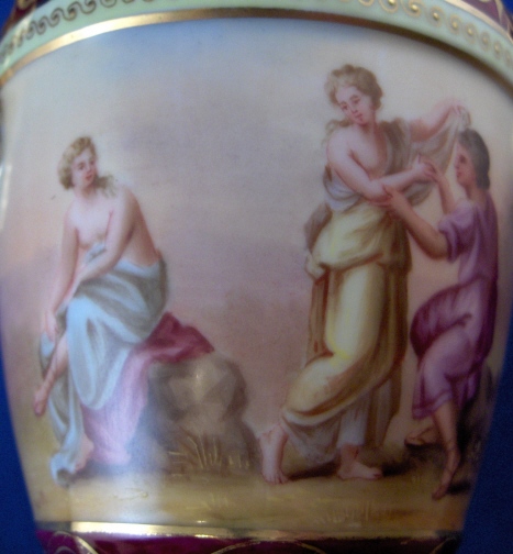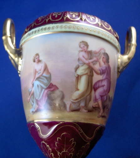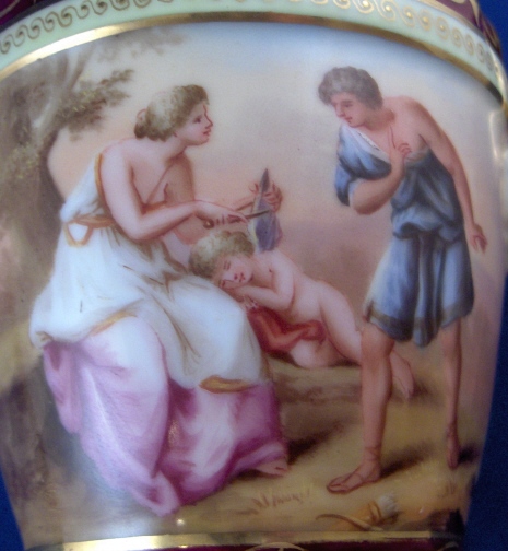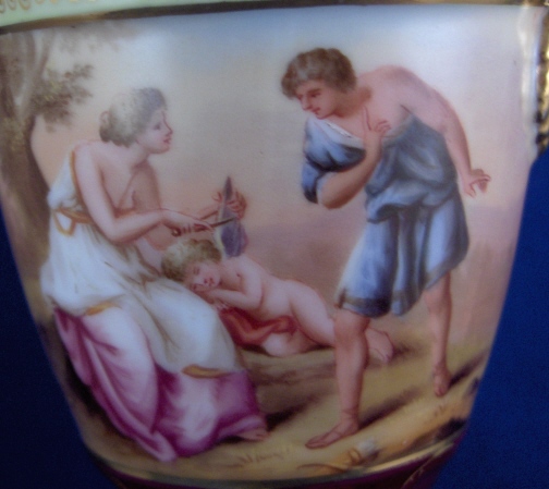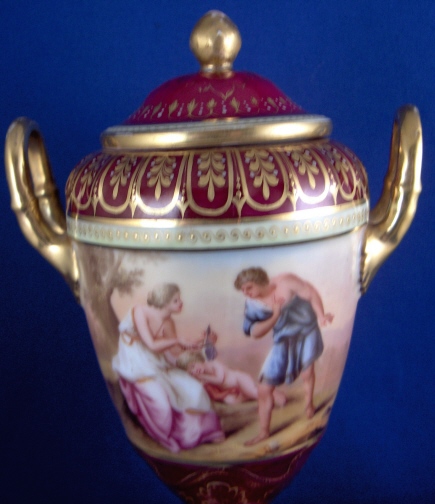 This is a superb scenic lidded urn / vase made by one of the so called Royal Vienna makers in the late 19th century. The piece is handpainted with two superb scenes - one on the front and one on the back as well as the typical Vienna type gold designs on a reddish colored gound all around. The urn sits on a nice pedestal to give it some extra height which is nice! Both scenes are handpainted, signed A. Herr and their titles are on the underside. The scenes are titled Amor wird Entwaffnet and Adonis und Nymphe in black. Very good quality and a decorative piece that is rarer than the plates and much nicer I think. The piece is marked with the beehive or shield mark underneath as shown. It is 9 inches tall (including the lid), 4 inches wide and 3.875 inches in diameter at the base. The piece is in great conditin with the lid finial reglued and some minor wear. The joint between the top urn part and its base is a bit loose which is normal and can easily be fixed if need be though it is rather minor. Please email me for more information or photos.