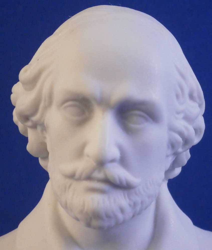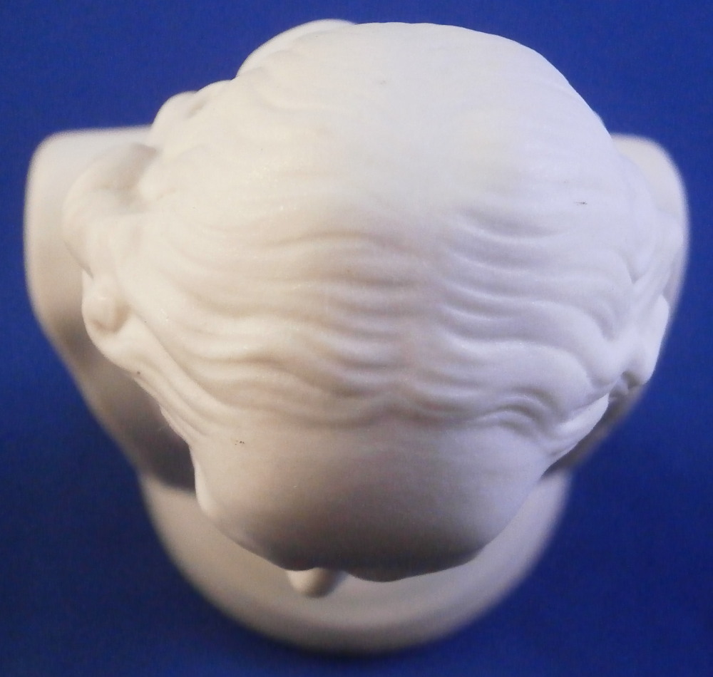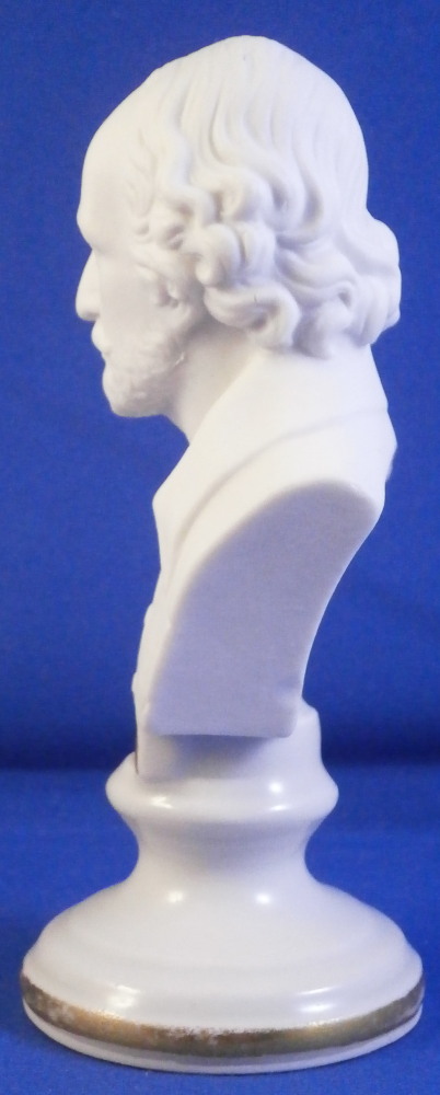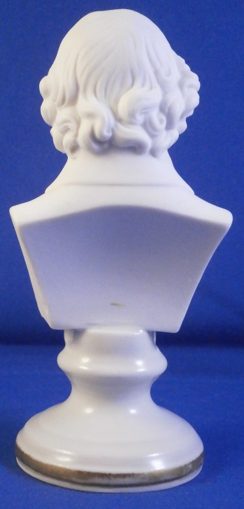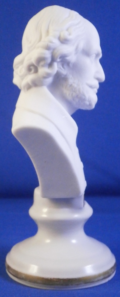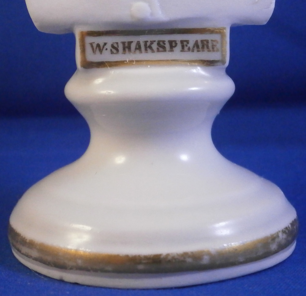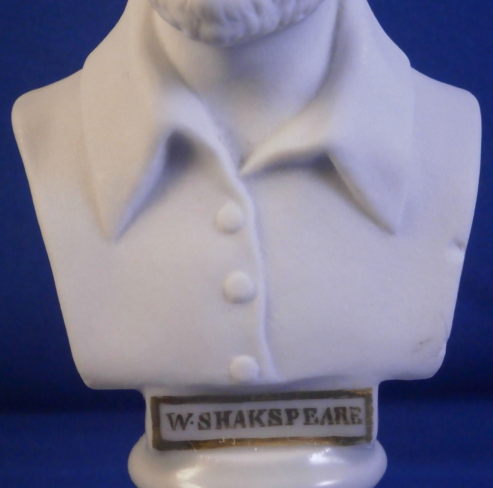 This is a bust of William Shakespeare made by Royal Vienna in 1850. Part of a series of 200 famous people they made into these little figures around that time. He needs no introduction. Born in 1564 and died in 1616. The bust is nicely modeled in unglazed biscuit porcelain that sits on a glazed base with a bit of gold trim to it. His name is written in gold in the front. The figurine is in great condition with some wear to the gold trim and a tiny chip to the left edge near his collar point with another small flaw below that in the same area. Displays nicely! The figure is 4.375 inches tall, 2 inches wide and 1.875 inches deep. It is marked underneath with the impressed beehive / shield mark, the year mark 850 as well as the impressed number 34 as shown. Please email me for more information or photos.