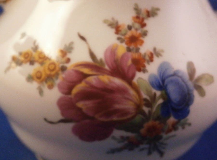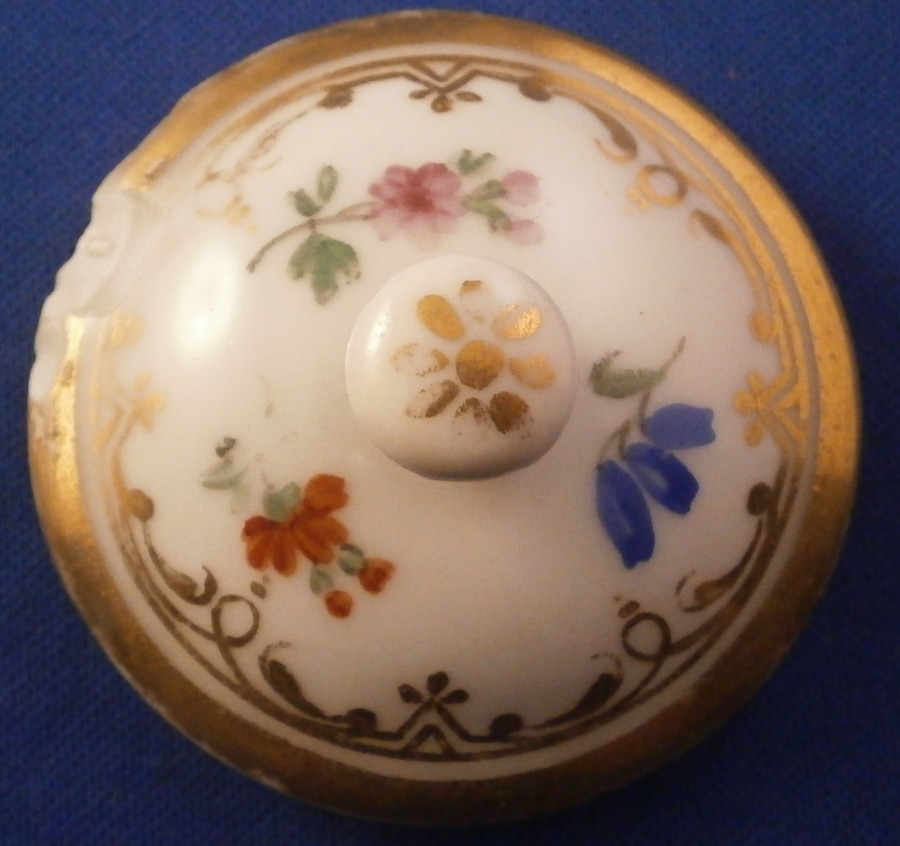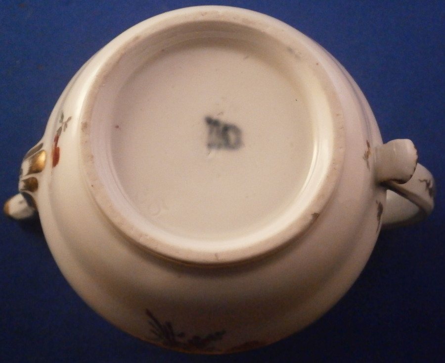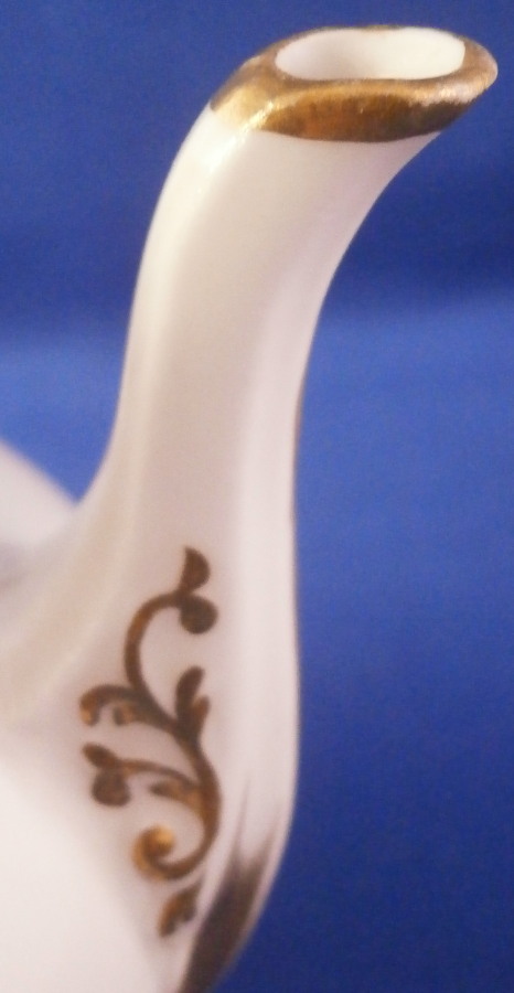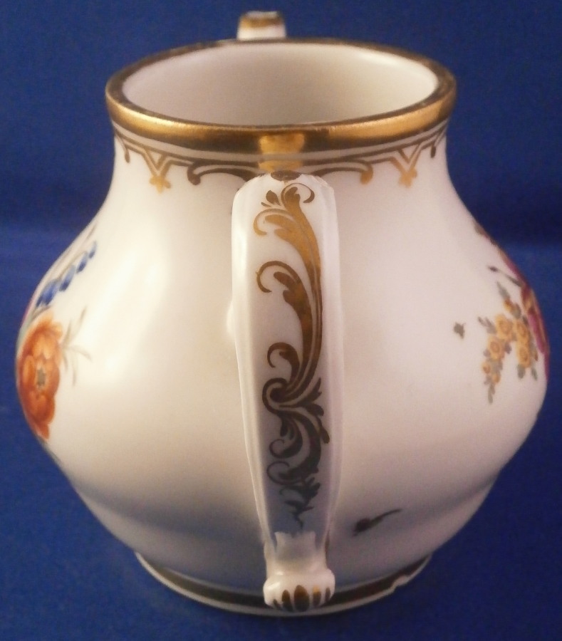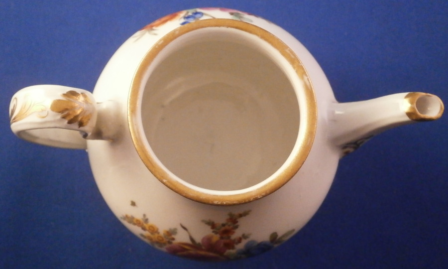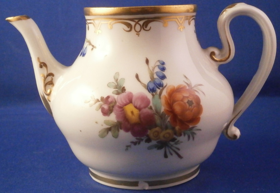 This is a fun little teapot made by Royal Vienna in the 18th century. Not sure if the number is a date code or another number. Likely from a solitaire or a bachelor tea pot. It is hand painted with a nice floral arrangement to the front and back as a couple of single small flowers and a really nice gold trim. The lid has three small single flowers to it as well as the same gold trim. Nice ahndle and spout shape with some nice gilding to them as well! The pot is in good condition but has some issues. There are two small chips to the bottom edge of the main body which could be hidden well with a touch of gilding. The lid has some chips to the edge as shown. Mainly in one area which could be restored quite easily. The teapot is 4 inches tall (including the finiale), 5.125 inches from handle to spout end and about 3.5 inches in diameter. The bottom is marked with the under glaze beehive / shield mark as well as an impressed number - it could be an 85 for 1785 but I think this piece was made before they used the date codes and it is probably a 35 person that made the teapot. Please email me for more information or photos.