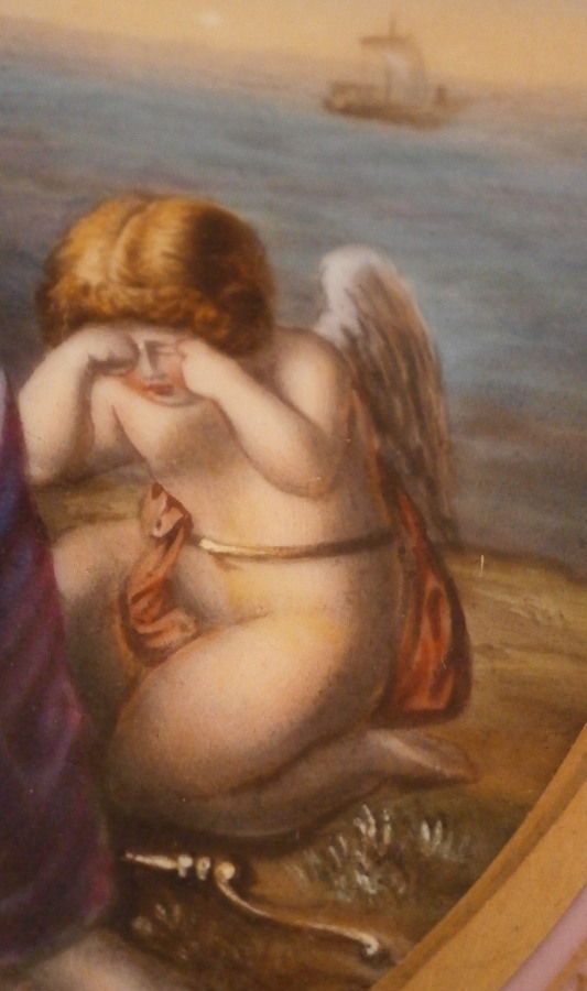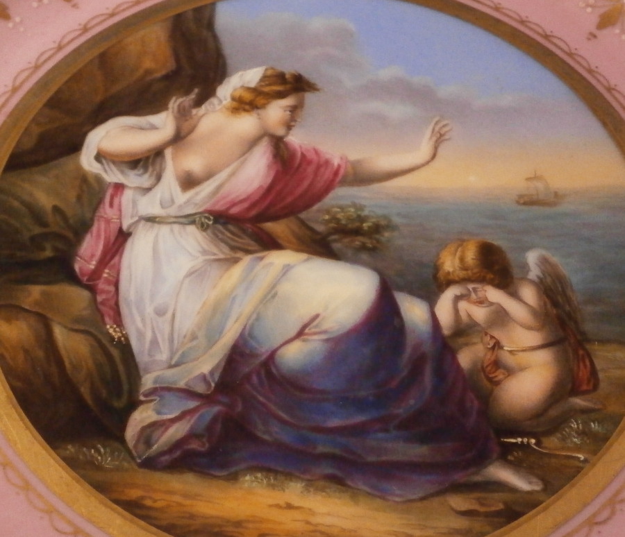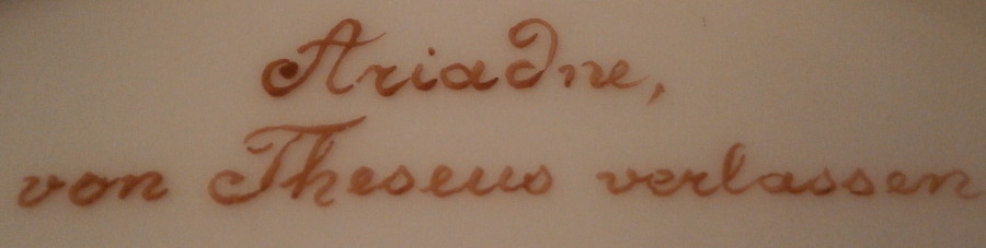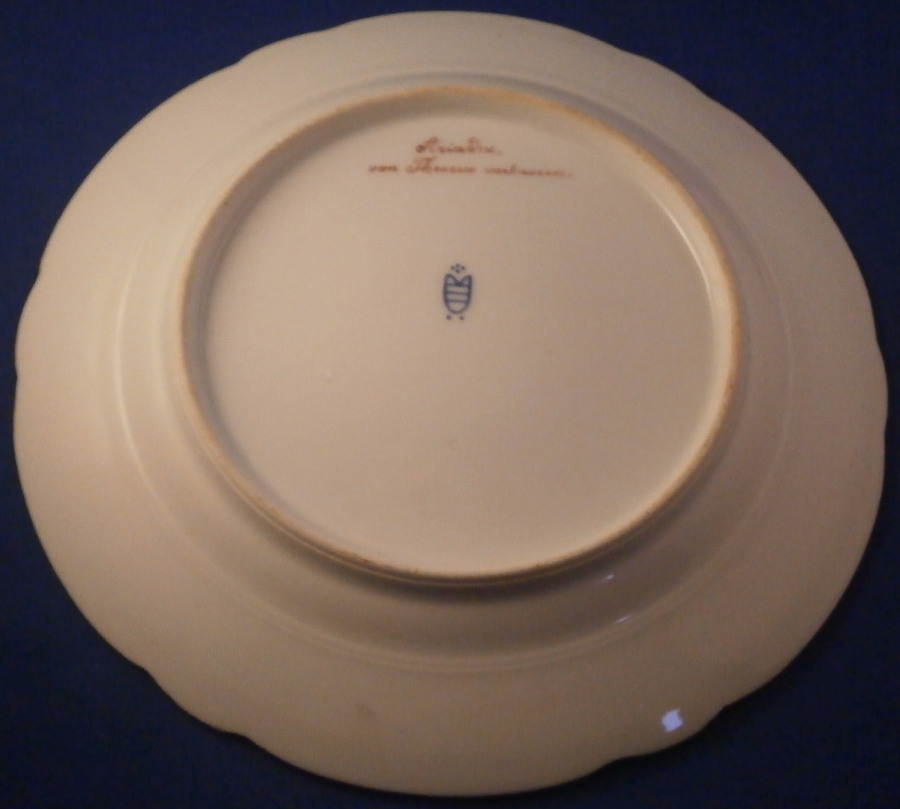 This is a nice plate made by one of the many factories copying the Royal Vienna beehive / shield mark. This one was made in the late 19th / early 20th century in Austria or possibly Germany ! The center is hand painted with a nice scene of Amor and Ariadne titled Ariadne von Theseus verlassen . I have seen these scenes also labelled as Ariadne mourning (or greiving) . Seems that the story behind that has different interpretations so if you are interested look it up online. A good quality scene! The rim has a pink ground color which is a bit unusual with the typical fancy gold designs on top and some raised white enamel dots. Looks great! These types of plates are very elegant and decorative which is why they are so popular. The plate is in perfect condition with jsut some very minor use marks to the gilding. It is 9.375 inches in diameter and 1 inch tall so a very nice size. It is marked with a blue shield / beehive type mark underneath as well as the title Ariadne , von Theseus verlassen in red, an imprssed number 5, another impressed mark I cannot make out and an area where the glaze is gone and one can see a faint residue of another beehive mark. Please email me for more information or photos.