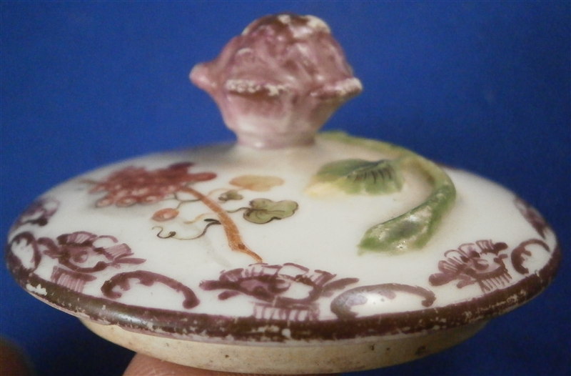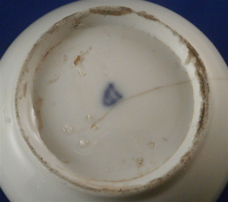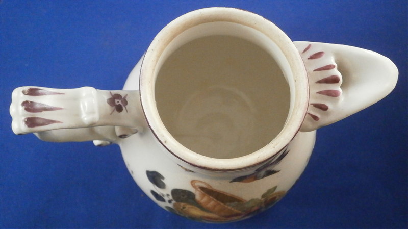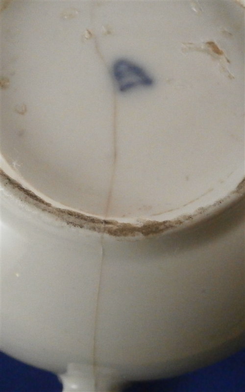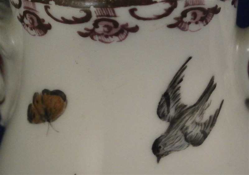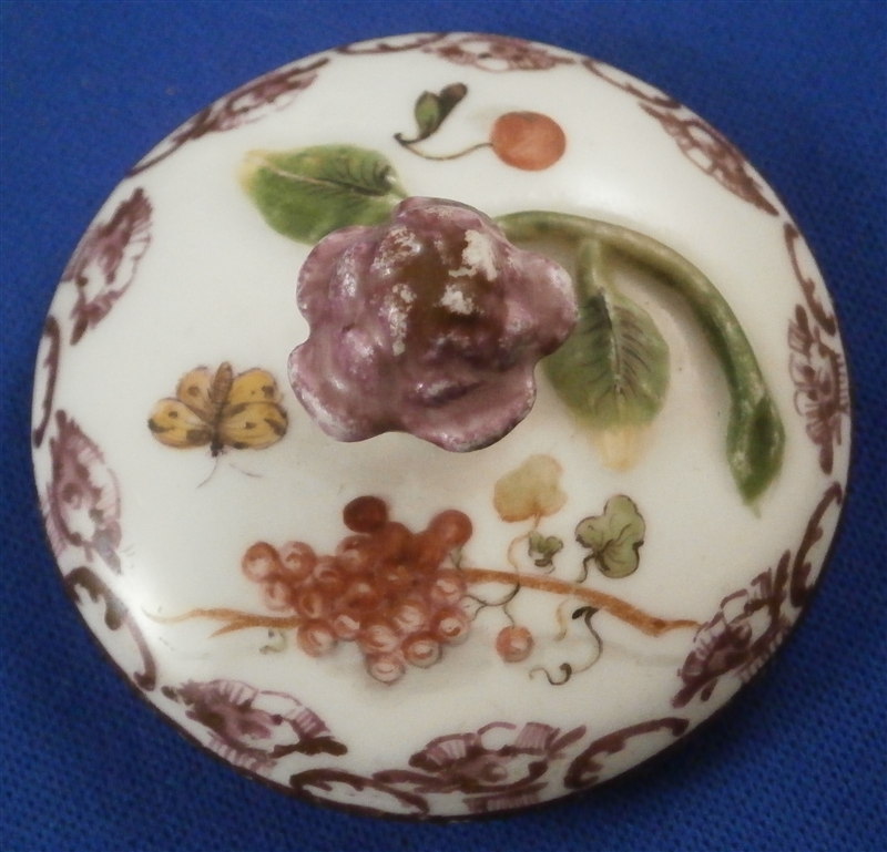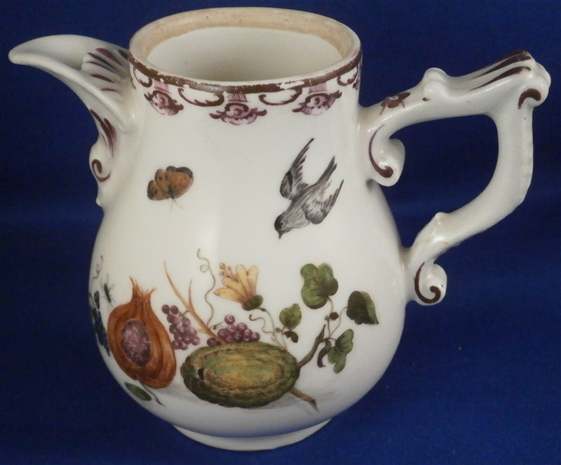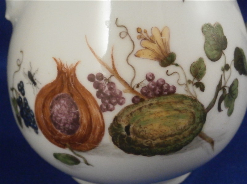 This is a really nice treat - a little pot with its original lid made during the very beginning of the Vienna factory around 1744. This piece is hand painted with two really detailed fruit still life scenes, two birds and a three butterflies as well as some nice puce trim to the edge as well as the spout and handle. Nice floral finial to the top. The scenes are amazingly well painted and even have the shadows udnerneath that one rarely ever sees except on Meissen from about 1740. Some of the best painting I have ever come across! The pot is marked with the under glaze blue shield / beehive mark as shown. It displays perfectly from either side but does have a long hairline crack that goes from the underside up the handle side and even through the bottom end of the handle which I have never seen before before underneath the top terminal of the handle. Perfectly stable so it won't get worse. Little bit of wear but really a rare and superb example even with the issue. The piece including the lid is 4.75 inches tall and has a diameter of about 3.25 inches and is about 4.75 inches from handle to spout. Please email me for more information or other pictures.