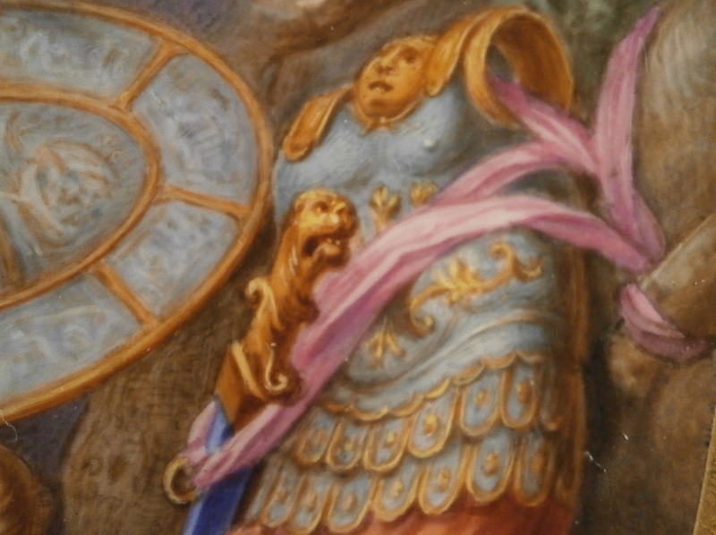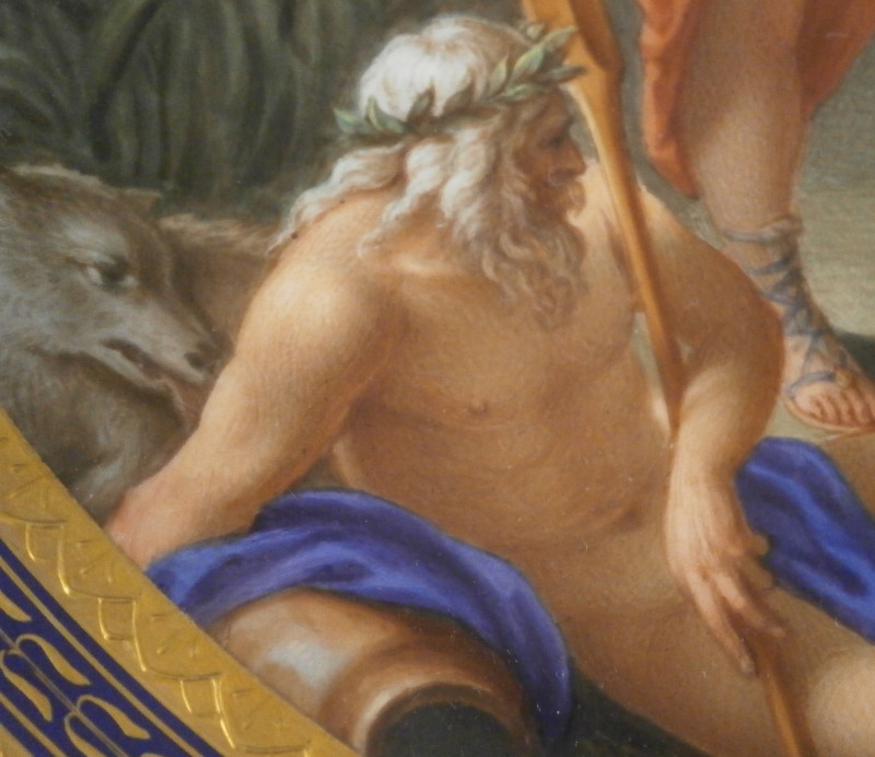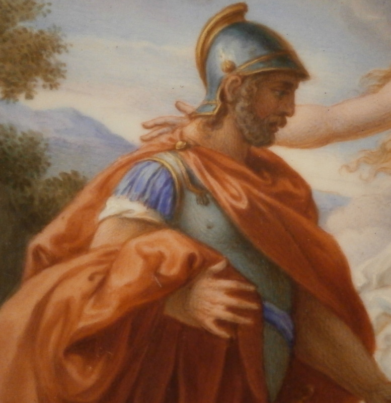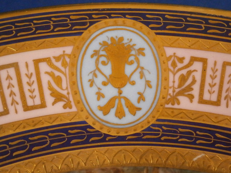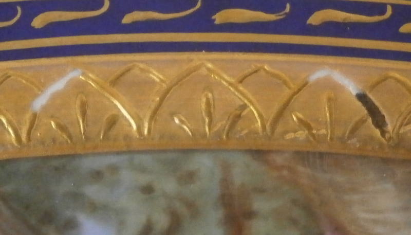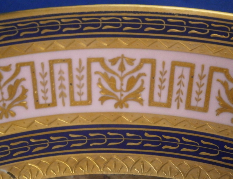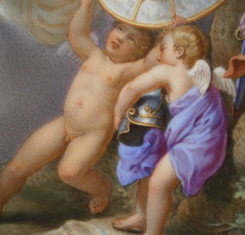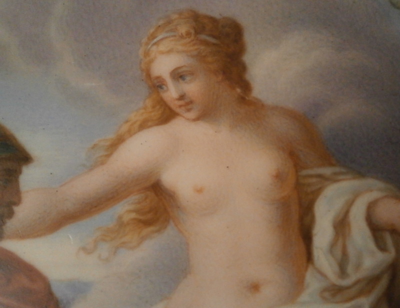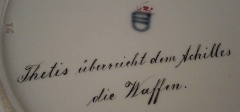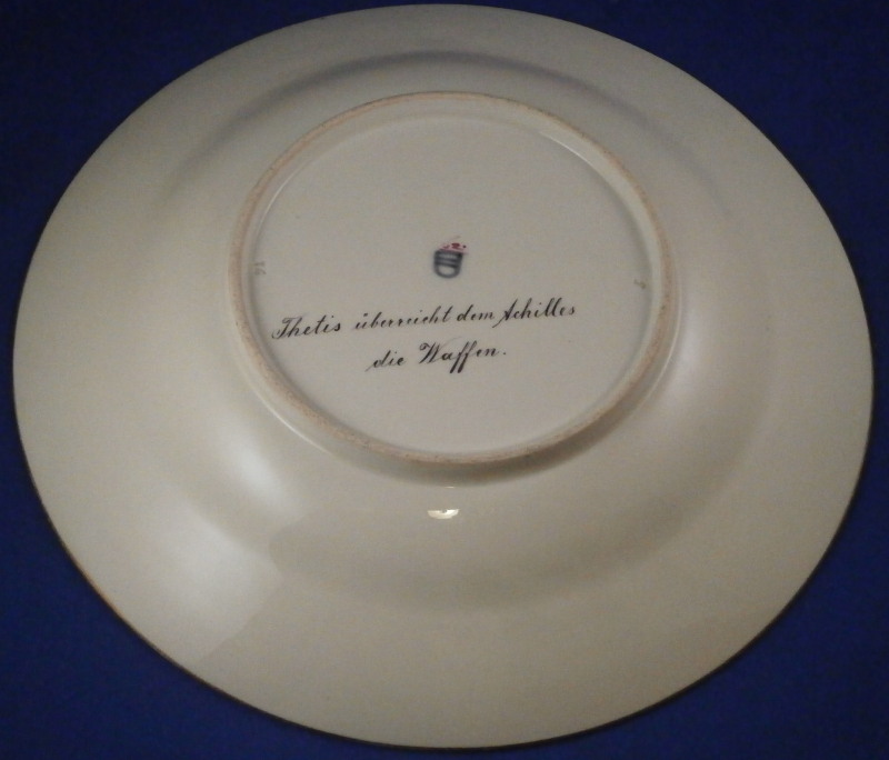 This is a very rare treat - a porcelain scenic or picture plate made by Royal Vienna in the late 18th century. Yes this is an authentic piece and not one of the thousands of copies one sees all the time. These real pieces are extremely rare and much nicer than the later copies. The center has a mythological type scene in it titled Thetis ueberreicht dem Archilles die Waffen (Thetis gives Achilles the weapons). Thetis is the goddess of water and Achilles is her son. A top notch scene with Thetis being half nude with a cloth just across her mid section but her breasts exposed, Archilles is being given a shield by two cherubs with his armor and swords hanging on the tree behind them and an older mostly nude gentleman lying on the ground with a dog behind him. Some nice scenery all around and the tupical rim design including pink and cobalt blue ground color with some nice gold designs on top much of which is raised. This is one the nicest and best quality scenes I ahve seen on a plate by them. The plate is in superb condition with a tiny bit of wear to the gilding in two or three minor spots. Some use marks but nothing that impacts the piece and it displays perfectly! The plate is just over 9.5 inches in diameter and 1.5 inches tall. It is marked with the underglaze blue shield mark underneath as well as two impressed numbers as shown, a painter's mark 62. and another 86. plus the title of the scene as I ahve already mentioned in black. Please email me for more information or photos.