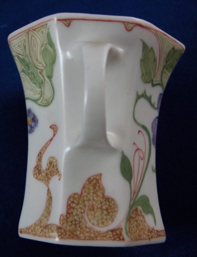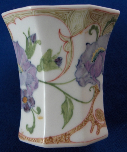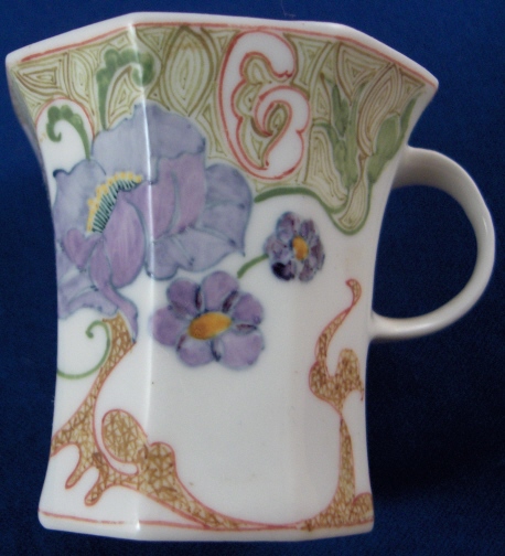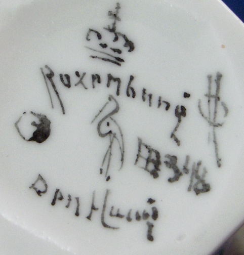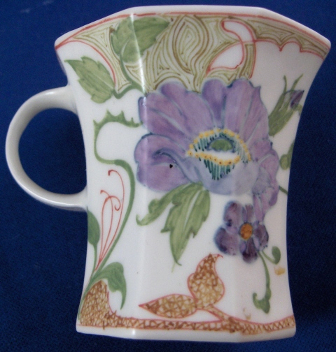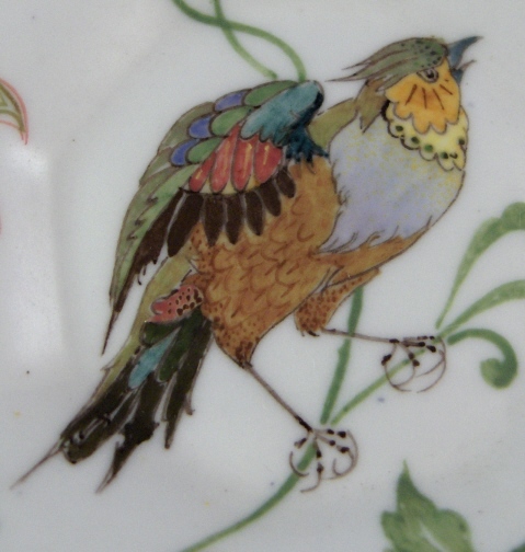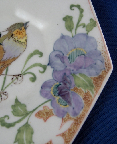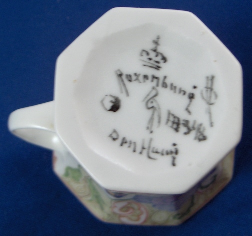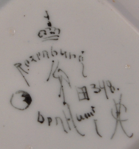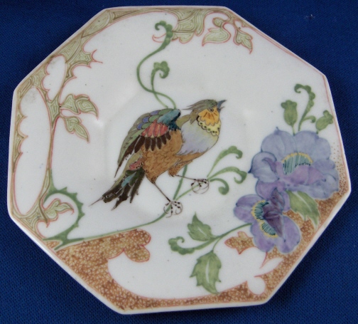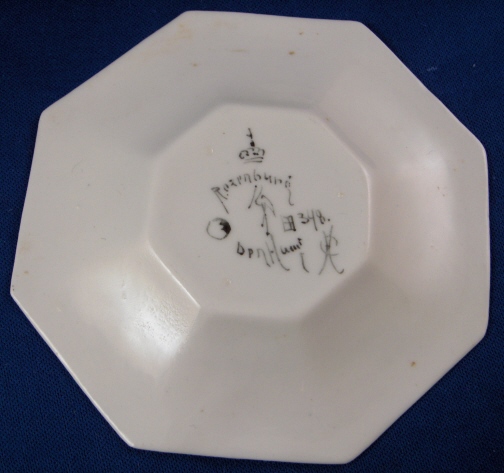 This is a superb cup and saucer made by Rozenburg in the early 20th century. I always wanted to have one like this but never thought I would be lucky enough to find a perfect example! Rozenburg eggshell porcelain was only made from about 1900 until 1914 and is about as Art Nouveau as you can get! They were situated in The Hague, Holland's seat of government. The eggshell porcelain is amazingly thin and delicate unlike anything else you can find in the world of European porcelain! The set is handpainted with a superb floral and bird design that fits the shape of the pieces perfectly. The set is in perfect condition which is not common at all due to the thinness of this porcelain. It is actually the first piece I have seen that was perfect but it is so rare that I haven't seen much of it by any means. Both pieces are marked with the black Rozenburg Den Haag mark with the stork in the middle as well as the usual artist and year marks, etc. The cup is just under 2.25 inches tall and 2.375 inches in diameter. The saucer is 0.375 inches tall and 4.375 inches in diameter. A Dutch collector buddy of mine gave me more info on the set - the painter is C.w.j. ’t Hart, the mark is a C in the middle of an H and the year mark that looks like a moon was used from Janurary until July of 1914. It is called eggshell porcelain, but in fact it is very thin earthenware. Learned something new - again :) Please email me for more information or other pictures.