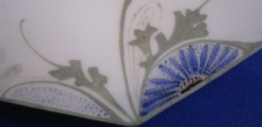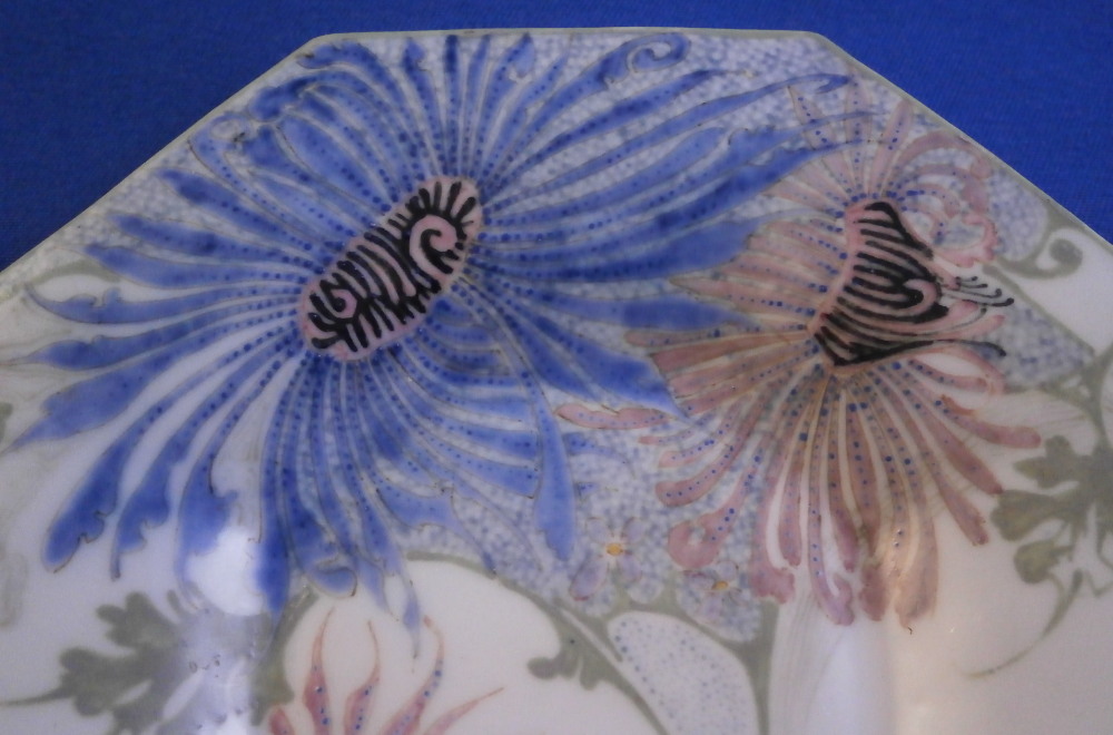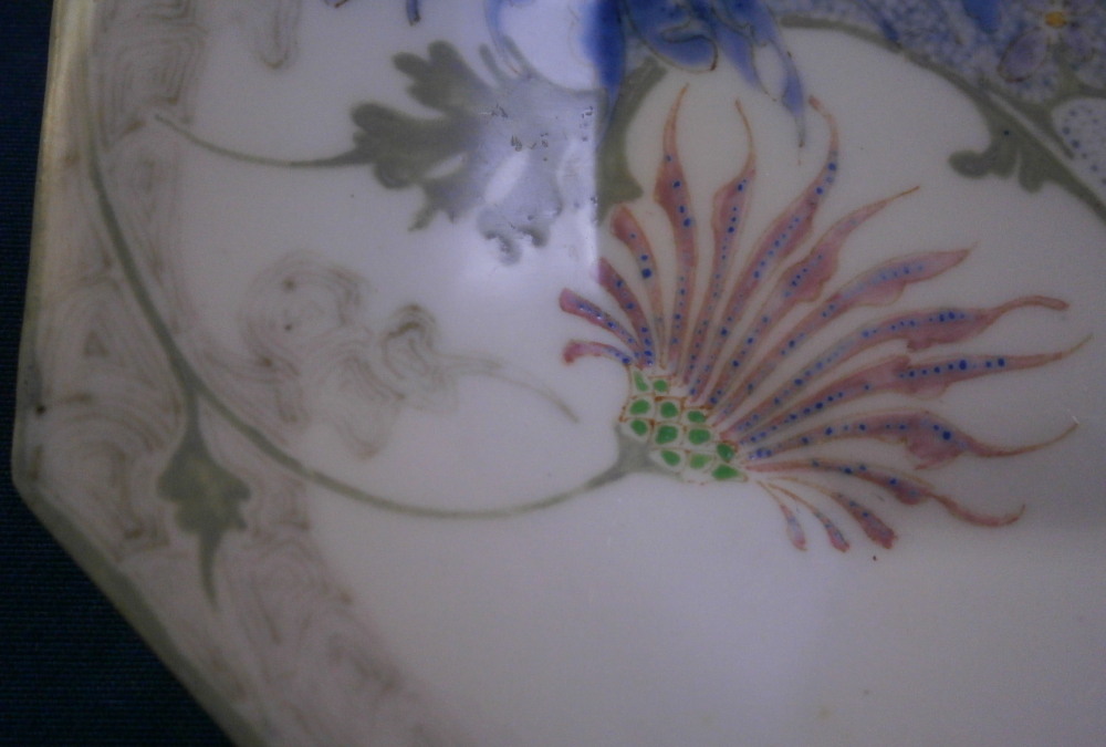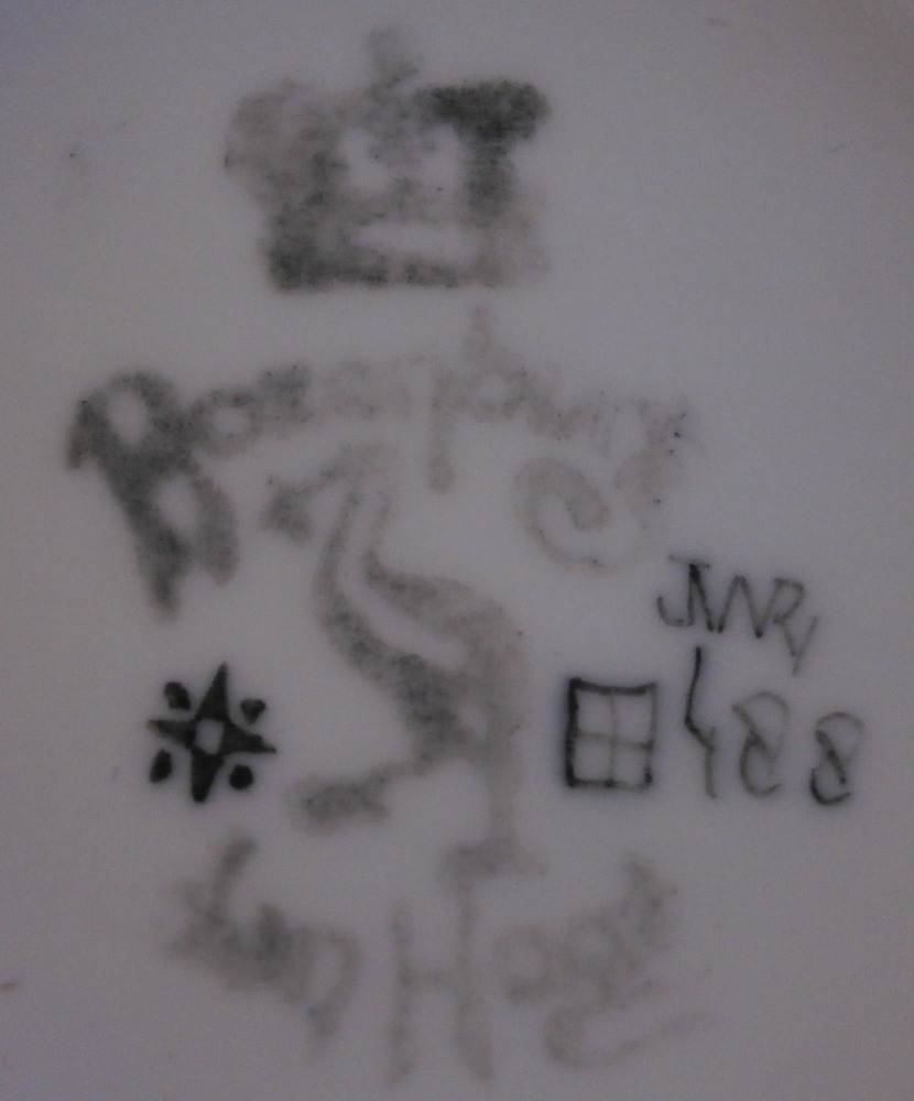 This is a superb saucer made by Rozenburg in the early 20th century - 1903 if I figured the date code out correctly. Rozenburg eggshell "porcelain" was only made from about 1900 until 1914 and is about as Art Nouveau as you can get! It is called eggshell porcelain , but in fact it is very thin earthenware. They were situated in The Hague, Holland's seat of government. Their eggshell porcelain is amazingly thin and delicate unlike anything else you can find in the world of European porcelain and the designs are amazing! The saucer is hand painted with a superb floral design that fits the shape of the piece perfectly. The piece is in superb condition with a couple of small scratches to the glaze but no chips, hairlines, crazing or repairs which is rare as this stuff is so fragile! The piece is marked with the black Rozenburg den Haag mark with the stork in the middle as well as the usual artist and year marks, etc. as shown. The saucer is 0.375 inches tall and 4.375 inches in diameter. So for a demitasse cup. Please email me for more information or other pictures.