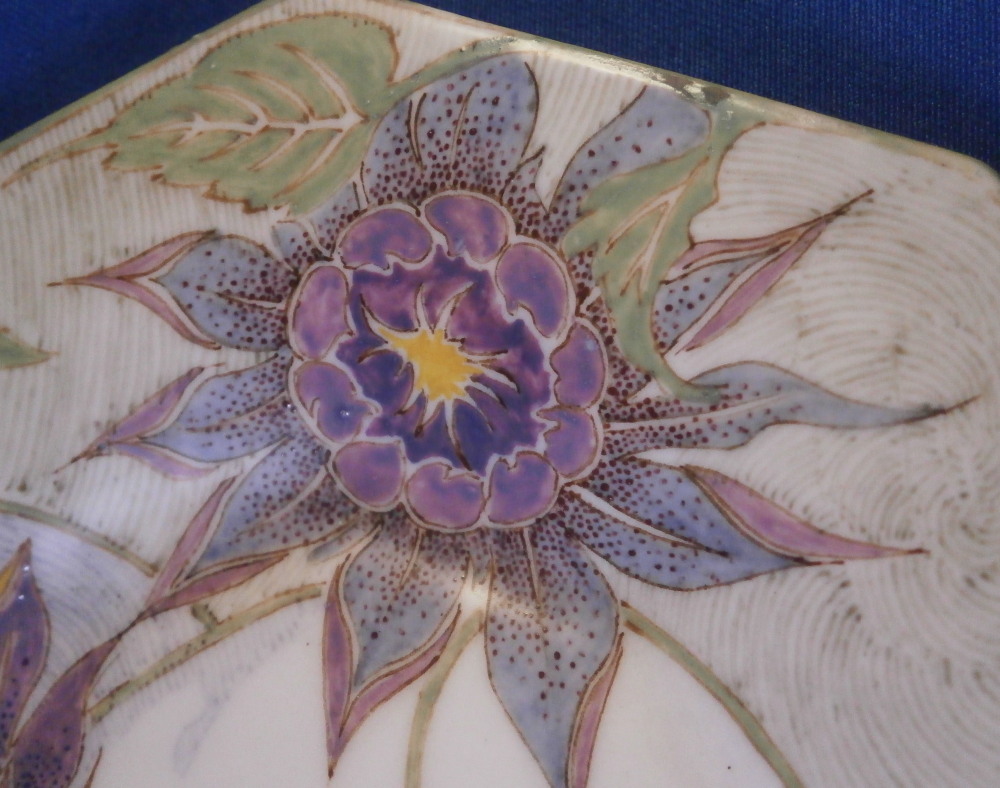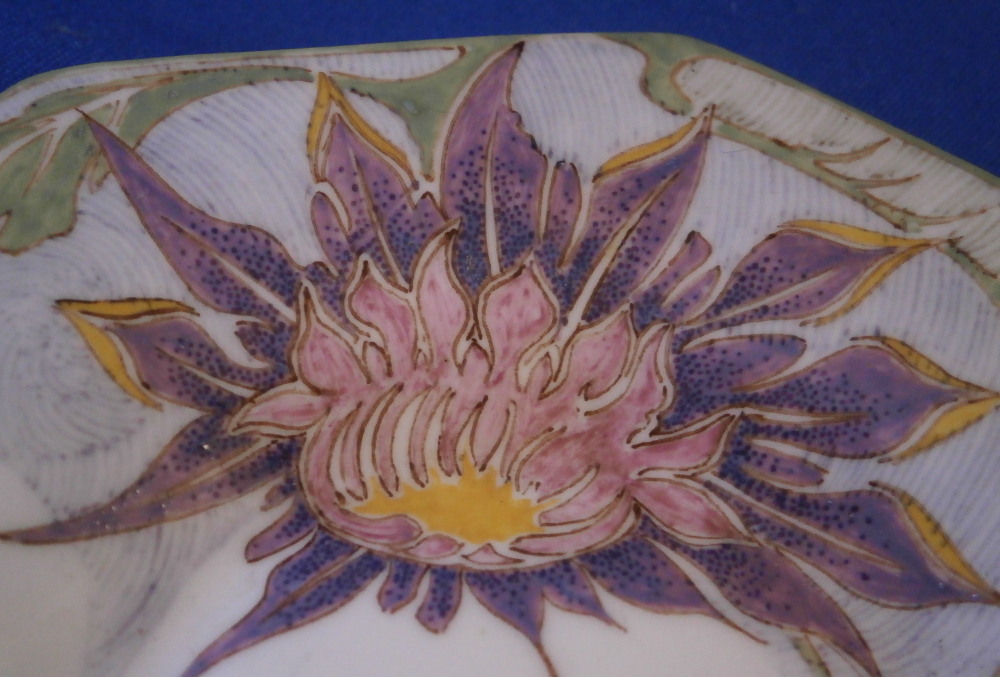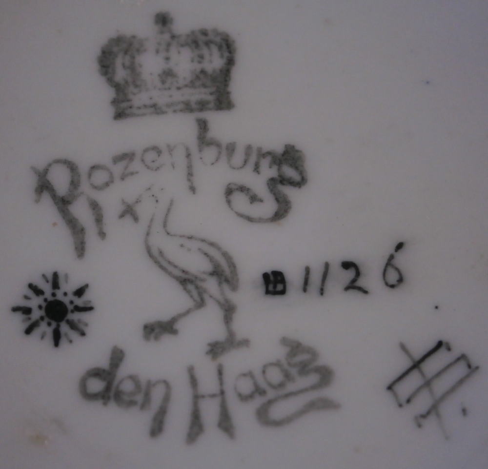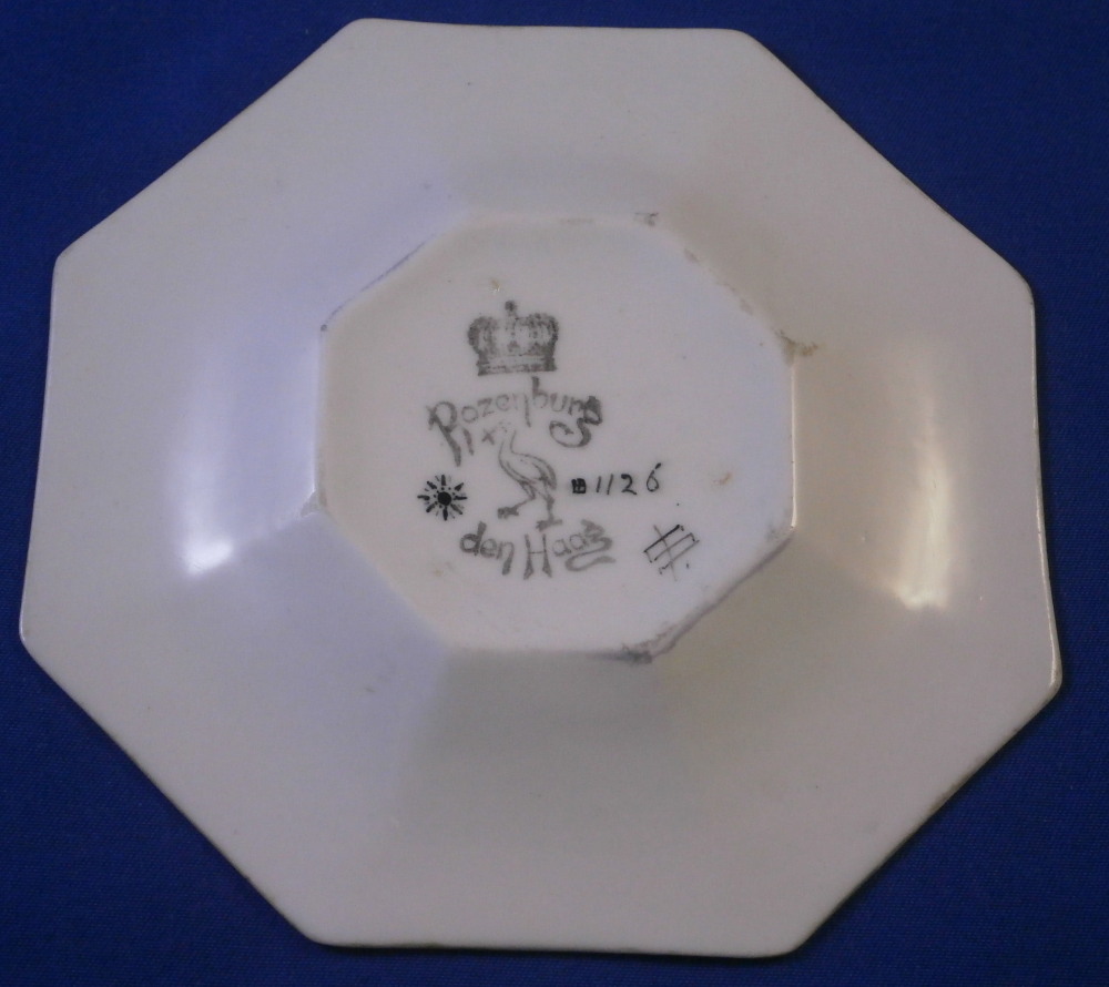 This is a superb saucer made by Rozenburg in the early 20th century - 1901-1902 if I figured the date code out correctly. Rozenburg eggshell "porcelain" was only made from about 1900 until 1914 and is about as Art Nouveau as you can get! It is called eggshell porcelain , but in fact it is very thin earthenware. They were situated in The Hague, Holland's seat of government. Their eggshell porcelain is amazingly thin and delicate unlike anything else you can find in the world of European porcelain and the designs are amazing! The saucer is hand painted with a superb floral design that fits the shape of the piece perfectly. The piece is in perfect condition which is not easy to find as many have hairlines or chips due to their delicate nature. The piece is marked with the black Rozenburg den Haag mark with the stork in the middle as well as the usual artist and year marks, etc. as shown. I think the painter's name is Samuel Schellink who is one of their more influential painters. The saucer is 0.375 inches tall and 4.375 inches in diameter. So for a demitasse cup. Please email me for more information or other pictures.