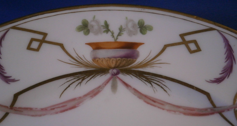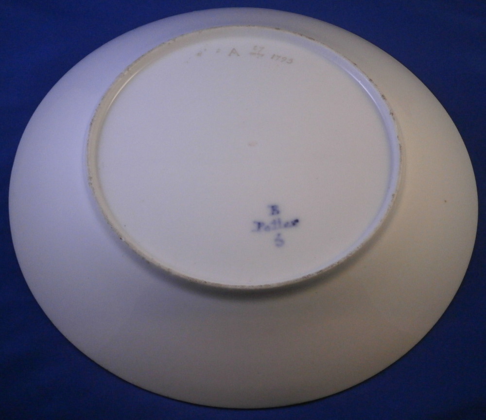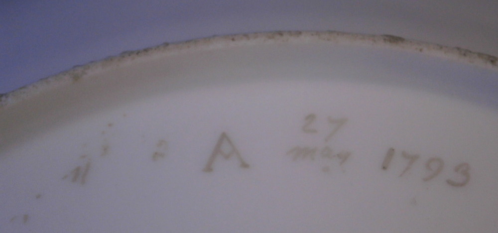 This is really nice plate made by Rue de Crussol of the Paris region in the late 18th century. The Englishman Christopher Potter started the factory in 1789 and it ran until the 19th century sometime around 1819. So not very long. Here we have an unusually well dated example which I have not seen before. It dates the piece to the 27th of May 1793. So a fairly early piece for this maker! The duchess of Berry was a patron of this maker which helped it get off the ground. Very well thought of by collectors and there was even a book written on this maker a few years back if I recall correctly. The plate is superbly hand painted with a very fancy quite modern looking design around the rim including pot with white roses growing out of them. The well has lots of tiny gold leaves scattered throughout. A really fancy looking plate! The piece is in superb condition with the pink drapes hanging from the center of the flower pots to the gold garland hooks did not fire properly but since it is even all around it looks part of the design and does not take away from it. These things happen on these early wares! All part of the charm of 18th century porcelain! The plate is marked underneath with the under glaze B over POTTER over 5 mark and the black markings n then some I cannot make out, a capital A and 27 may 1793. Maybe it was a design example specimen never meant to be sold. Like I said I have not seen one with this exact a date mark except on a plate I jsut listed as well. These two came together so that makes sense. The plate is 1.375 inches tall and 9.625 inches in diameter. A nice size and a really nice looking example! Please email me for more information or other pictures.