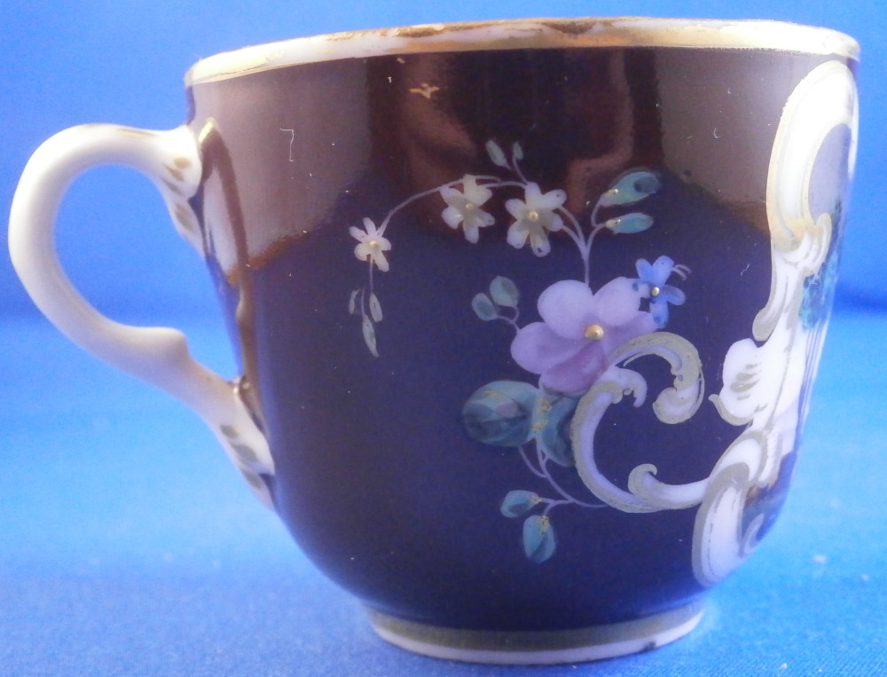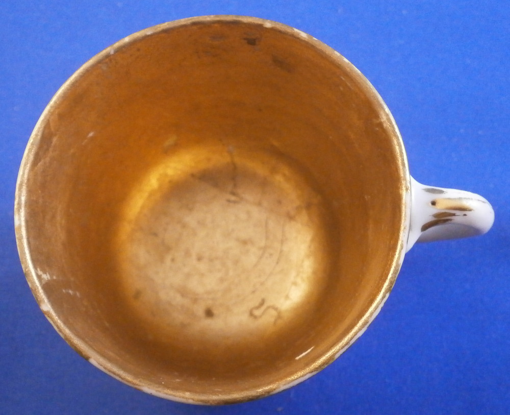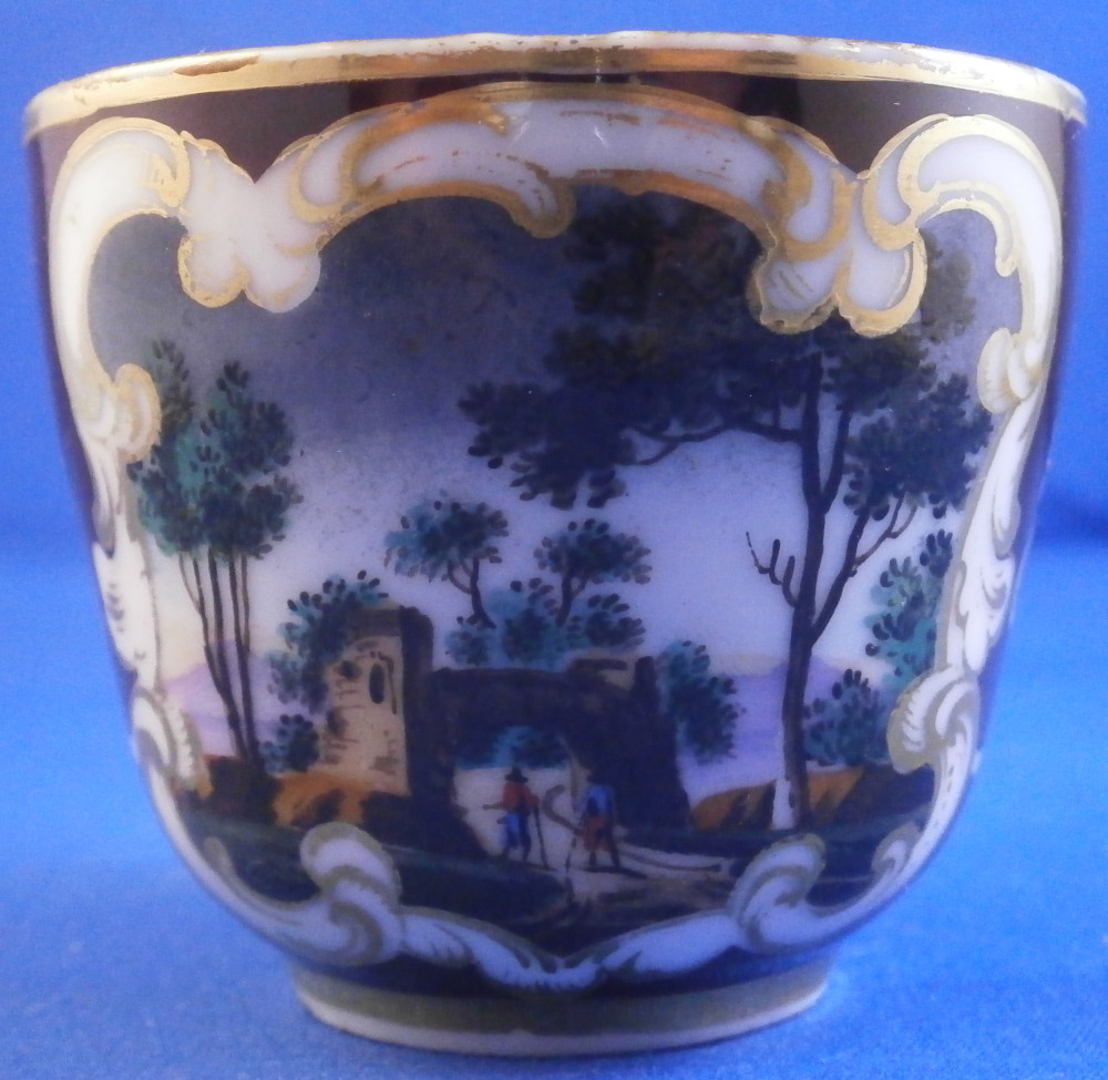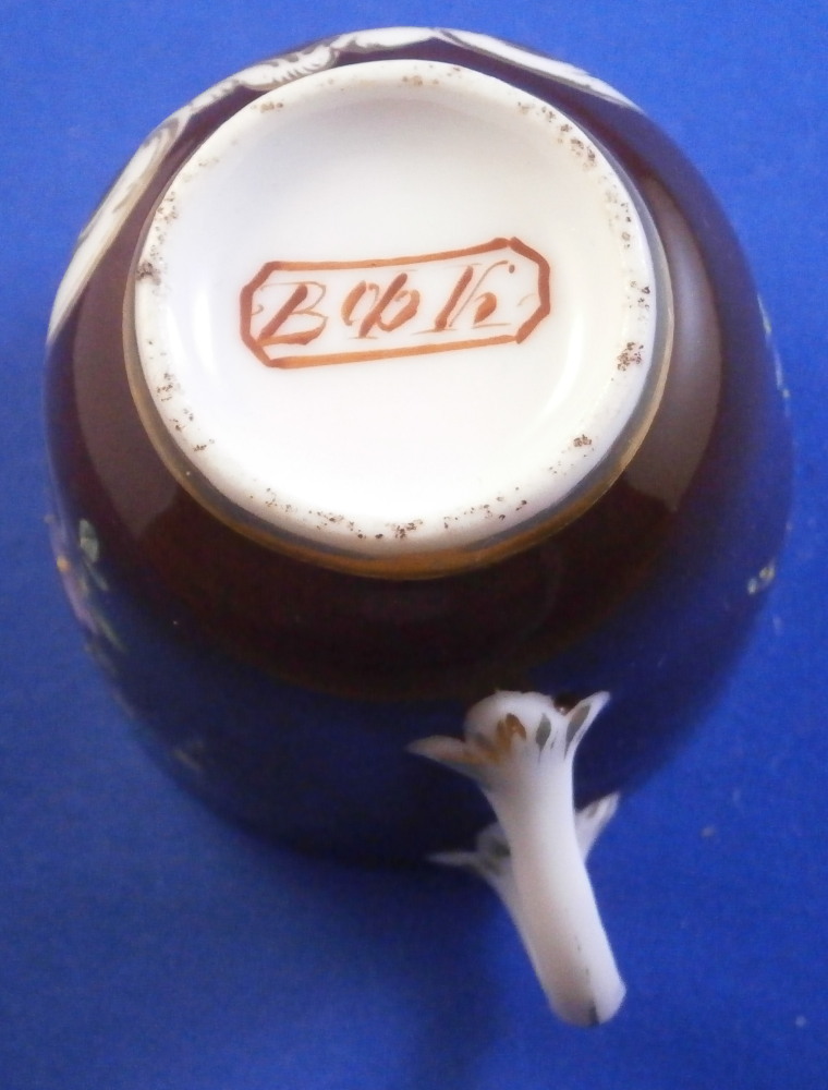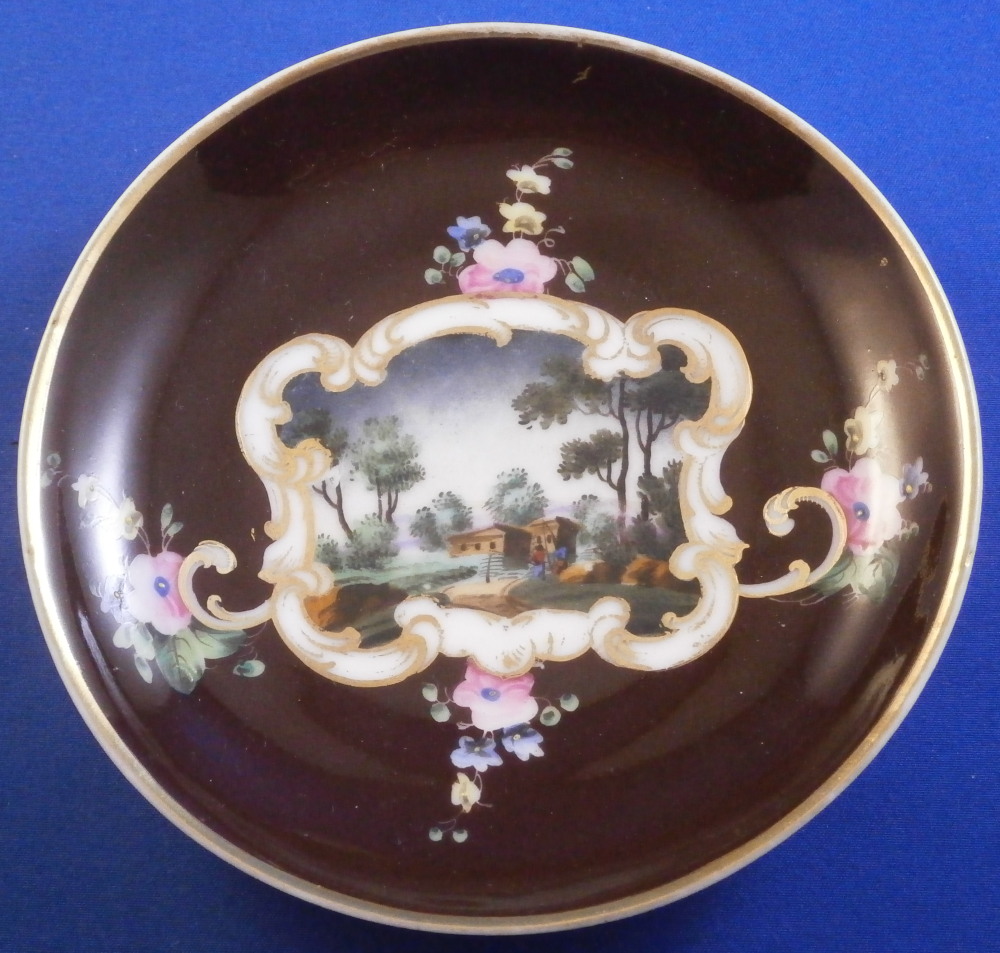 This is a superb cup and saucer made in Russia the 19th century. In my search for this maker I came up mostly empty except I heard there are some known sauce boats by the same maker. If anyone out there knows anything I'd appreciate a quick email! Either way it is a very nice made set and even without looking at the mark one would know it is Russian! The piece has a nice chocolate rbown ground color to it with a superb scene in the center of the saucer and front of the cup. All hand painted including buildings and people in a landscape surrounding. The scenes are surrounded by a scroll frame highlighted with gilding and there are flowers coming out of the frame into the brown ground. Gold trim to the edge and the inside of the cup is fully gilded. White handle to the cup highlighted with some gilding. The saucer is in great condition with just a touch of wear to the gilding along the edge. The cup is in good condition but it looks odd on the inside. Either it was originally not fully gilded on the inside or (and I suspect this is the case) it was worn quite heavily and someone has tried to regild the inside possibly with gold leaf as it is uneven and a little rough to the touch with lines in it. It's not overly pretty on the inside only but there are no chips or restorations. I used my super bright light to look through the paste and looked for any actual porcelain issues and found none. The edge gilding is worn just like on the saucer. So all in all the set is in really good condition. They display perfectly as long as you can't look inside the cup and look stunning! Both pieces are marked underneath with the red Russian / cyrillic letters in a red box. A mark I could not find anywhere in all my books. The saucer is 1 inch tall and 4.875 inches in diameter. The cup is just over 2.125 inches tall and has a diameter of 2.625 inches. Please email me for more information or other pictures.
