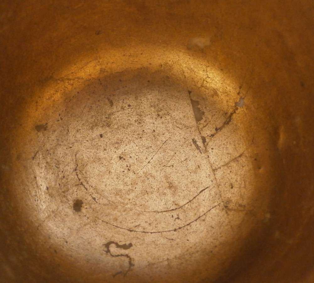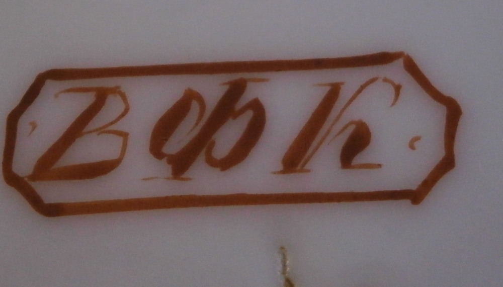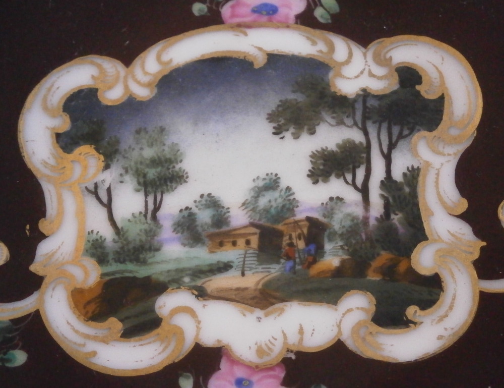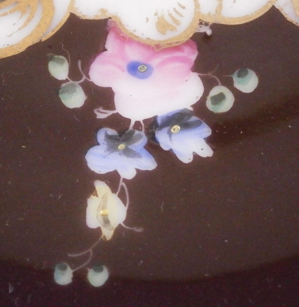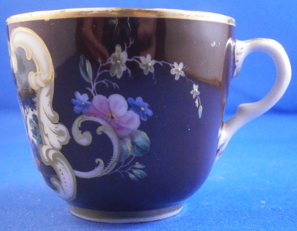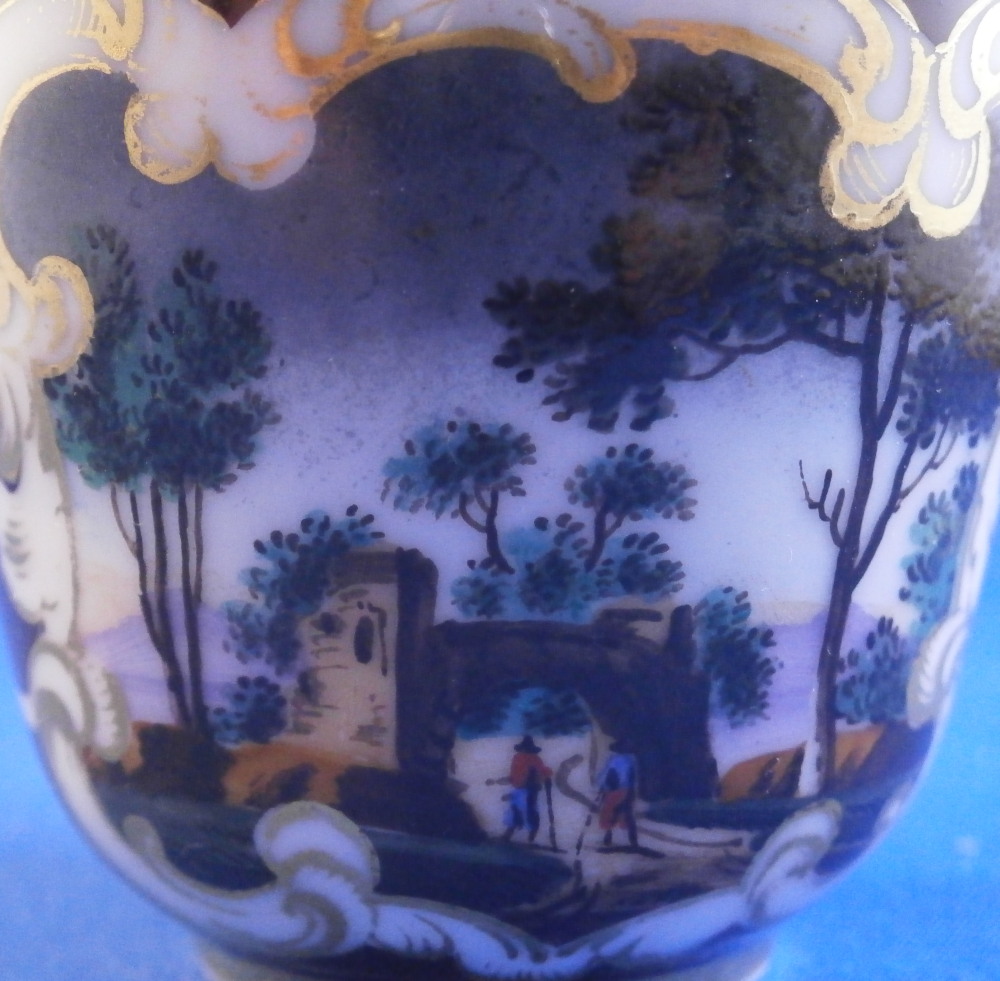 This is a superb cup and saucer made in Russia the 19th century. In my search for this maker I came up mostly empty except I heard there are some known sauce boats by the same maker. If anyone out there knows anything I'd appreciate a quick email! Either way it is a very nice made set and even without looking at the mark one would know it is Russian! The piece has a nice chocolate rbown ground color to it with a superb scene in the center of the saucer and front of the cup. All hand painted including buildings and people in a landscape surrounding. The scenes are surrounded by a scroll frame highlighted with gilding and there are flowers coming out of the frame into the brown ground. Gold trim to the edge and the inside of the cup is fully gilded. White handle to the cup highlighted with some gilding. The saucer is in great condition with just a touch of wear to the gilding along the edge. The cup is in good condition but it looks odd on the inside. Either it was originally not fully gilded on the inside or (and I suspect this is the case) it was worn quite heavily and someone has tried to regild the inside possibly with gold leaf as it is uneven and a little rough to the touch with lines in it. It's not overly pretty on the inside only but there are no chips or restorations. I used my super bright light to look through the paste and looked for any actual porcelain issues and found none. The edge gilding is worn just like on the saucer. So all in all the set is in really good condition. They display perfectly as long as you can't look inside the cup and look stunning! Both pieces are marked underneath with the red Russian / cyrillic letters in a red box. A mark I could not find anywhere in all my books. The saucer is 1 inch tall and 4.875 inches in diameter. The cup is just over 2.125 inches tall and has a diameter of 2.625 inches. Please email me for more information or other pictures.