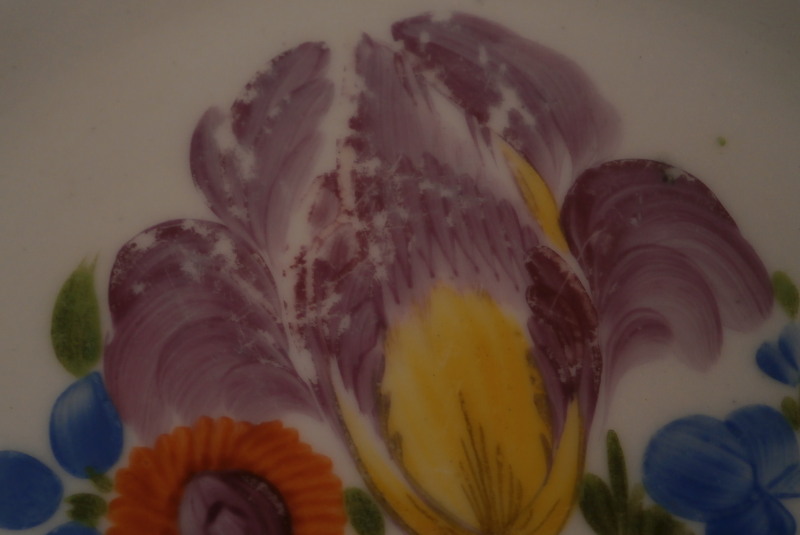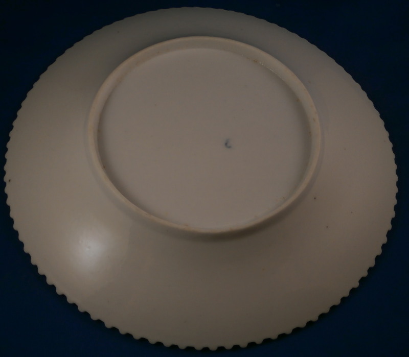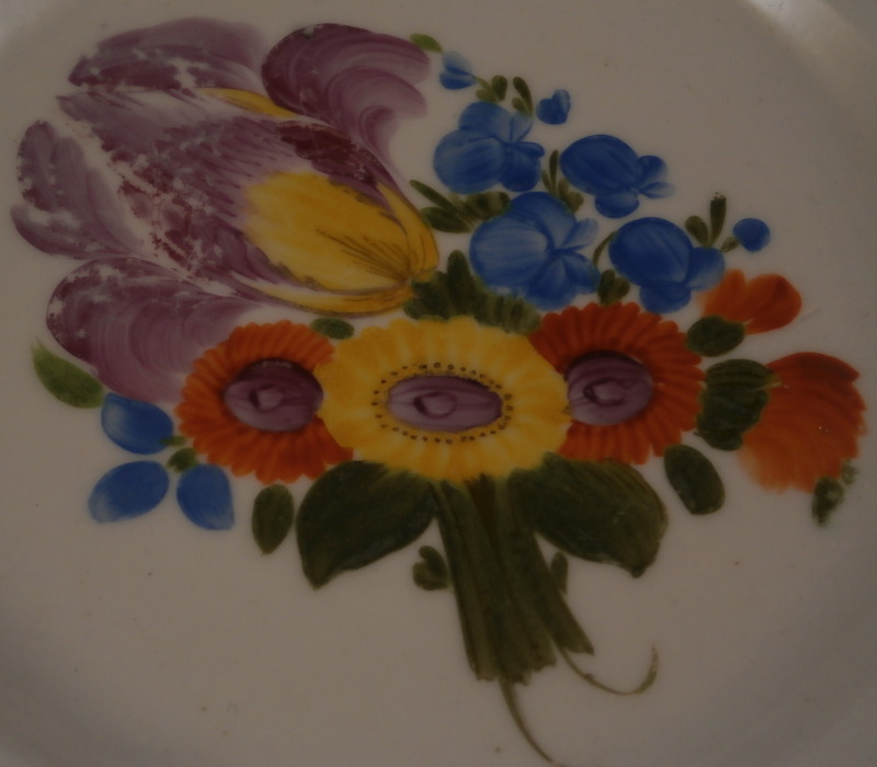 This is a porcelain plate made in Russia in the early 19th century or maybe before that. I am unsure as to the exact maker but likely one of the smaller private factories like Safronow , Nassanow , Wsewoloshski , Poliwanow , etc. The plate is naively hand painted with a large floral arrangement in the center filling most of the well of the plate as well as three flowers to the rim. Nice edge with a "pearl" design to it.The plate displays nicely but has some wear to the large purple tulip and some stray paint marks in an area of the rim. Definitely and early plate and by one of the lesser known makers. Still a really nice example and not something you will find often. Just wish I knew the exact maker of this piece. It is marked with an under glaze blue mark as shown kind of like a script E. but I am not sure so have a look at it. The plate is 1.375 inches tall and 8.75 inches in diameter. Please email me for more information or other pictures.
