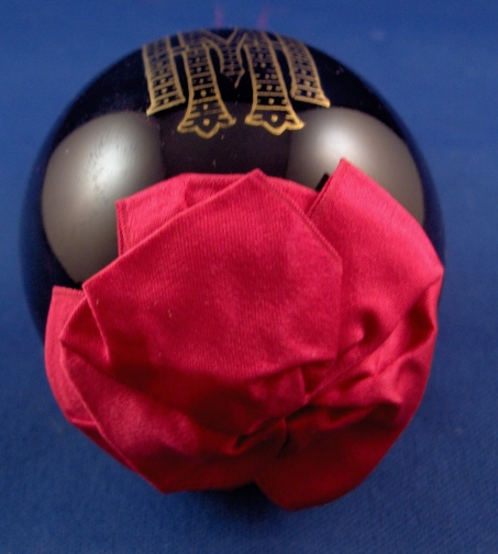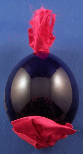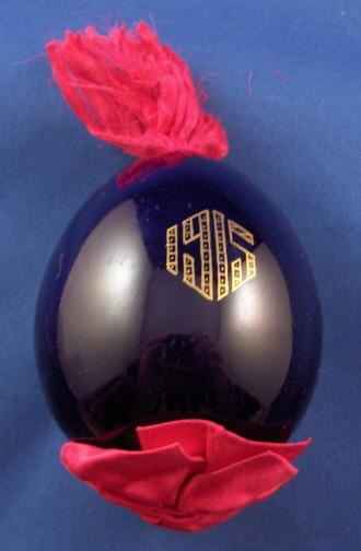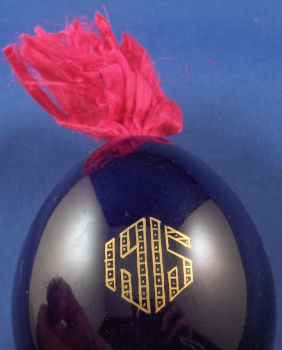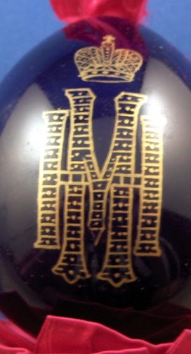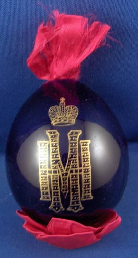 This is a very rare treat - a cobalt blue egg with the cypher of the Grand Duchess Maria Nikolaevna - third daughter of Nicholas II who was the last Tsar of Russia. She was born on June 26, 1899 and died (or was died) along with the rest of the family on July 17, 1918. The piece has a nice deep blue color and thus the gold artsy letters stand out very nicely. There is also a gold ring around the top hole. The front has the russian letters that look like H and M but are an M and an N in our alphabet. The back has the year 1915 on it. It does come with its original ribbon which was made of silk and has seen better days but it is there which is nice. The bottom bow part is perfect but the top is frayed and is very brittle or whatever you call it with fabric. The egg is about 2.5 inches tall and about 2.25 inches in diameter. It is not marked but these were never marked. A very rare egg and it is not even in the book on Russian Imperial Easter Eggs written by Tamara Kudriavtseva and Harold A. Whitbeck. I could only find one other example in my searches! Please email me for more information or other pictures.
