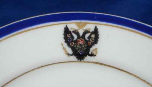 This is a porcelain plate from the Tsarskoe Selo service made by the famous St. Petersburg factory during the reign of Nickolas II. It is fairly simple compared to some of the other services I have seen but still very nice. Handpainted with a wide blue ring around the rim with a gold line on either side. Another gold line around the center well and the nice handpainted armorial of the Imperial Eagle at the top. The plate is in great condition with almost no wear at all. It is marked with the green N II mark under the crown with the year mark of 1915 underneath. The plate is 1 inch tall and 7.125 inches in diameter. Please email me for more information or other pictures.