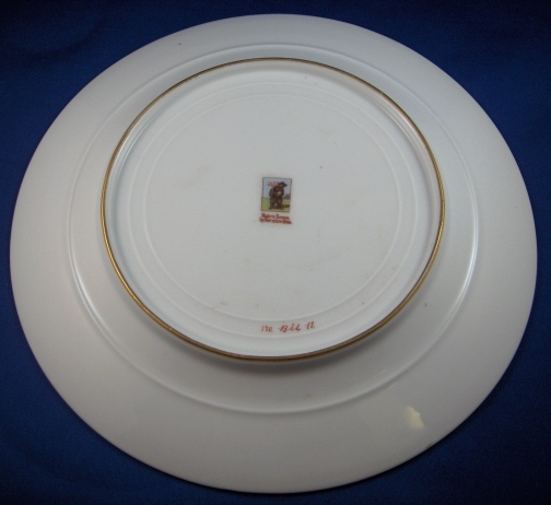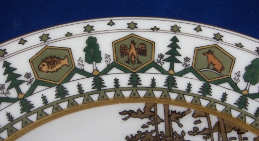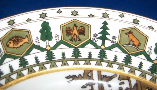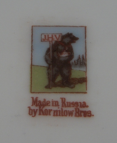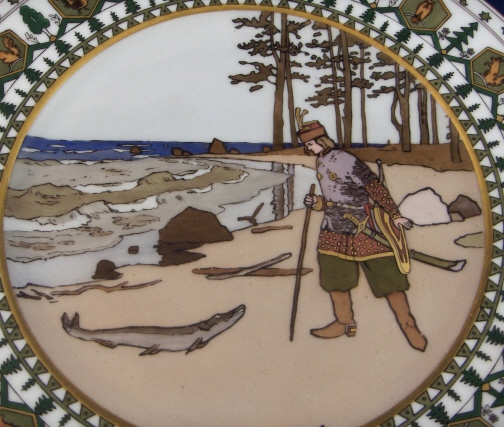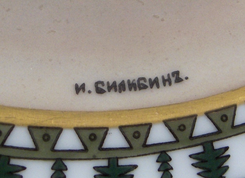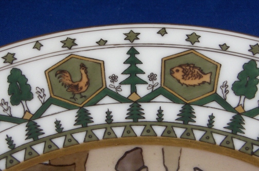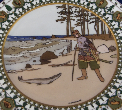This is a superb plate made at the Kornilov factory around 1900. The center is decorated with a nice scene from a Bilibin drawing featuring a young man, in this case a Russian prince who is looking for a pretty princess all over the world. During his journey he meets several animals in very difficult situations. He helps them and then the animals return the favors and help him reach the princess. This is one of the most important situation on this plate, when the great fish has been thrown out from the sea during the storm. The fish is asking for help and the prince throws the fish back to the sea after which the fish says: "Thank you, if you need my help, come to the sea anywhere all over the world, call me, and I will come." The rim is has a nice design of trees alternating with hexagons with animals in them. Nice gold trim to the rim. The plate is in perfect condition. It is marked as shown in the photo with the Bear and the words Made in Russia by Kornilow Bros. Also signed in the back 170. Bil 11. by Bilibin. It is a nice 10.25 inches in diameter and 1.125 inches tall. This piece belongs to a good friend of mine. Please email me for more information or other pictures.