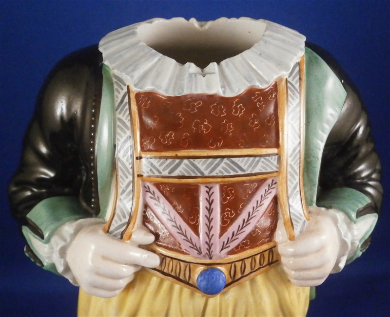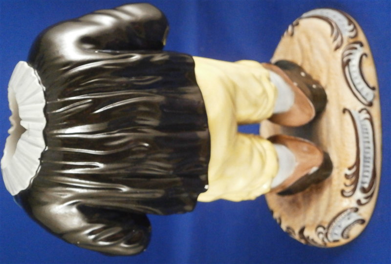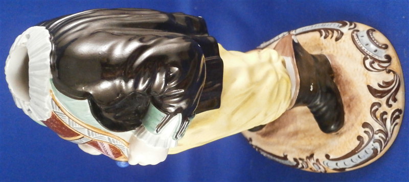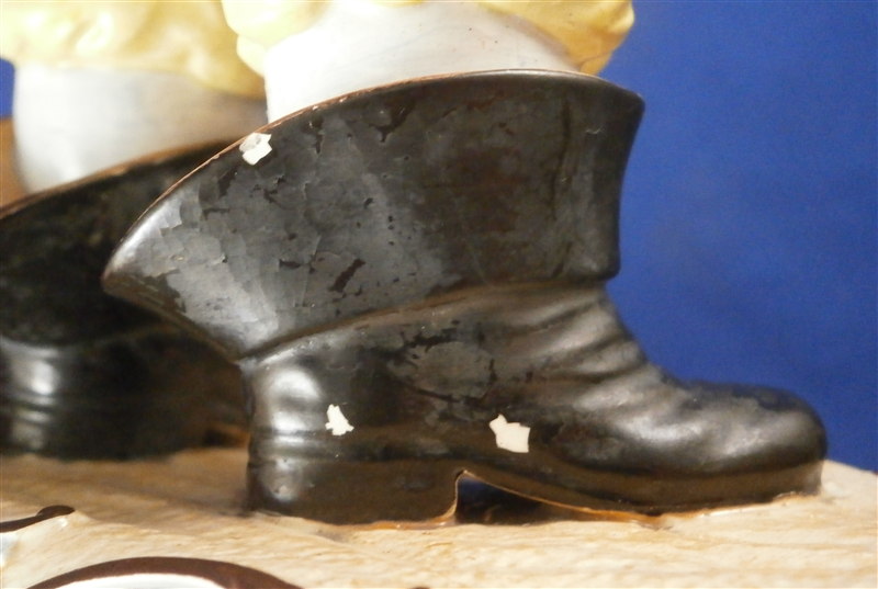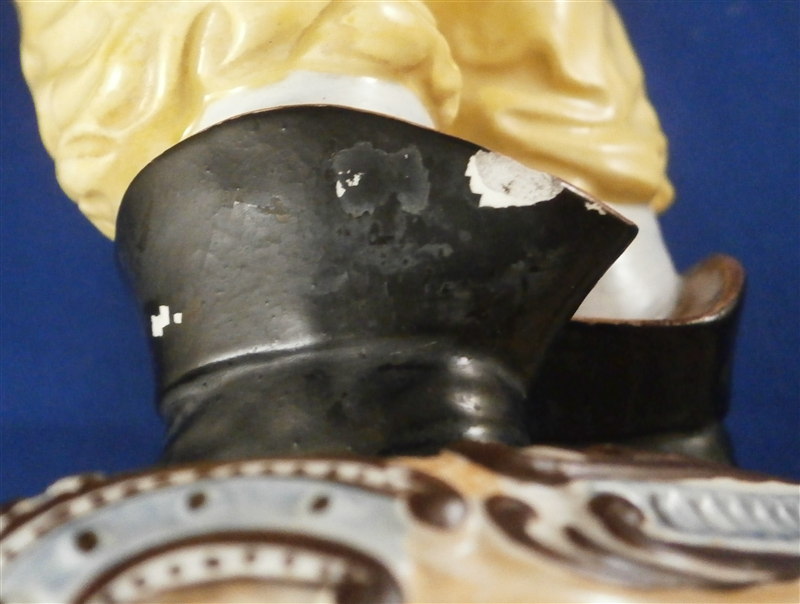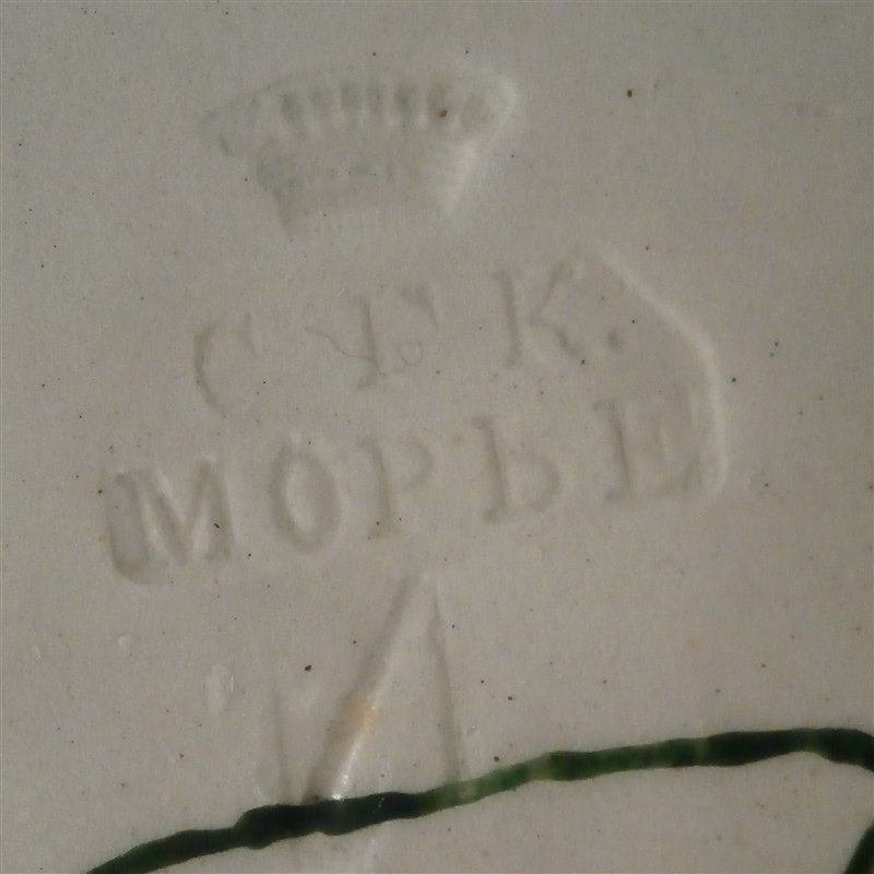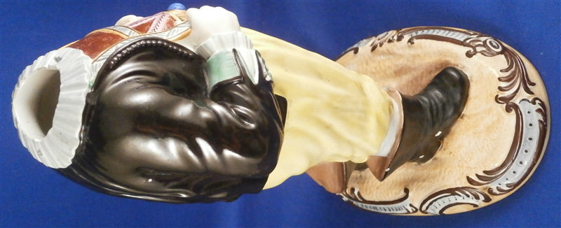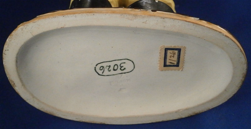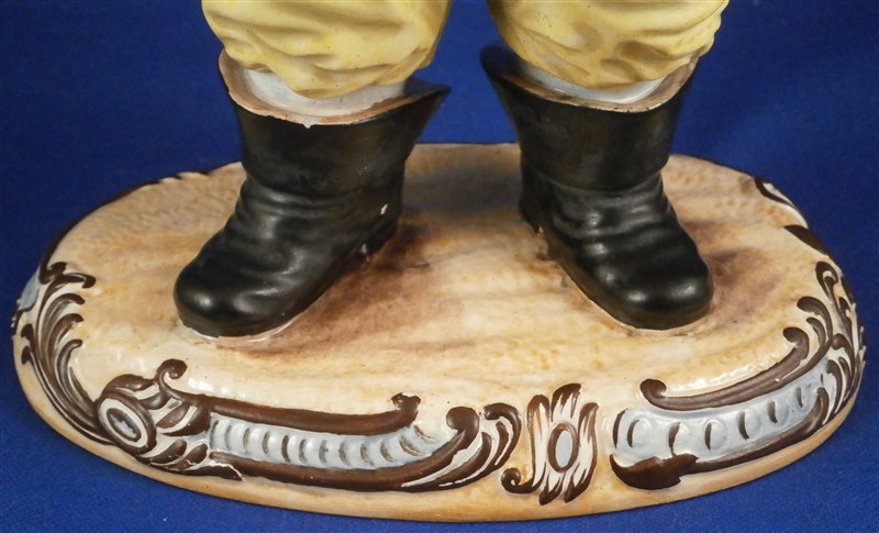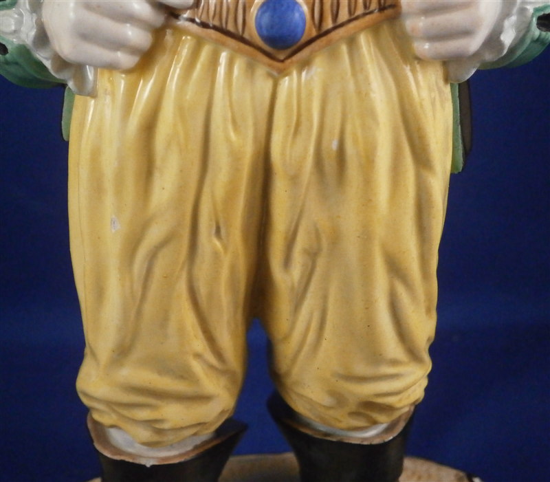 This is a the body of a nodder figurine made by the Russian maker Golenischev - Kutuzov around 1850. A very rare piece made of fine stoneware I believe and modeled after the Meissen figurine of the Hofnarr Fröhlich aka Court Jester Froehlich . He is standing on a base with some scroll work all around and has his hands around his supenders - his usual position. The body is in great condition with a few minor chips to his boots but sadly the head is missing. Can be fixed since one knows what it should look like :) I might do that some day but for now I wanted an example with the mark for the site as a reference for everyone. The figure is marked underneath as shown. The first line of three letters stand for the initials of the Countess S.A. Golenisheva-Kutuzova the founder of the factory I believe, the second line is the name of the village where the factory was Mor'e. The crown I would assume is also linked to the Countess and no idea what the last line of the single letter means. Definitely a very rare piece from a rare maker. The piece is 6.25 inches tall, 5 inches wide and 3.25 inches deep. Please email me for more information or other pictures.