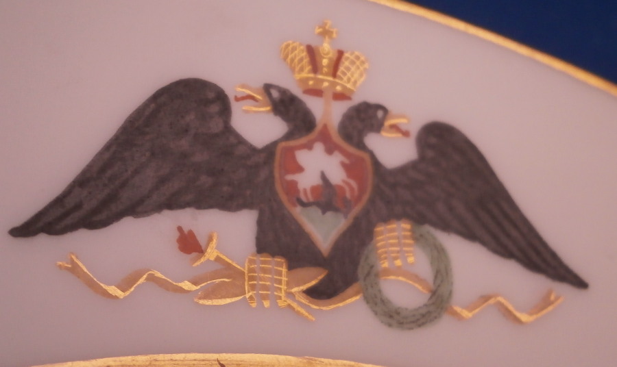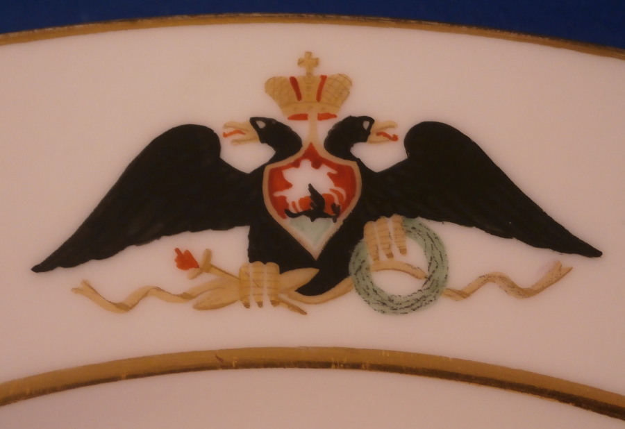 This is a porcelain plate from the Gatchina Palace Service made by the famous St. Petersburg factory during the reign of Nicholas II in 1896. This service with a version of the double headed eagle coat of arms was ordered in 1820 & described in archival inventories as the “Service with the Coat-of-Arms & a Gold Band”. It was eventually transferred to Gatchina Palace for use there in about 1855 and since has been known as the Gatchina Service. The palace served as the primary residence for the Imperial family during the reign of Emperor Alexander III (r. 1881-1894) & for his widow, Dowager Empress Maria Feodorovna, thereafter. The service received frequent use & additions were ordered once again during the reign of Nicholas II (1894-1917) of which this is one plate. It is fairly simple compared to some of the other services I have seen but still very nice. Decorated with a variant of their coat of arms frequently used in the period of Alexander I (1801-1825), with the Imperial double-headed eagle with down turned wings & the shield of St. George on its chest & with a laurel wreath & torch held in its talons. Two gold rings around the rim to give it a bit more flair. The plate is in perfect condition with a bit of wear to the gilding along the edge. It is marked with the under glaze green N II mark under the crown with the year mark of 1896 underneath as shown and a green dot along the edge common to the authentic pieces and still a mystery as to why they are there. The plate is 1.125 inches tall and 8.625 inches in diameter. I have three others from this set I also addes to the site. Please email me for more information or other pictures.