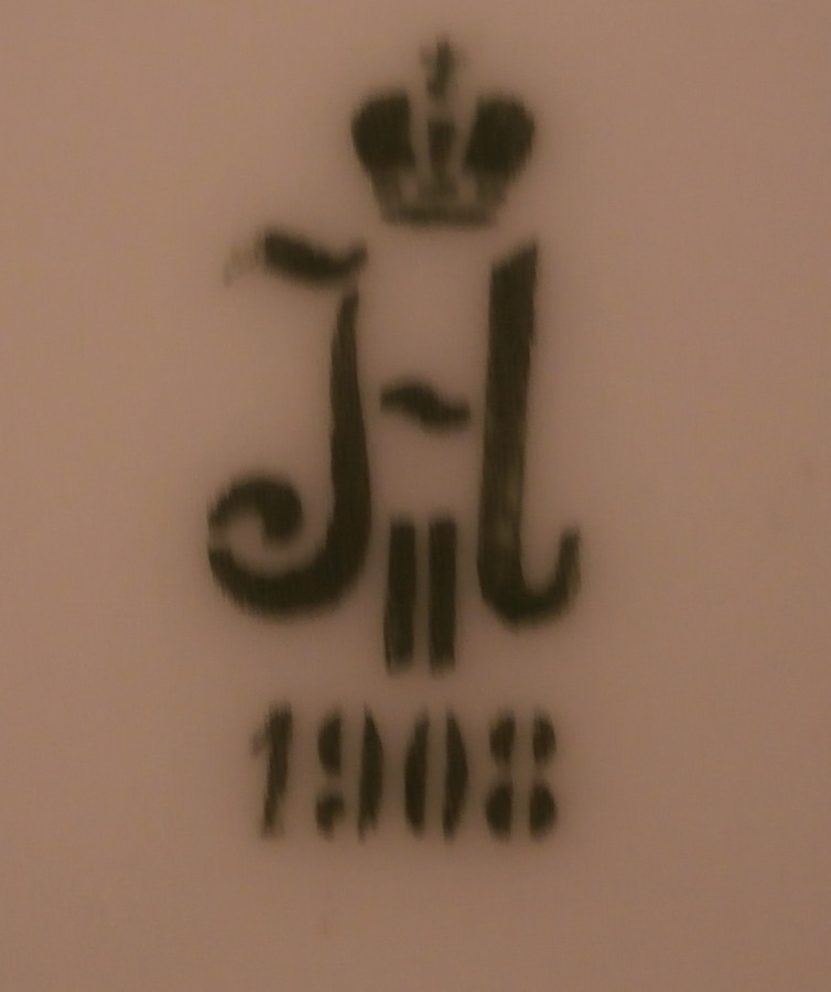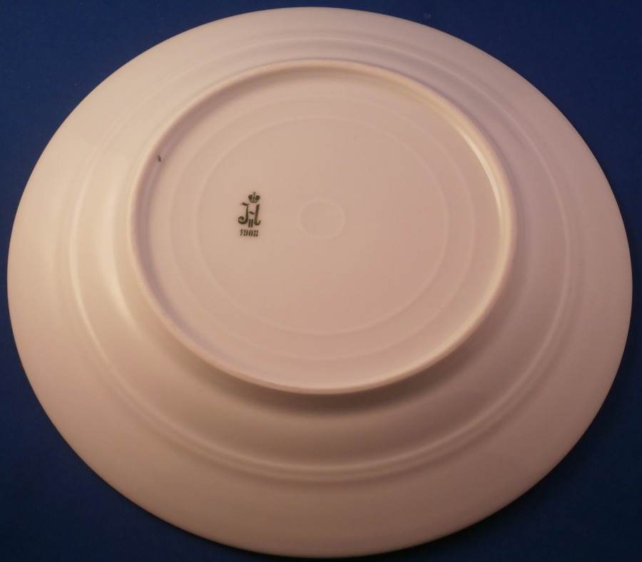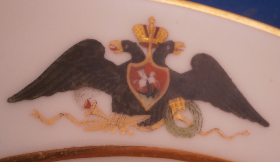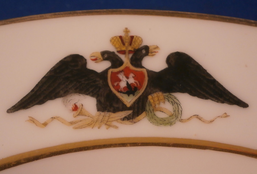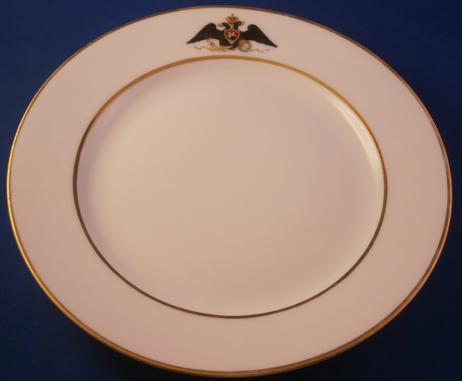 This is a porcelain plate from the Gatchina Palace Service made by the famous St. Petersburg factory during the reign of Nicholas II in 1908. This service with a version of the double headed eagle coat of arms was ordered in 1820 & described in archival inventories as the “Service with the Coat-of-Arms & a Gold Band”. It was eventually transferred to Gatchina Palace for use there in about 1855 and since has been known as the Gatchina Service. The palace served as the primary residence for the Imperial family during the reign of Emperor Alexander III (r. 1881-1894) & for his widow, Dowager Empress Maria Feodorovna, thereafter. The service received frequent use & additions were ordered once again during the reign of Nicholas II (1894-1917) of which this is one plate. It is fairly simple compared to some of the other services I have seen but still very nice. Decorated with a variant of their coat of arms frequently used in the period of Alexander I (1801-1825), with the Imperial double-headed eagle with down turned wings & the shield of St. George on its chest & with a laurel wreath & torch held in its talons. Two gold rings around the rim to give it a bit more flair. The plate is in perfect condition with a bit of wear to the gilding along the edge. It is marked with the under glaze green N II mark under the crown with the year mark of 1908 underneath as shown and a green dot along the edge common to the authentic pieces and still a mystery as to why they are there. The plate is 1 inch tall and 8.625 inches in diameter. I have three others from this set I also addes to the site. Please email me for more information or other pictures.