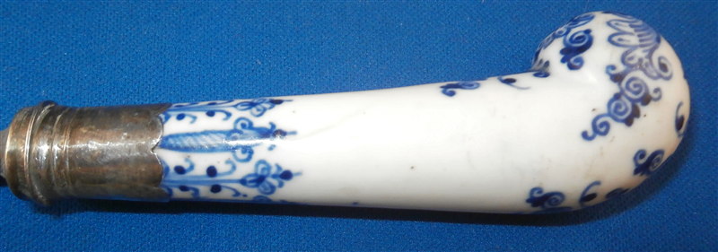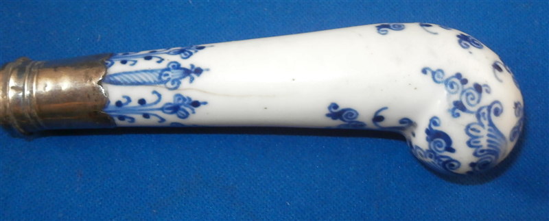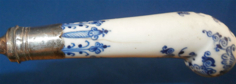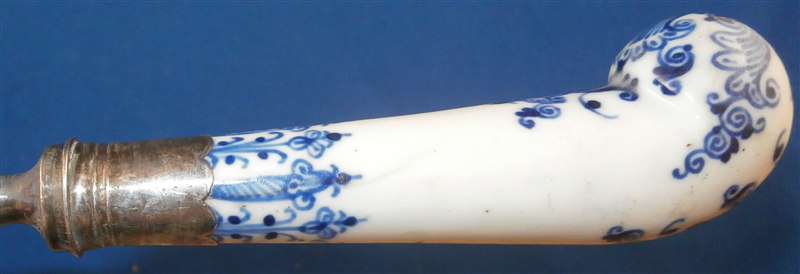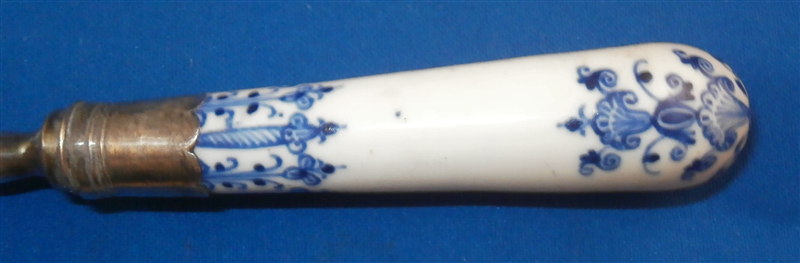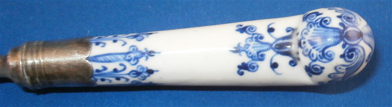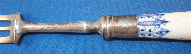 This is a rare fork with the handle made by St-Cloud in the first half of the 18th century. Forks are much harder to find than even knives and those are not easy to find at all either! The handle is made of a creamy colored softpaste with a nice underglaze blue decoration typical for them. The metal part is steel and the collar is made of silver. The metal prong part was probably replaced around the late 19th century (though I am not 100% sure) which was a common practise since the original iron pieces got very rusty and fell apart. The piece is in good condition with two stable hairlines to the handle going from the ferrule into the handle as shown and some oxidation to the metal parts which is normal and a tiny bit of wear to the glaze also common since it is softpaste. Unmarked which is always the case. The fork is 8 inches long of which the visible part of the handle is about 3 inches. Please email me for more information or other pictures.