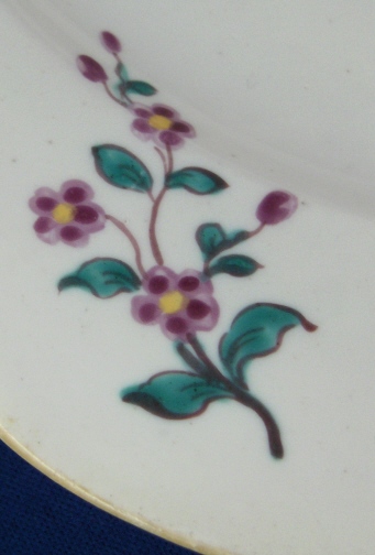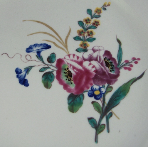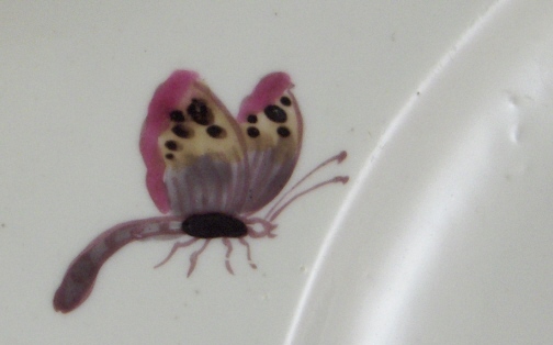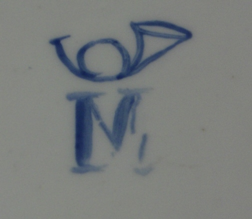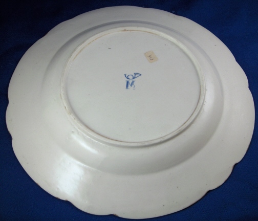 This is a plate made by Chantilly in the 18th century. It is made of soft paste porcelain and painted with a nice floral arrangement in the center as well as two smaller flowers and two bugs on the rim. The nicely shaped edge has a greenish yellow trim. The plate is in superb condition. It is marked underneath with the blue hunting horn mark as well as the letter M and an incised script B or something along those lines. It is 9.375 inches in diameter and 1 inch tall. Please email me for more information or other pictures.