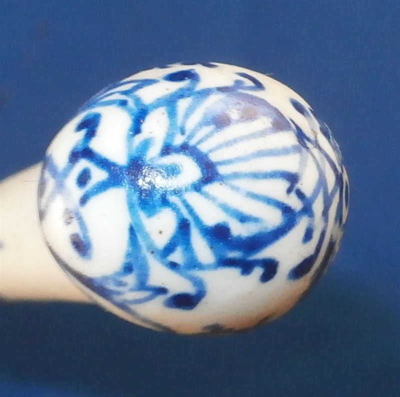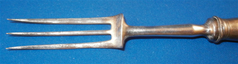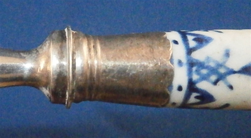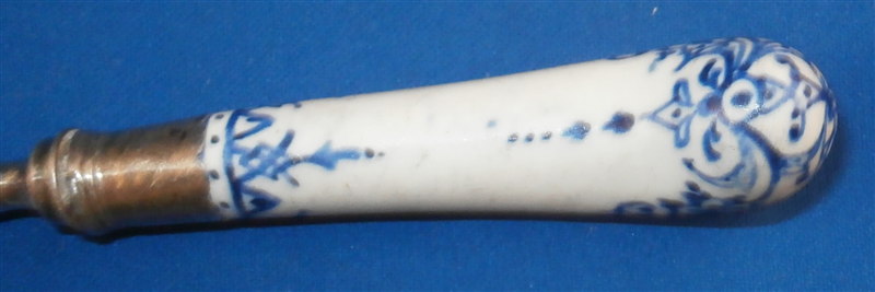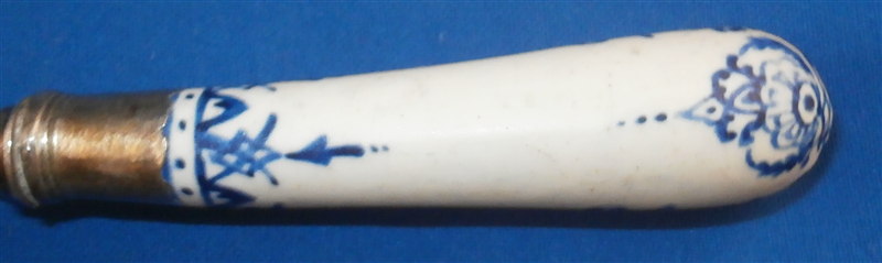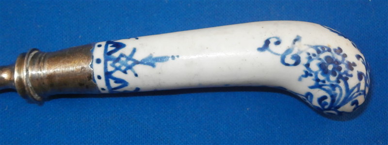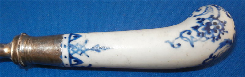 This is a very rare fork with the handle made by St-Cloud or as a knowledgable collector suggested Bow in the 18th century. They look more Saint CLoud to me but what do I know :) Forks are much harder to find than even knives and those are not easy to find at all either! The handle is made of a creamy colored softpaste with a nice underglaze blue decoration typical for them. The metal part is steel and the collar is made of silver. The metal prong part was probably replaced around the late 19th century (though I am not 100% sure) which was a common practise since the original iron pieces got very rusty and fell apart. The piece is in perfect condition with some oxidation to the metal parts which is normal and a tiny bit of wear to the glaze also common since it is softpaste. Unmarked which is always the case. The fork is 7.875 inches long of which the visible part of the handle is about 2.875 inches. Please email me for more information or other pictures.