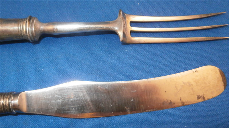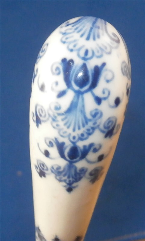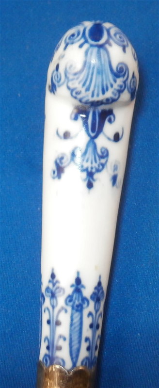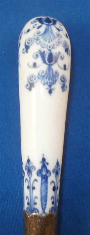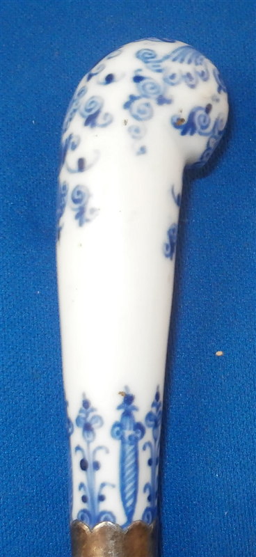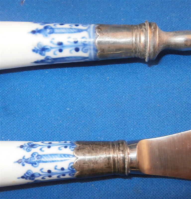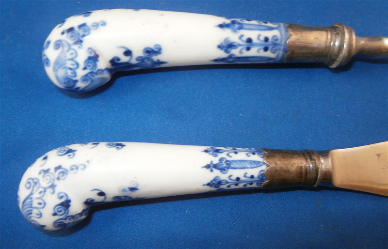 This is a very rare matching knife and fork pair where the handle is made of St-Cloud porcelain in the first half of the 18th century. I don't think I have ever come across a matching set as even the single pieces in good condition are hard to find. The handle is made of a creamy colored softpaste with a nice underglaze blue decoration typical for them. The metal part is steel and the collar is made of silver. The metal parts were replaced around the late 19th century which was a common practise since the original iron pieces got very rusty and fell apart. The set is in perfect condition with some oxidation to the metal parts which is normal and a tiny bit of wear to the glaze also common since it is softpaste. Unmarked which is always the case but the replacement blade of the knife is marked H&H Hurst Brighton. The fork is 8 inches long of which the visible part of the handle is about 2.875 inches. The knife is 8 inches long of which the visible part of the handle is about 2.875 inches. Please email me for more information or other pictures.