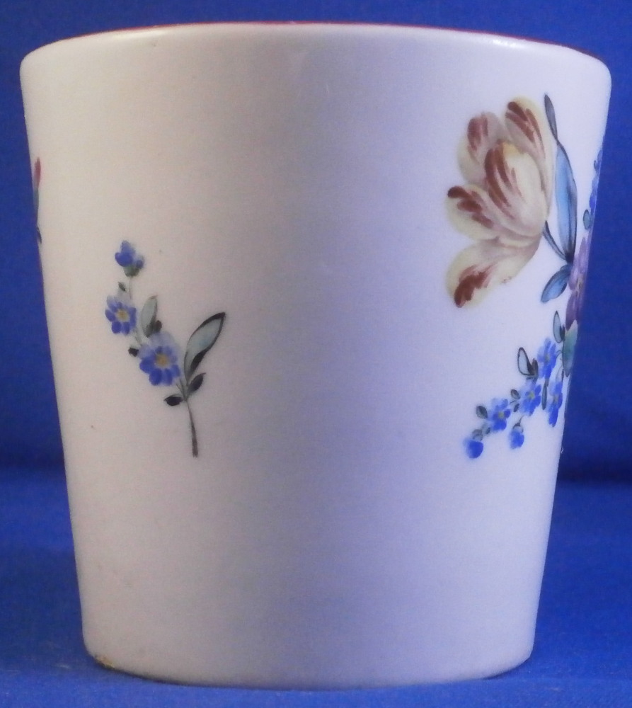 This is a rare cup made by Sceaux in the 18th century. A rare maker to find anything by so a missing saucer I could live with :) A faience factory was founded in Sceaux by von de Bey and Jacques Chapelle which probably started to produce soft paste porcelain around 1763 when Joseph Jullien and Charles-Symphorien Jacques bought the factory and managed to get the Duke of Penthievre as a patron. Production of porcelain ceased by the end of the 18th century and is very hard to find nowadys. It often closely resembles that of Mennecy which is the case here. The cup is made of soft paste porcelain and is hand painted with a large floral arrangement to one side and two single flowers to the other. Typical handle shape with some puce trim to it as well as the top edge. The cup is in superb condition with the usual manufacturing flaws associated with these early wares the worst being some extra grit stuck to the bottom edge in one spot as shown. The piece is marked with the incised SX mark as shown. The cup measures 2.625 inches tall and 2.625 inches in diameter. Please email me for more information or other pictures.
