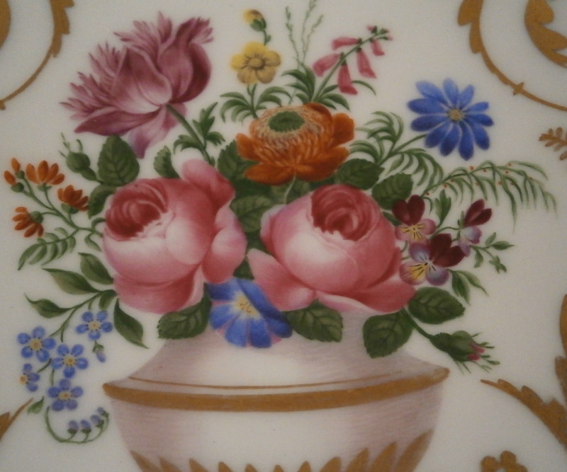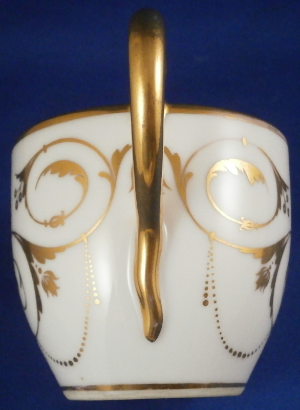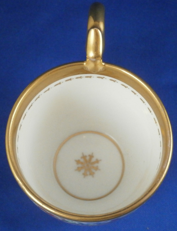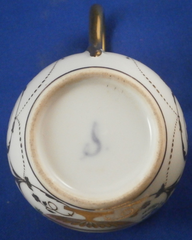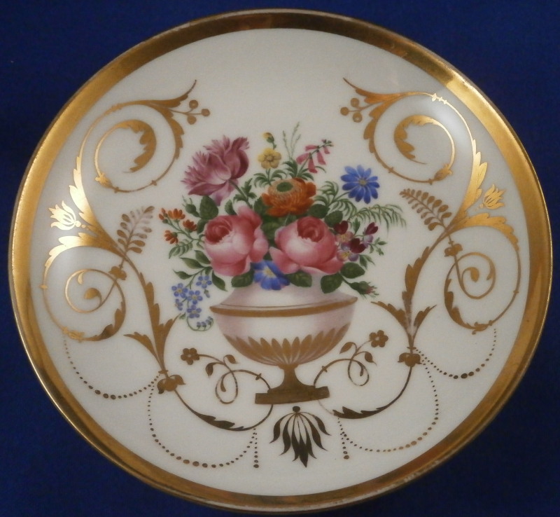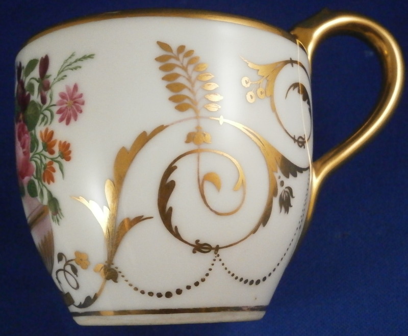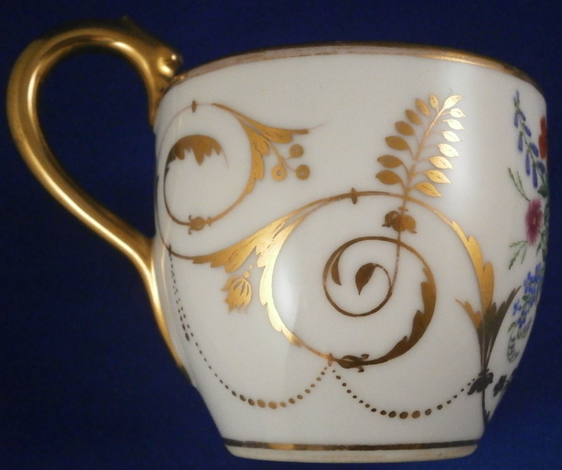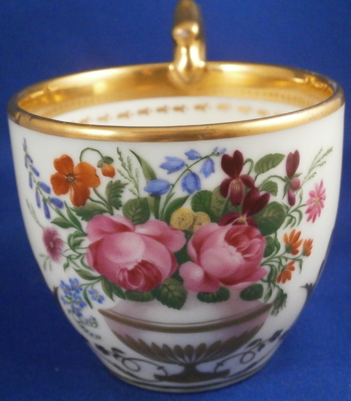 This is a really nice cup and saucer made made by Schlaggenwald in the early 19th century. Both pieces are hand painted with a superb floral arrangement coming out of a gold and pink urn / vase as well as lots of fancy gilding all around as shown. The cup has a nice snake shaped handle that is fully gilded and more gold trim to the inside of the cup as shown. One of the nicest piece I hahve ever seen by this maker! One can definitely see the French / Paris influence as well as that of Vienna on this piece. A very special set from this maker for sure. The cup and saucer are both in great condition with some minor wear to the gilding mostly to the edge of the saucer with the rest of it almost perfect in that department as well. The piece is marked with the under glaze blue script S. mark used before 1830 as well as an impressed V and another mark to the underside of the cup. The cup including the handle is 3 inches tall and 2.75 inches in diameter. The saucer is 1 inch tall and has a diameter of 3.375 inches. I also have the matching sugar dish, creamer and another cup and saucer if anyone is interested in a matching set. Please email me for more information or photos.